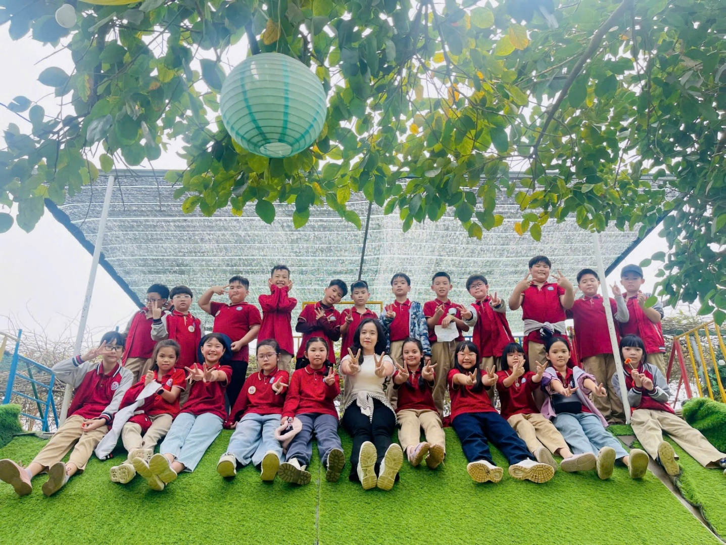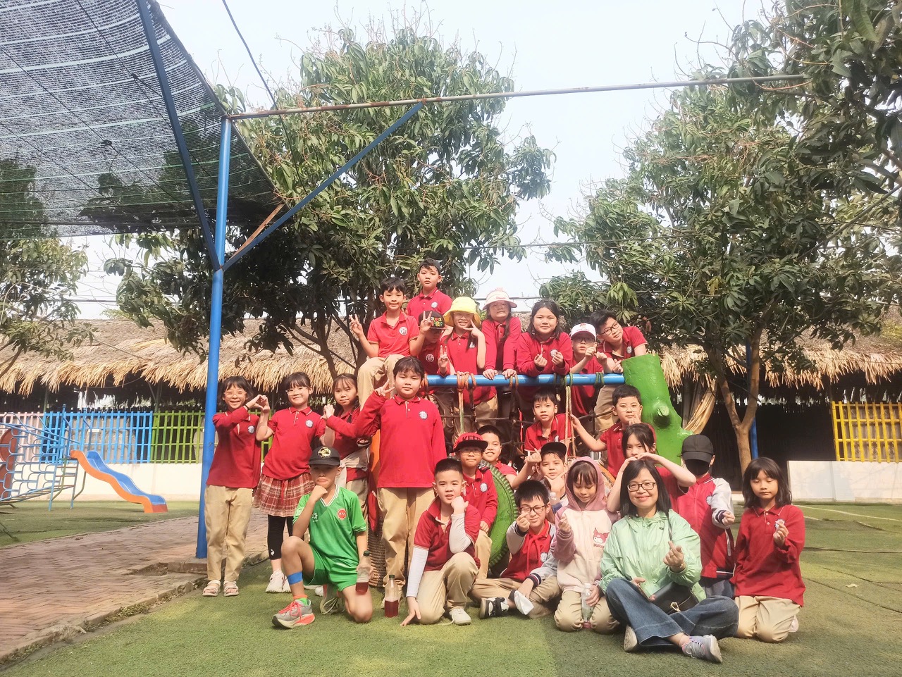 Tập thể lớp 4B chụp ảnh lưu niệm tại trang trại giáo dục Hải Đăng cùng cô giáo chủ nhiệm