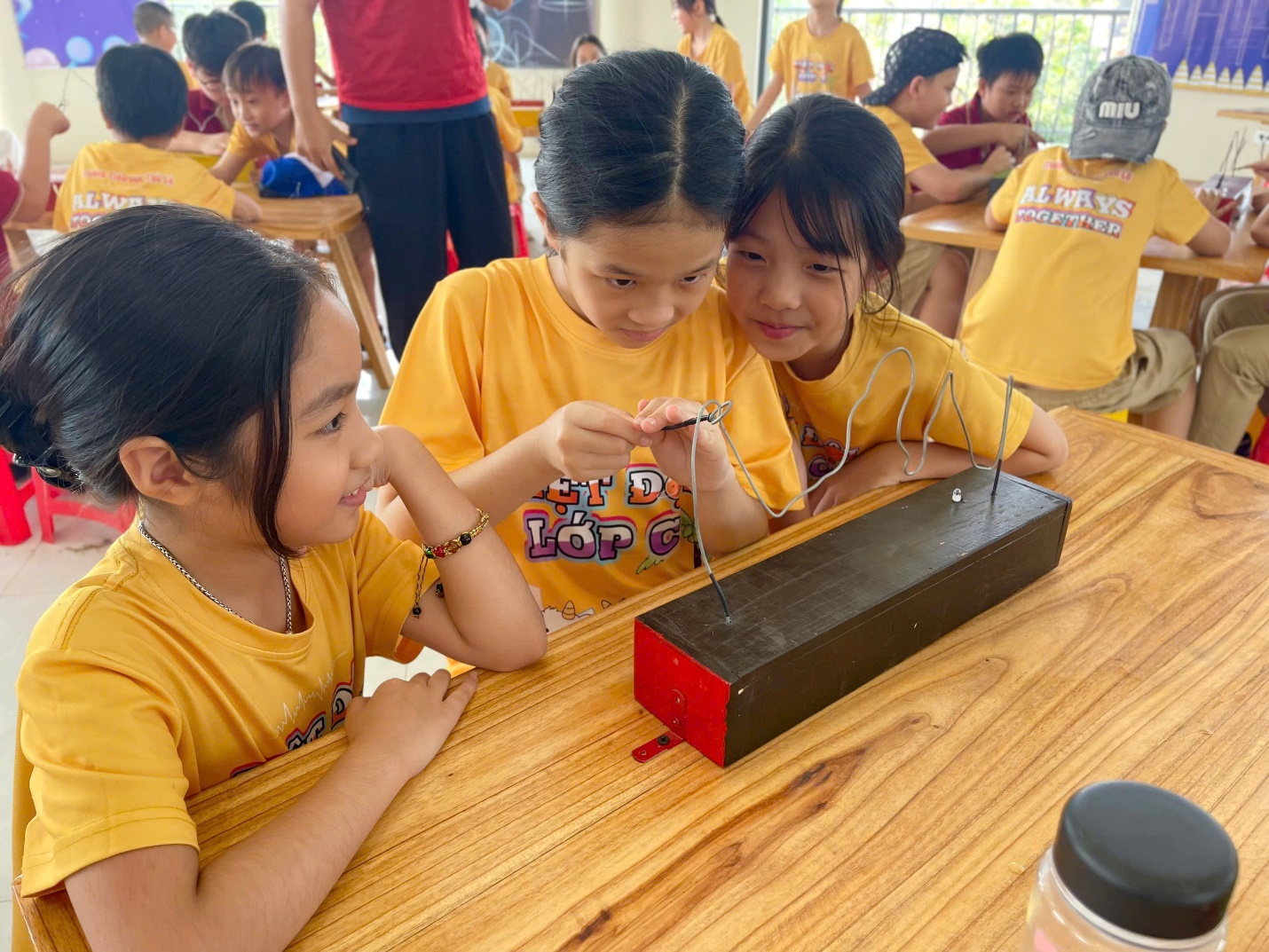 Hoạt động khoa học sáng tạo cũng là một điểm nhấn của chuyến đi. Các thí nghiệm liên quan đến điện từ và từ trường đã kích thích trí tò mò và khơi dậy niềm đam mê khám phá trong các em. Đặc biệt, các hoạt động tái chế vật dụng từ rác thải nhựa đã giúp các em hiểu thêm về trách nhiệm bảo vệ môi trường, góp phần nuôi dưỡng ý thức sống xanh từ nhỏ.