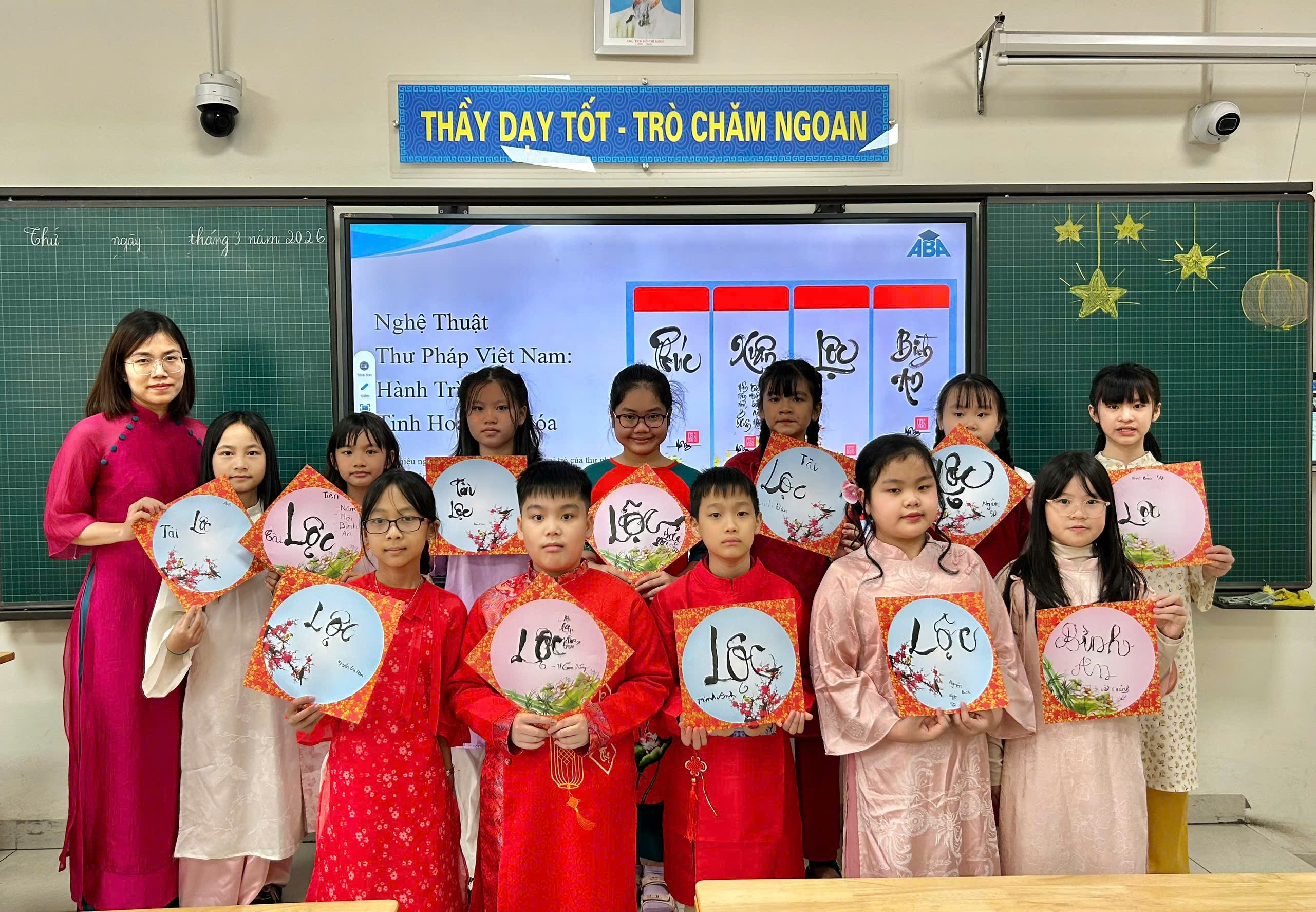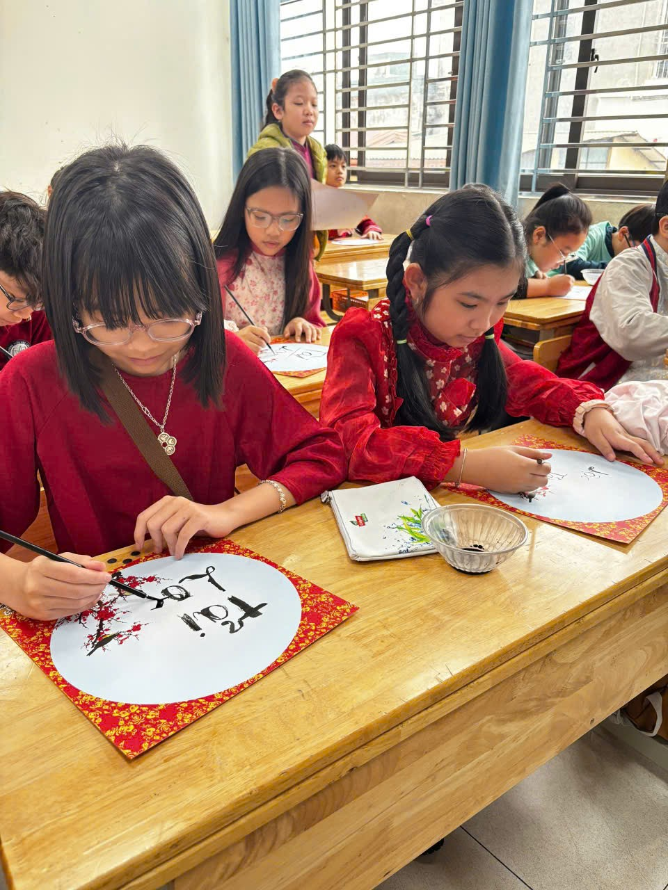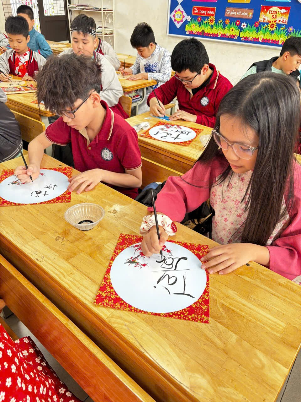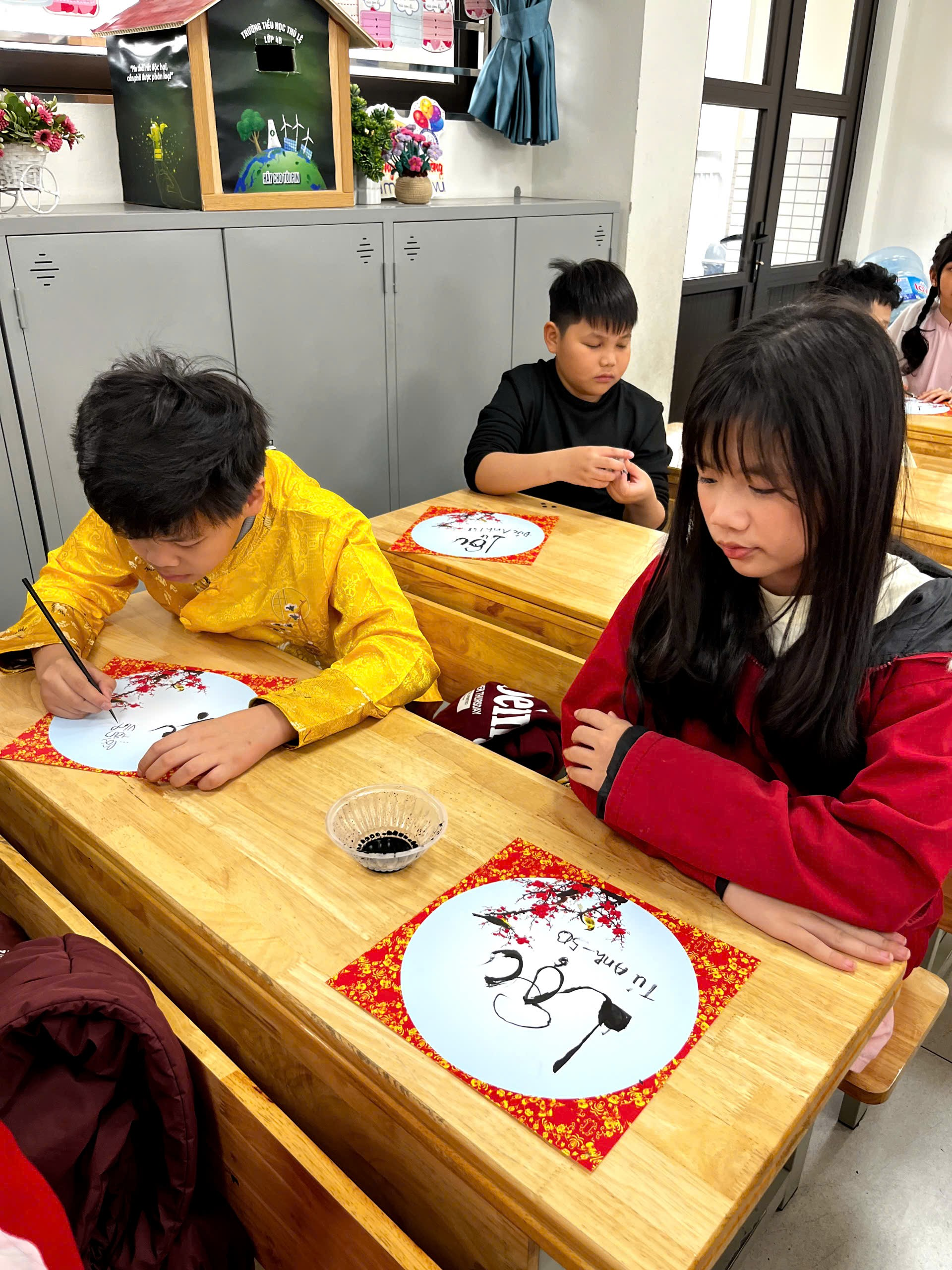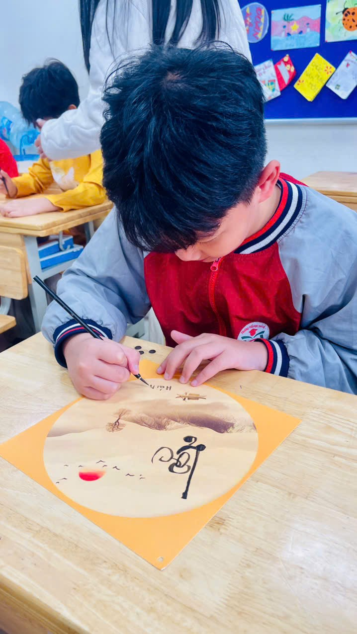 Ngay trong buổi sáng, tại chính lớp học của mình, các em được tham gia hoạt động học viết chữ thư pháp. Dưới sự hướng dẫn tận tình, các em chăm chú luyện từng nét bút, tỉ mỉ viết nên những chữ mang ý nghĩa tốt đẹp như “Phúc”, “Lộc”, “An”, “Tâm”. Những tờ giấy đỏ rực, những nét mực mềm mại cùng sự say mê của các em đã tạo nên một không gian mùa xuân thật ấm áp và đầy ý nghĩa ngay trong lớp học.