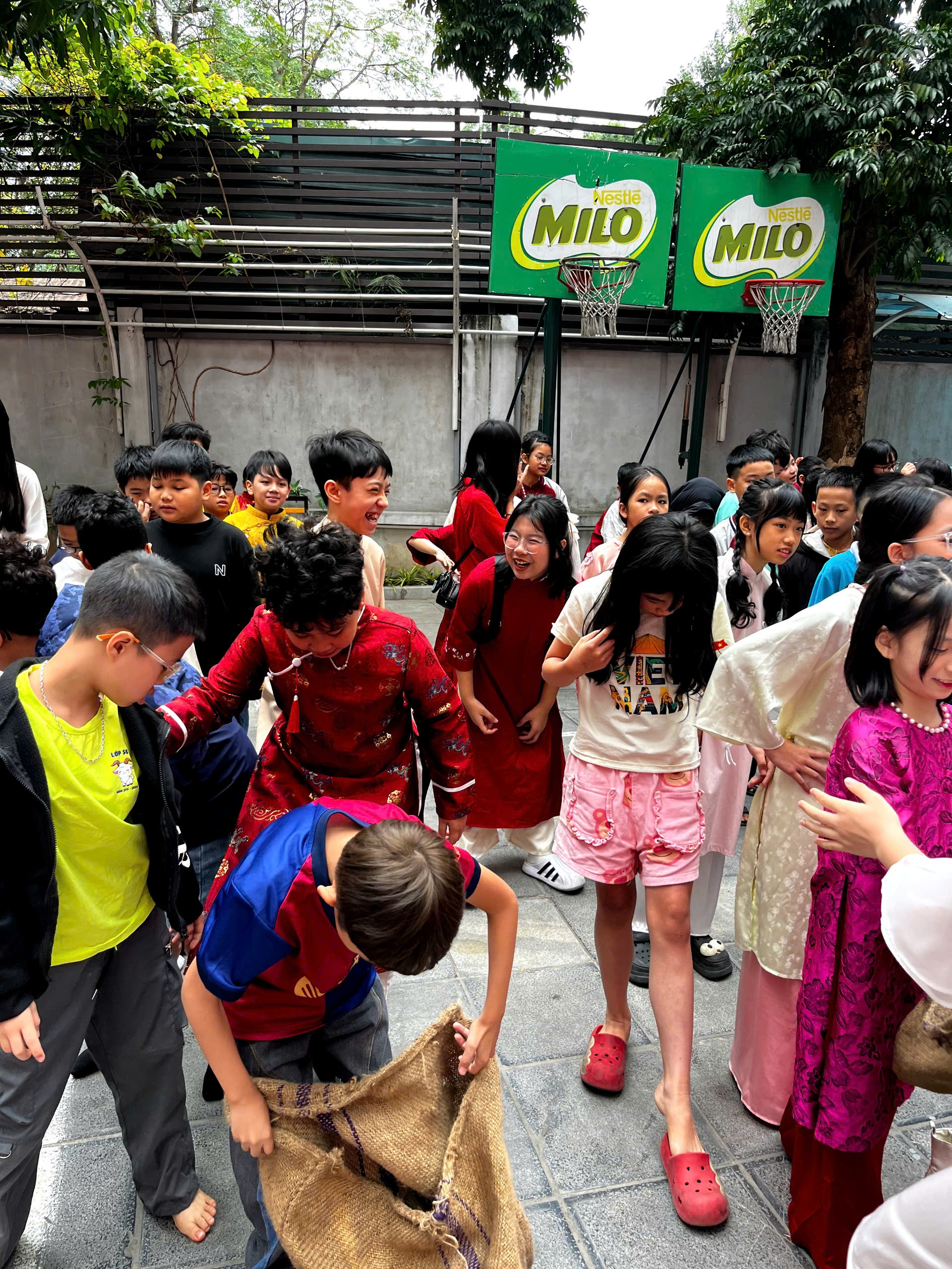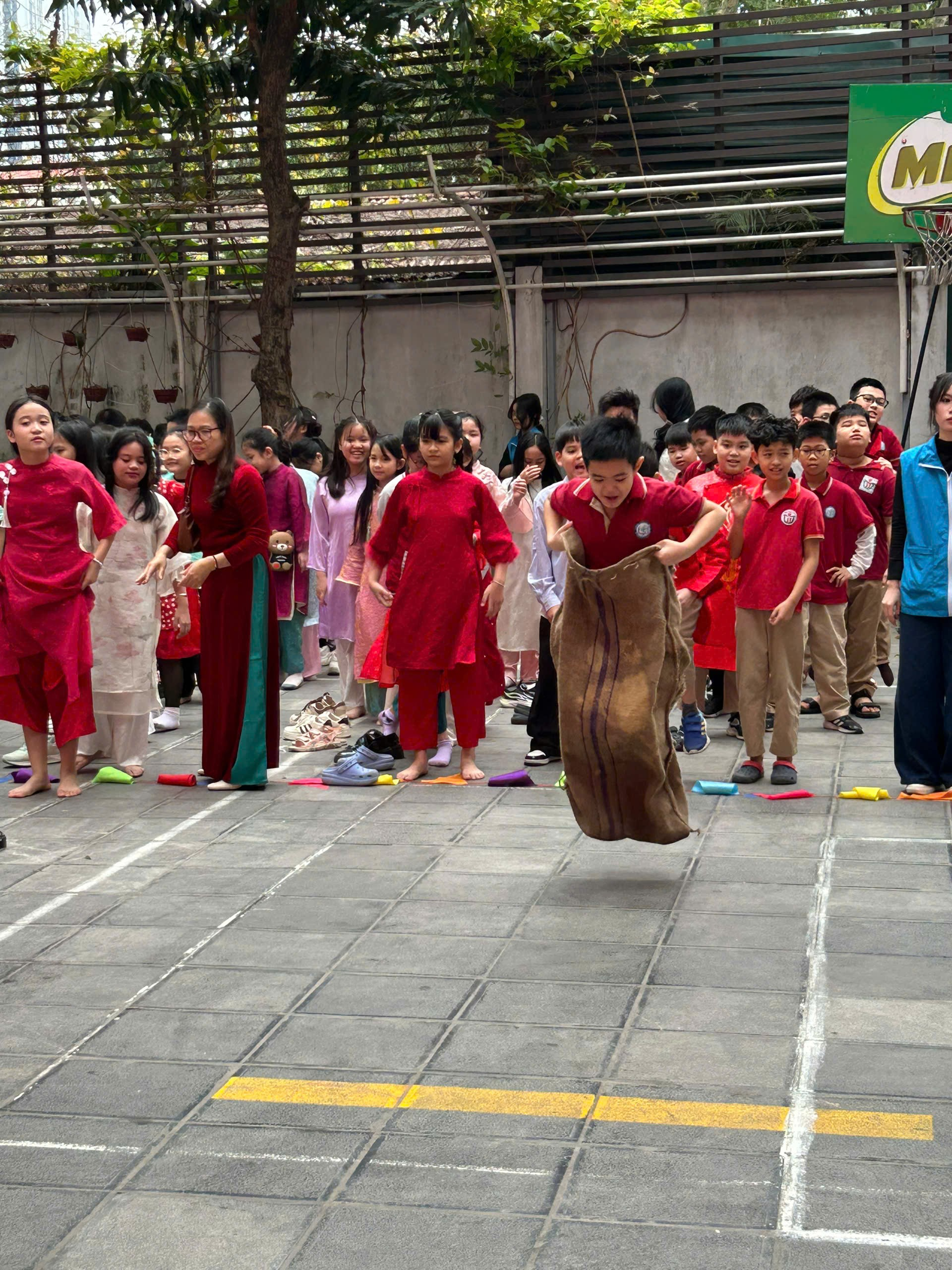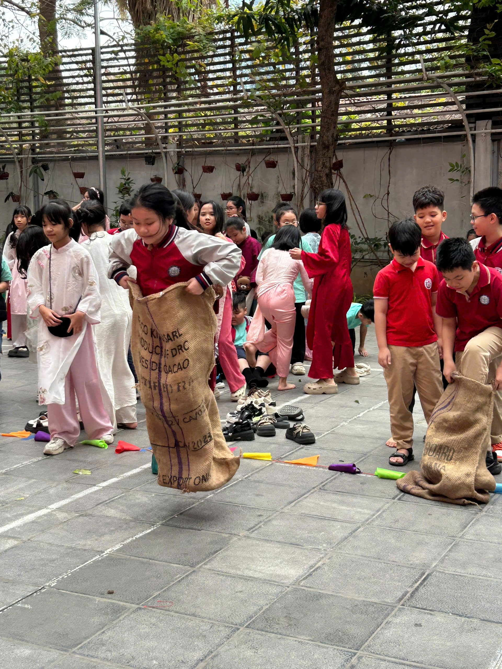 Sau đó, các em hào hứng tham gia những trò chơi dân gian quen thuộc như nhảy bao bố, đi cầu khỉ. Tiếng cười giòn tan, những tràng cổ vũ sôi nổi khiến sân trường trở thành một ngày hội tuổi thơ rực rỡ. Qua mỗi trò chơi, các em không chỉ được vận động, vui chơi mà còn rèn luyện sự khéo léo, tinh thần đoàn kết và tự tin.