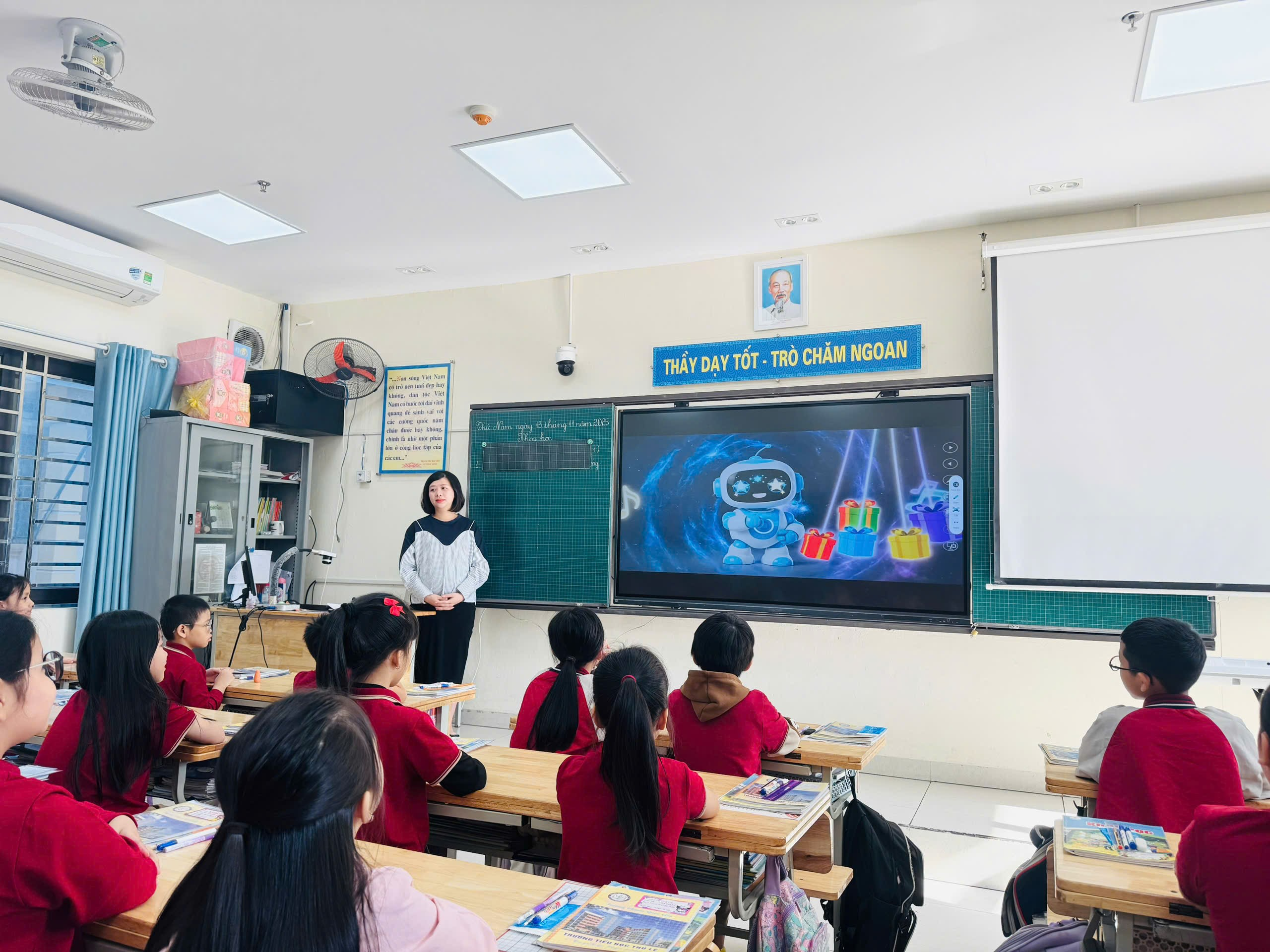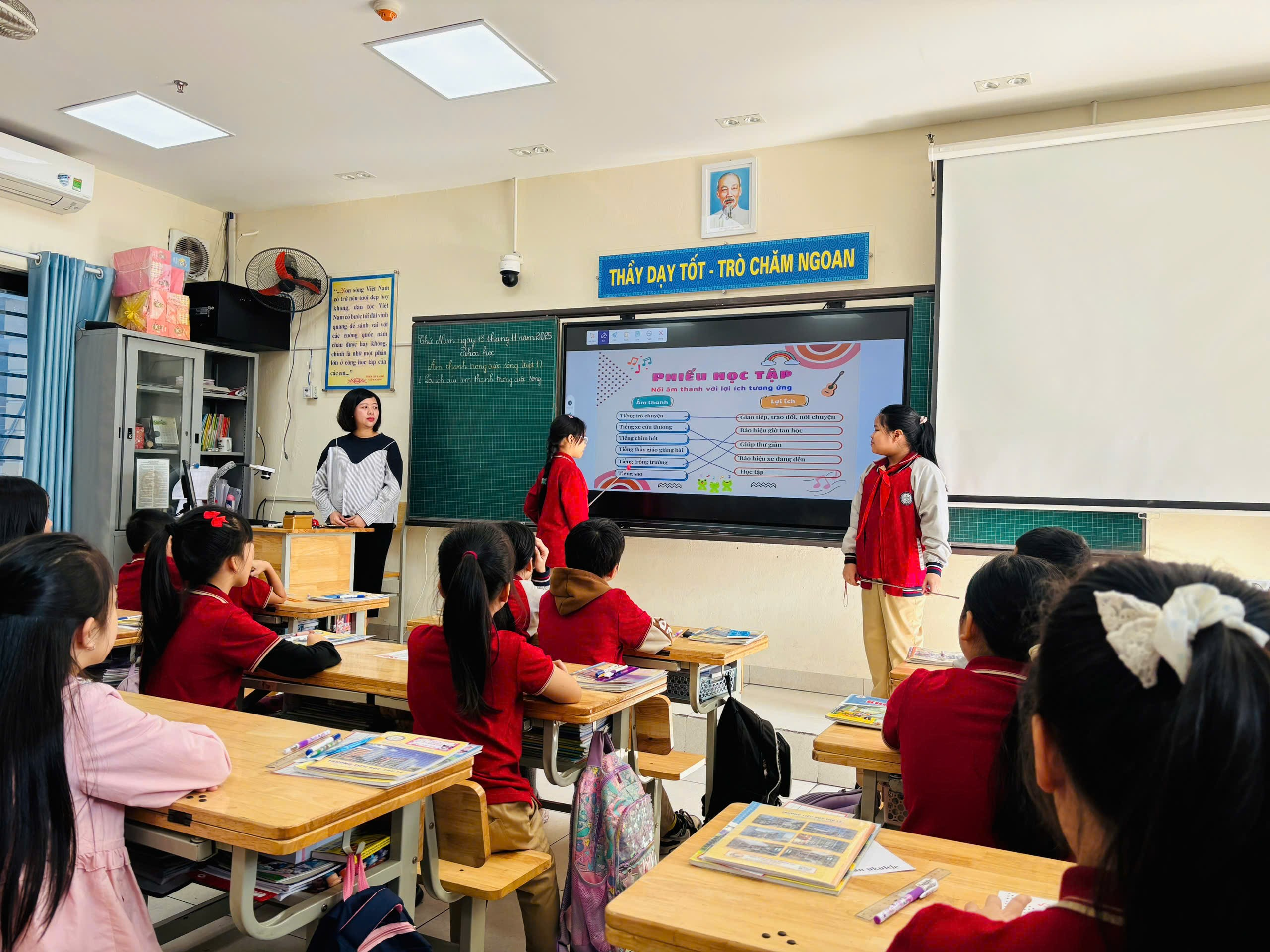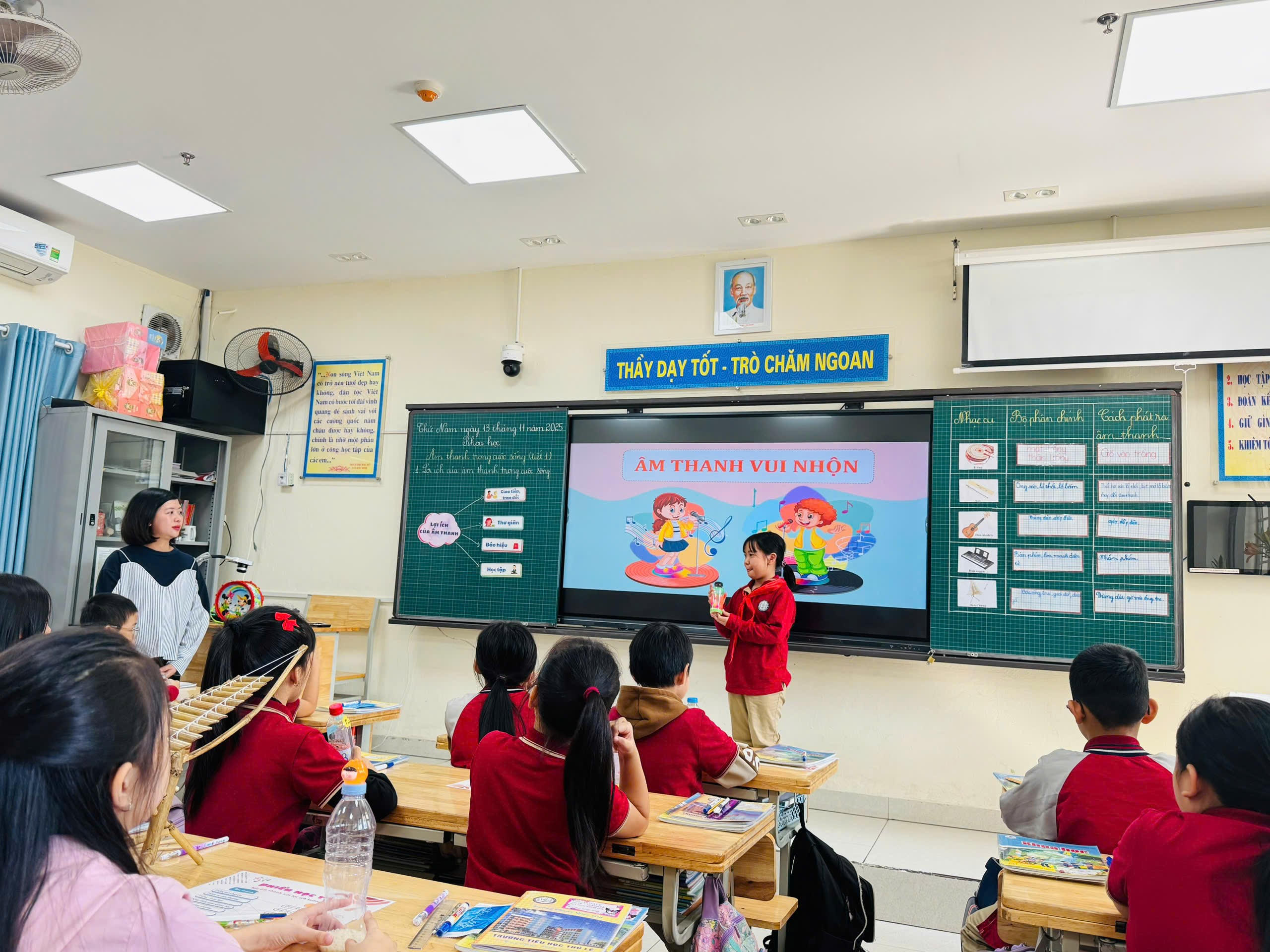 Đồng hành trong tiết học này còn có nhân vật AI “Robo Sound”, xuất hiện trên màn hình với giọng nói và chuyển động sinh động, giúp dẫn dắt nội dung bài học theo cách gần gũi và hấp dẫn. Các tranh ảnh minh họa trong SGK được cô giáo chuyển thành video trực quan, giúp học sinh quan sát và lắng nghe âm thanh một cách hiệu quả hơn.