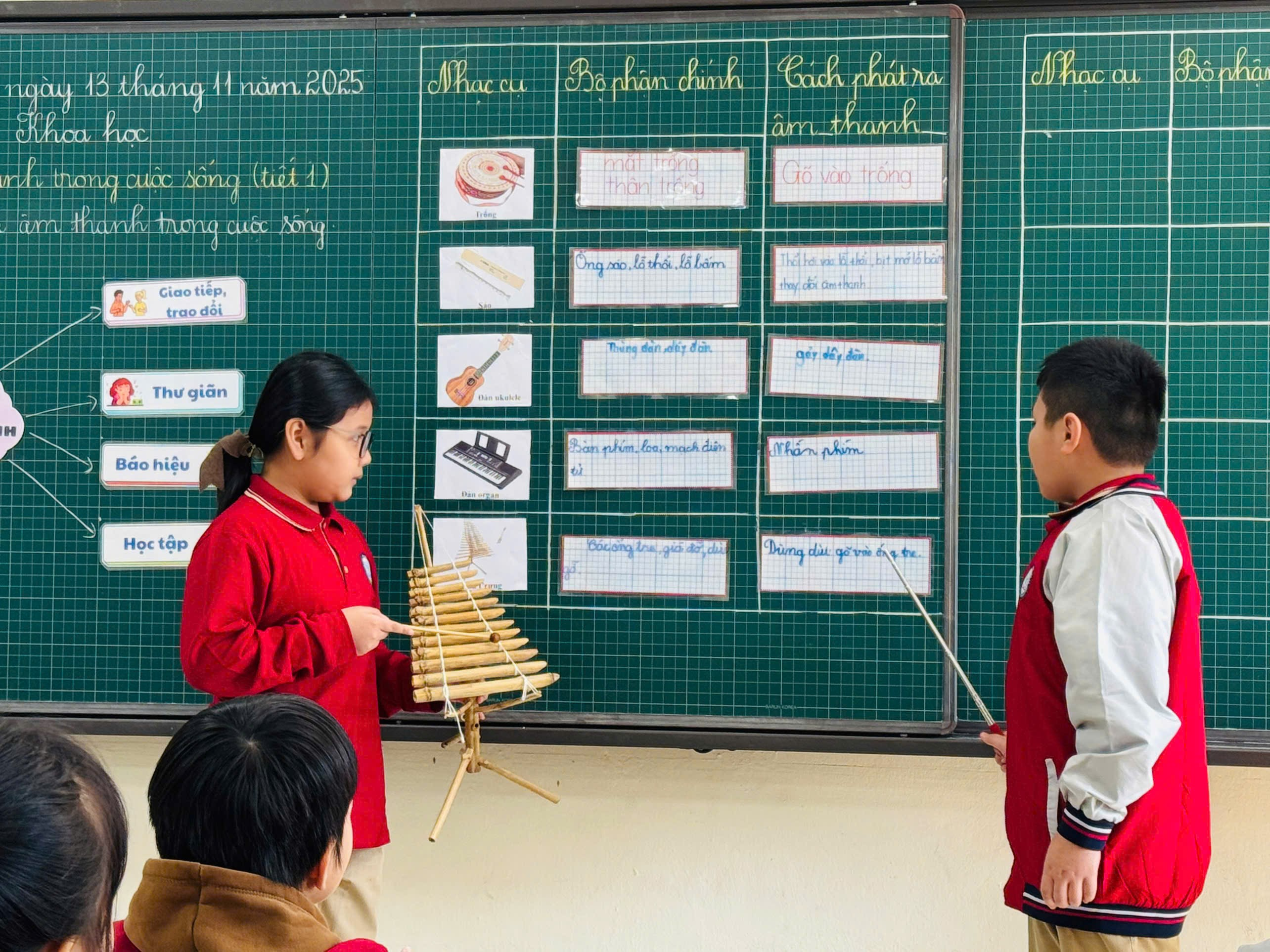 Tiết học kết thúc hoạt động “Âm thanh vui nhộn” – nơi cả lớp tạo ra một phần trình diễn “chuông gió leng keng” với những âm thanh từ nhạc cụ STEM tự chế đầy sáng tạo.