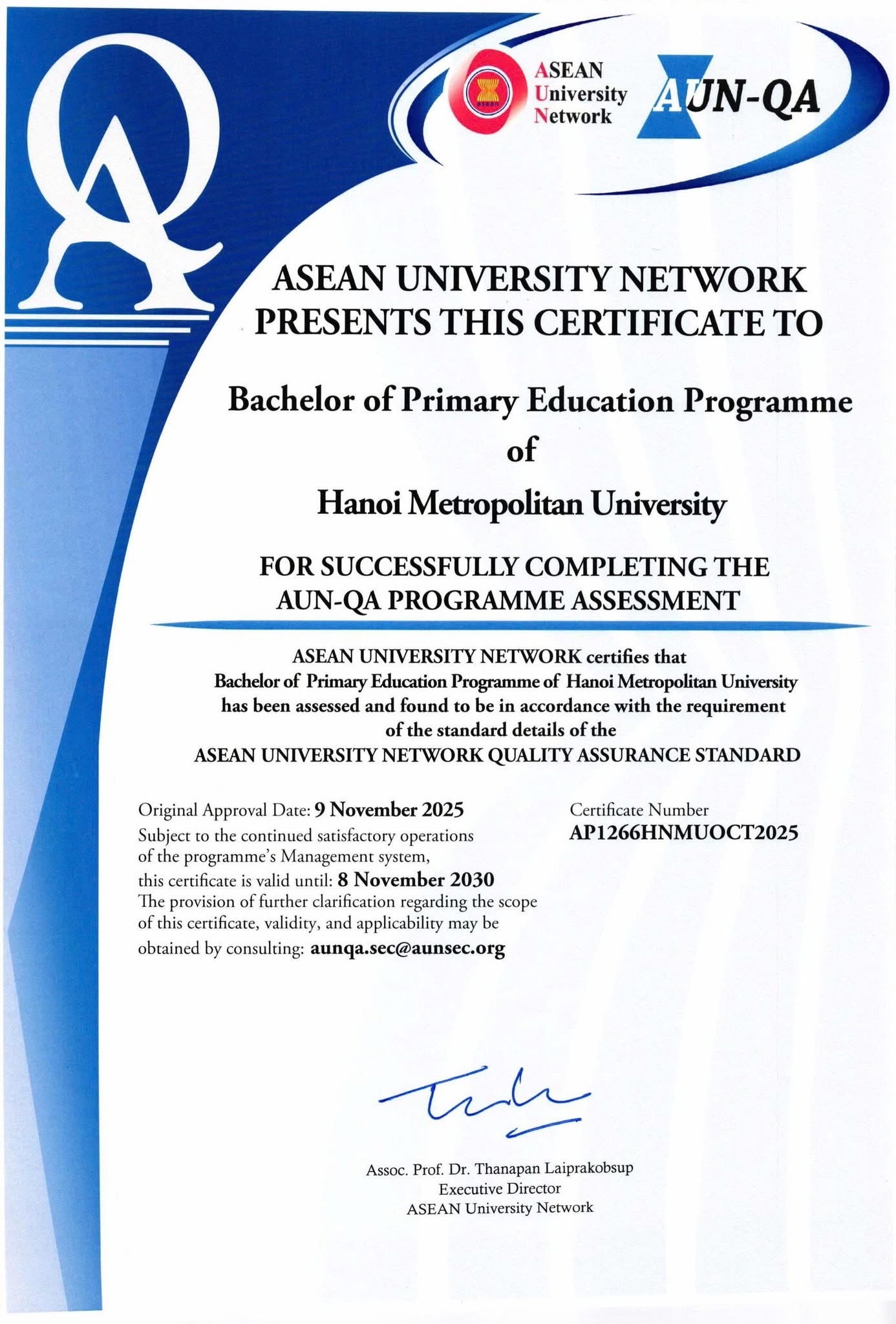 Đặc biệt, trong thời gian thực tập ngành Giáo dục Tiểu học – Trường Đại học Thủ đô Hà Nội đã vinh dự được trao Giấy chứng nhận kiểm định chất lượng theo tiêu chuẩn AUN-QA. Đây là sự ghi nhận xứng đáng cho những nỗ lực không ngừng trong công tác đào tạo, đồng thời là niềm tự hào và động lực để mỗi giáo sinh tiếp tục phấn đấu, hoàn thiện bản thân, xứng đáng với sứ mệnh của người giáo viên trong tương lai.