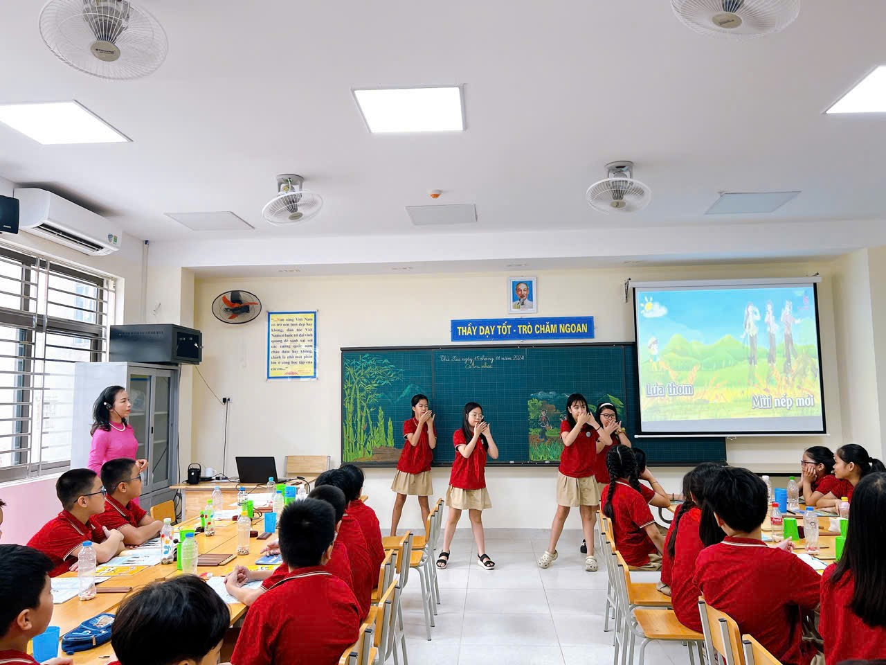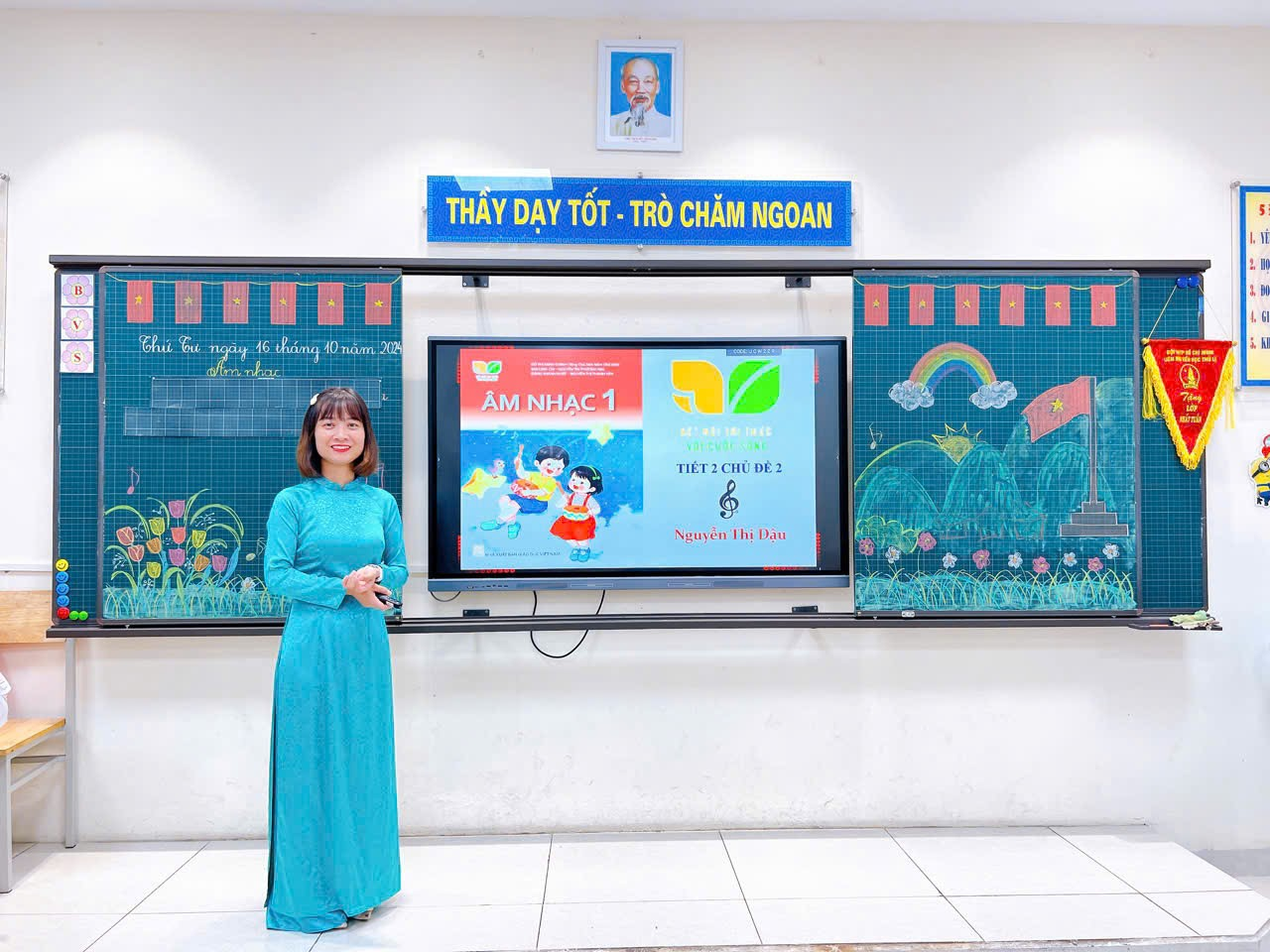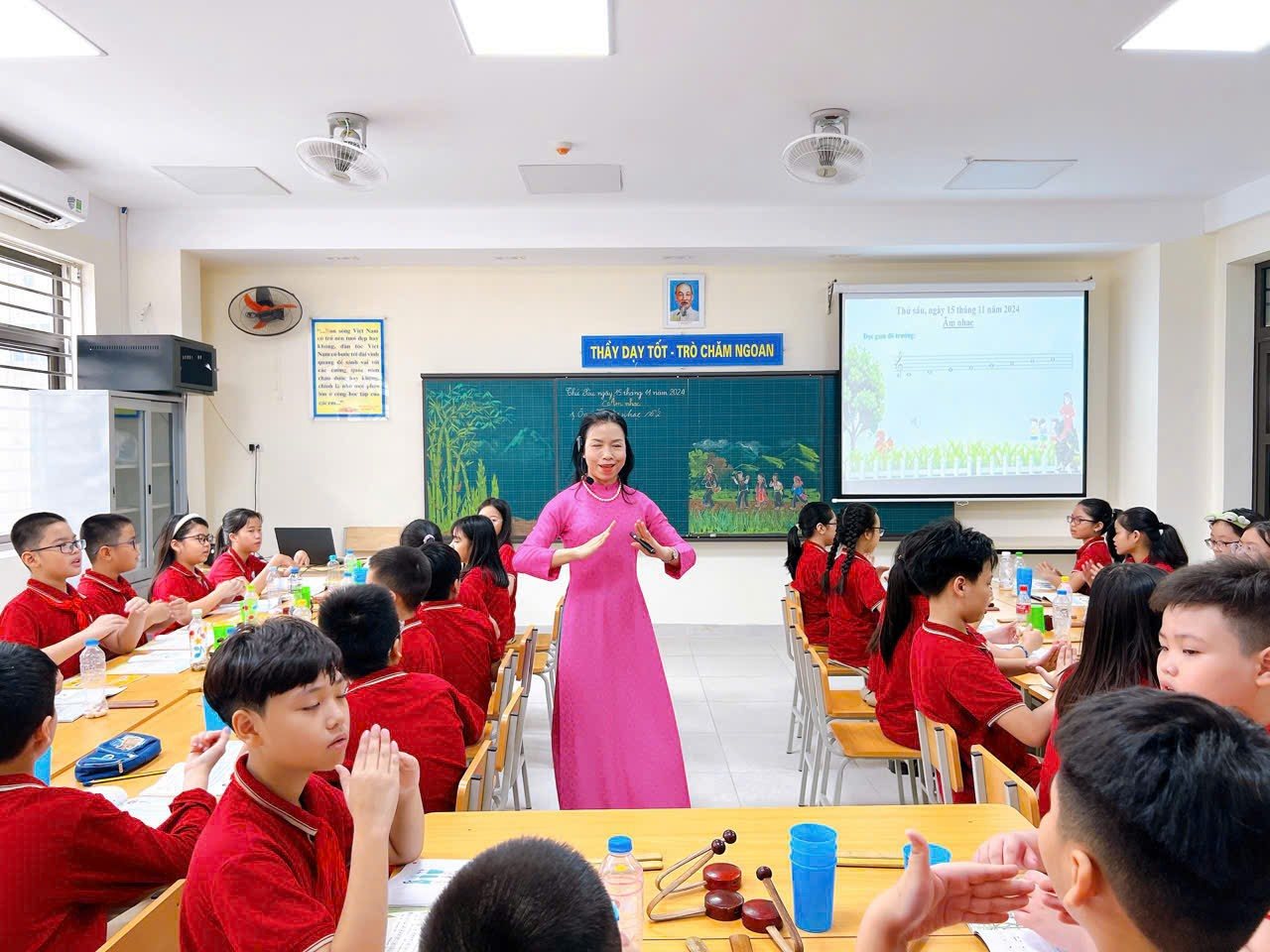 Trong tiết chuyên đề âm nhạc của cô Nguyễn Thị Lan Phương với nội dung: Hát “ Em bay vào tương lai” và tiết hội giảng của cô Nguyễn Thị Dậu : Ôn bài hát “ Tổ quốc ta” các con rất thích thú với phần khởi động hấp dẫn có nhiều hình ảnh sinh động cũng như được trải nghiệm các hoạt động thực hành sôi nổi, hào hứng với các đạo cụ tự làm. Môn Âm nhạc không giống các môn khác, nhu cầu thưởng thức, cảm thụ và hoạt động thực hành với các hình thức biểu diễn phong phú sẽ tạo hứng thú, niềm vui và kích thích tiềm năng nghệ thuật, làm giàu đẹp đời sống tinh thần cho mỗi học sinh.