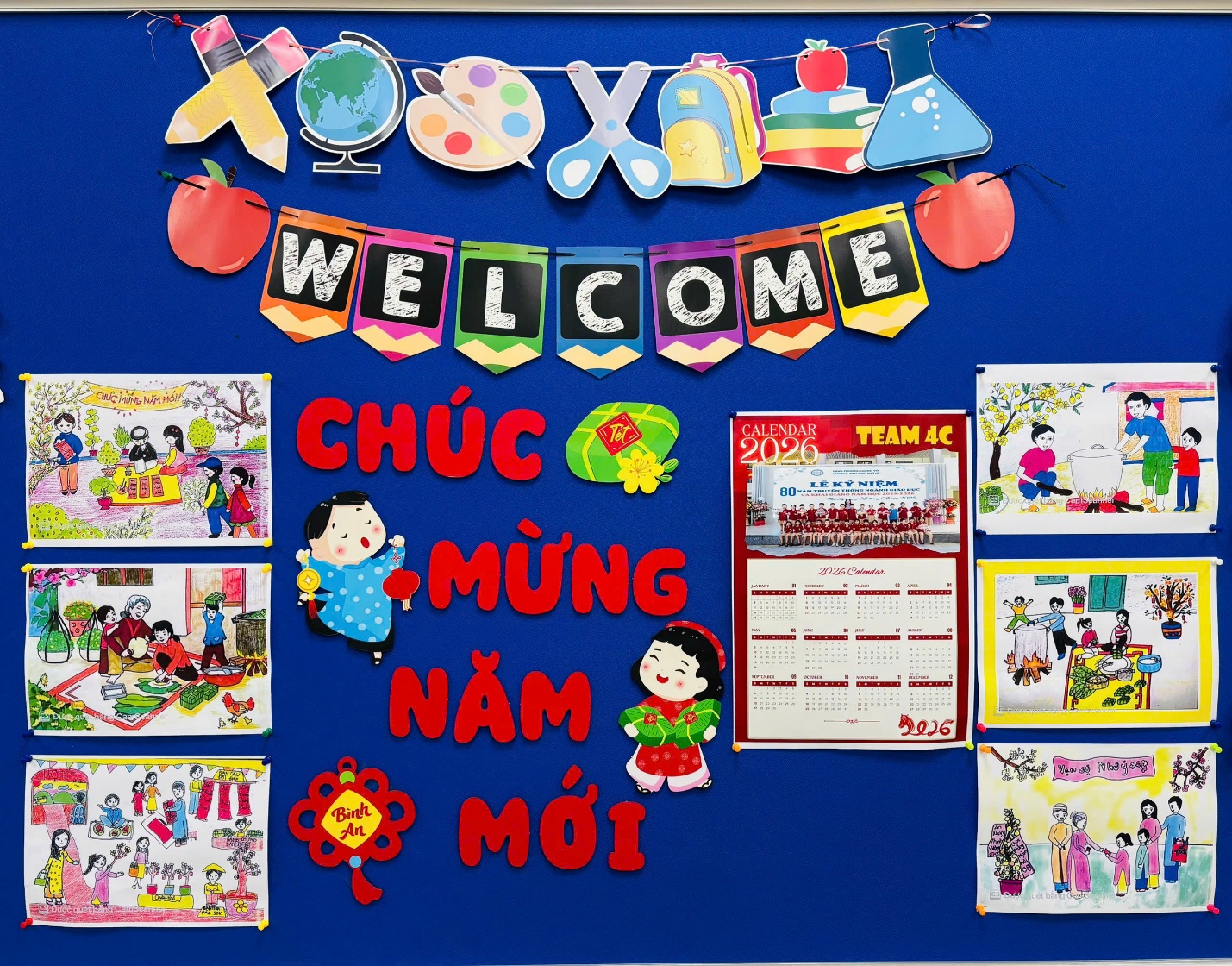 Mỗi tấm thẻ đều chứa đựng những ước mơ, mục tiêu đáng yêu và đầy quyết tâm của các bạn nhỏ. Bạn thì mong mình tự tin hơn, bạn lại muốn lan tỏa yêu thương hoặc giúp đỡ bố mẹ nhiều hơn. Không chỉ vậy, lớp 4C còn cùng nhau vẽ tranh về chủ đề ngày Tết. Những bức tranh ngập tràn sắc xuân với hoa đào, bánh chưng, câu đối đỏ và khoảnh khắc sum vầy ấm áp. Qua từng nét vẽ, tình yêu Tết truyền thống của các bạn được thể hiện thật hồn nhiên và sinh động.