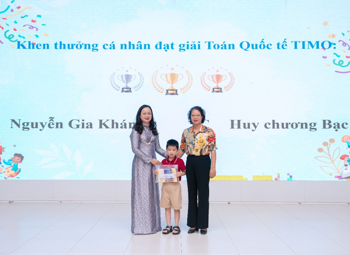 Bà Nguyễn Thị Vượng cùng cô giáo Trịnh Phương Linh trao phần thưởng cho học sinh đạt Huy chương bạc gảii Toán Quốc tế TIMO