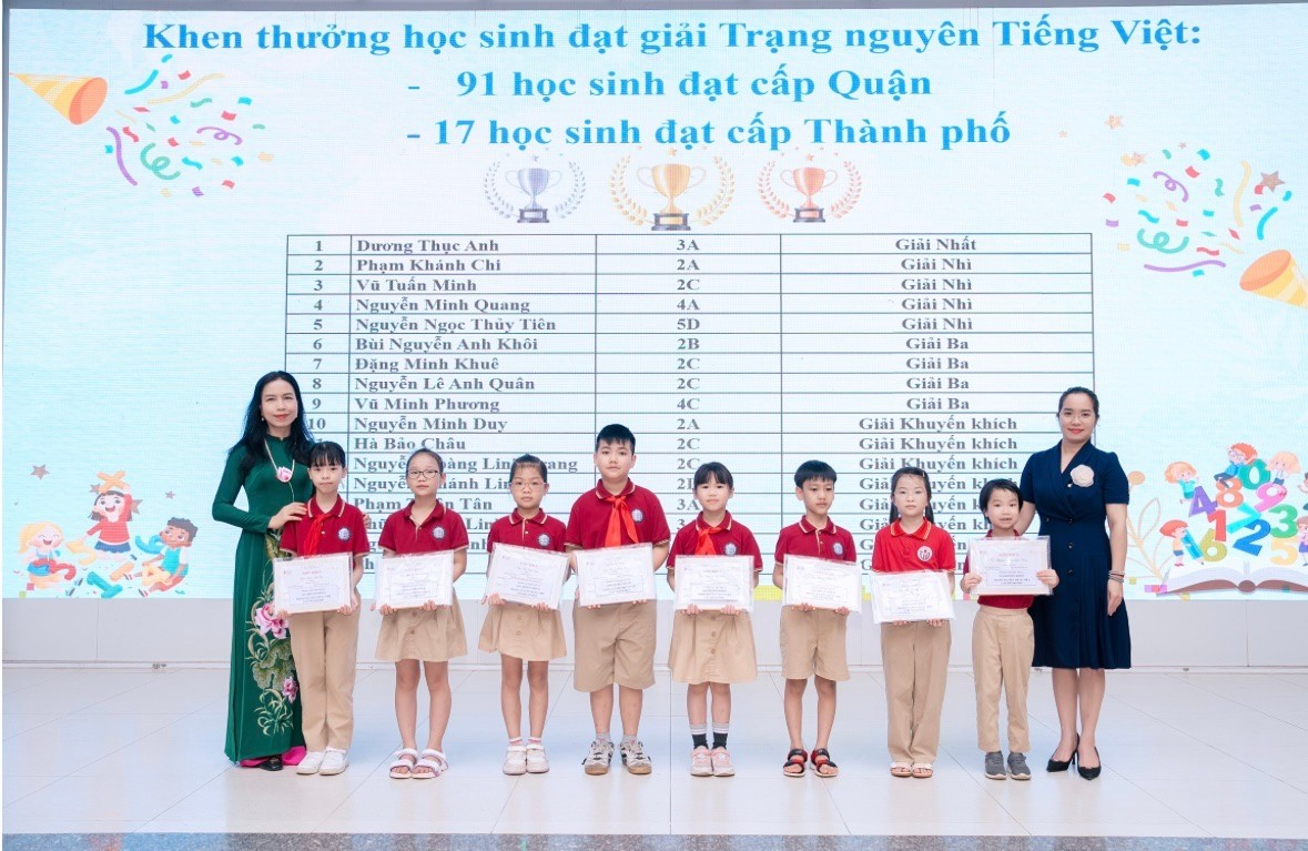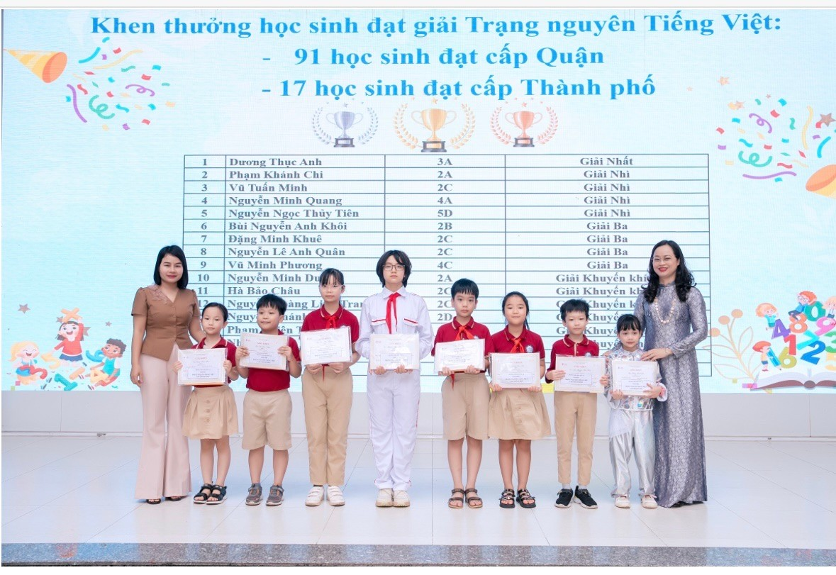 Các cô giáo cùng đại diện Trưởng ban Phụ huynh các lớp trao phần thưởng cho học sinh đạt giải cuộc thi Trạng Nguyên Tiếng Việt cấp Thành phố