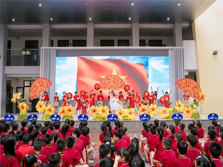 Mở đầu chương trình là tiết mục văn nghệ “Vươn cao Việt Nam” – Sáng tác Lưu Hà An do đội văn nghệ nhà trường biểu diễn.