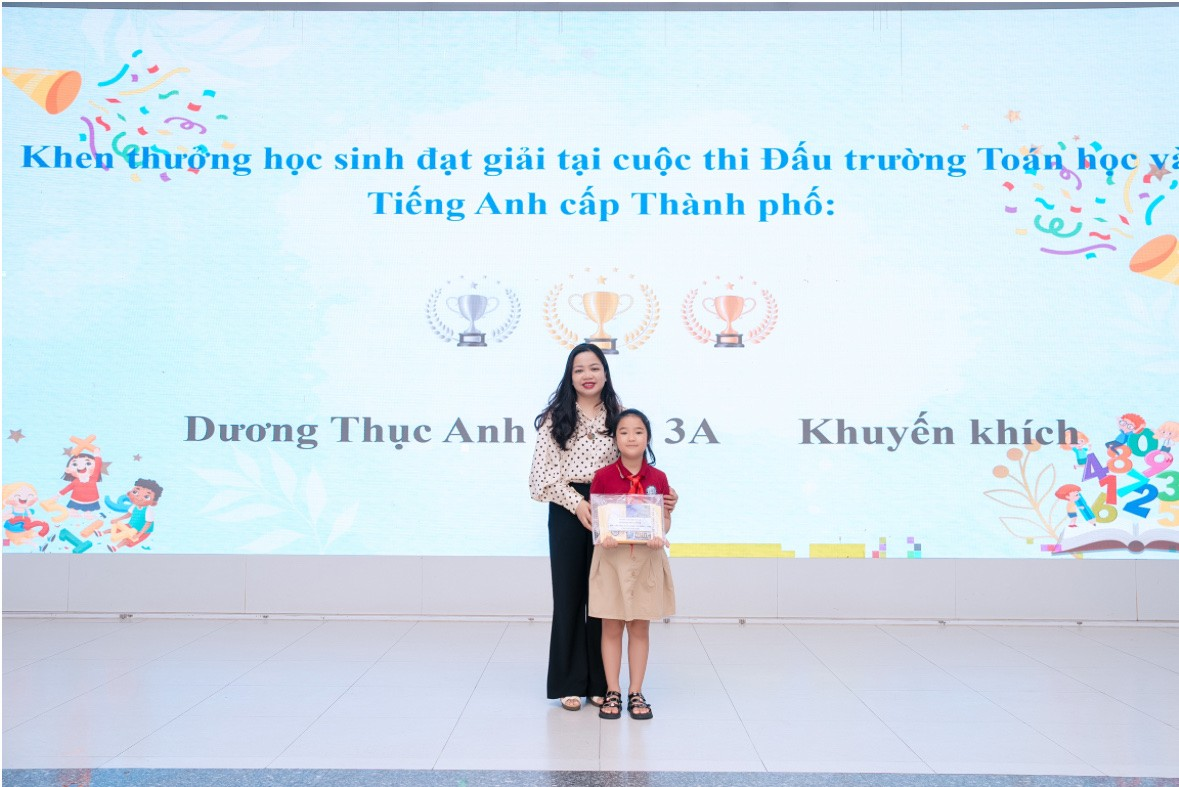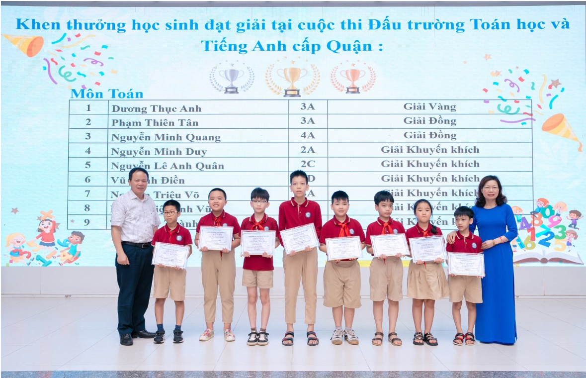 Ông Nguyễn Hữu Thịnh – Phó Bí thư chi bộ 2 và cô giáo Hoàng Thị Lương trao thưởng cho học sinh đạt thành tích trong cuộc thi Đấu trường Toán học và Tiếng Anh cấp Quận