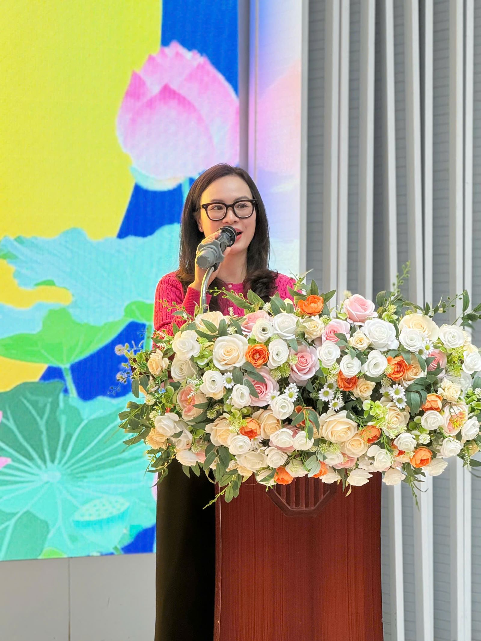 Cô giáo Nguyễn Ngọc Anh - Phó Bí thư Chi bộ, Hiệu trưởng nhà trường phát biểu chúc mừng các em Đội viên mới.