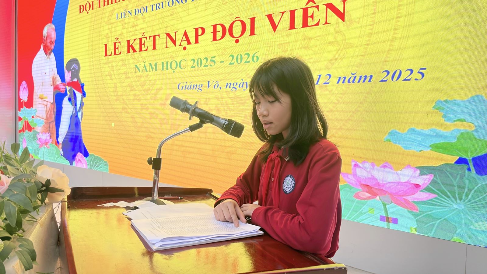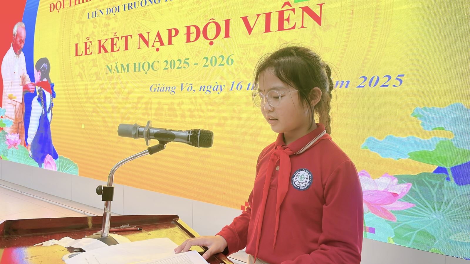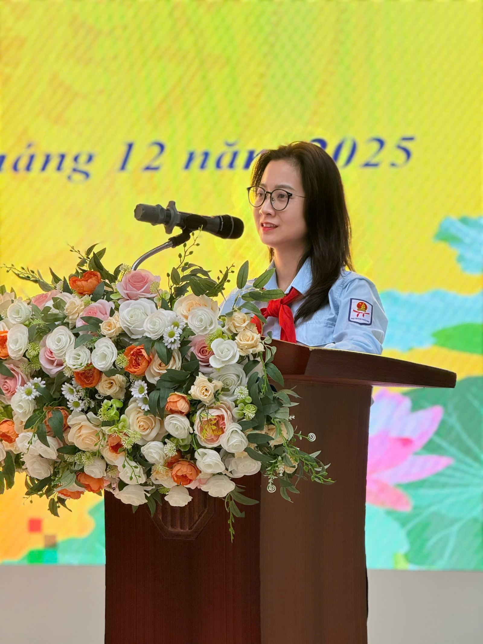Phát biểu tại buổi lễ, cô giáo Nguyễn Ngọc Anh – Phó Bí thư Chi bộ, Hiệu trưởng nhà trường đã chúc mừng các em nhi đồng ưu tú được kết nạp Đội trong đợt này. Cô nhấn mạnh: “Việc được đứng trong hàng ngũ Đội Thiếu niên Tiền phong Hồ Chí Minh là niềm vinh dự lớn lao, đồng thời cũng là trách nhiệm của mỗi đội viên. Cô mong muốn các đội viên mới luôn ghi nhớ lời hứa Đội viên, không ngừng phấn đấu trong học tập và rèn luyện, thực hiện tốt 5 điều Bác Hồ dạy thiếu niên, nhi đồng; tích cực tham gia các hoạt động phong trào, xứng đáng là con ngoan, trò giỏi, cháu ngoan Bác Hồ, góp phần xây dựng Liên đội và nhà trường ngày càng phát triển.”