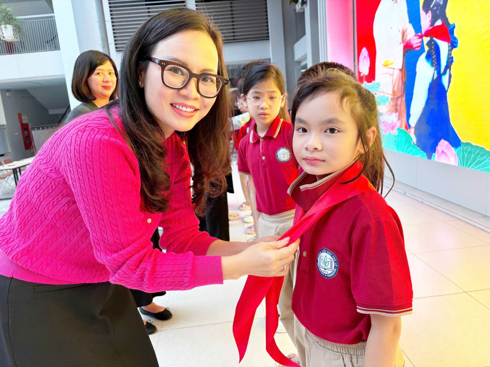 Cô giáo Nguyễn Ngọc Anh - Phó Bí thư Chi bộ, Phó Hiệu trưởng nhà trường trao khăn quàng đỏ cho các em Đội viên mới.