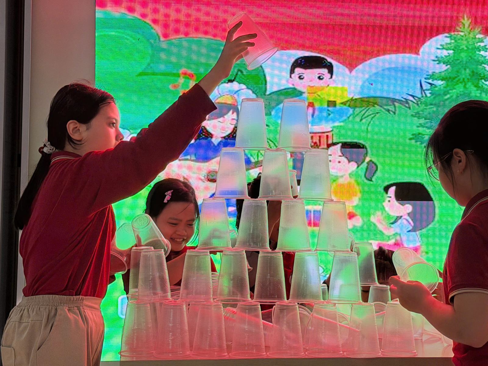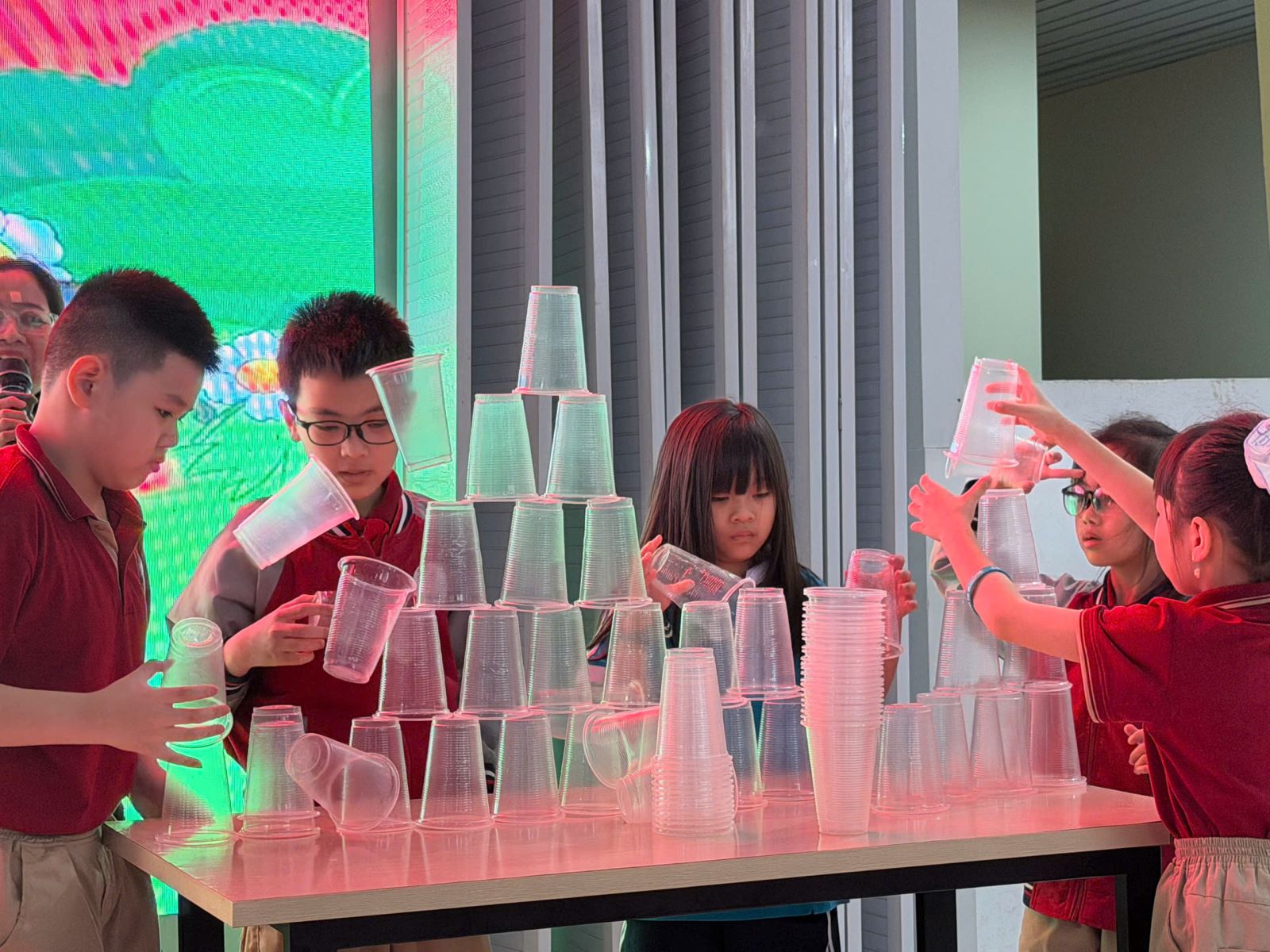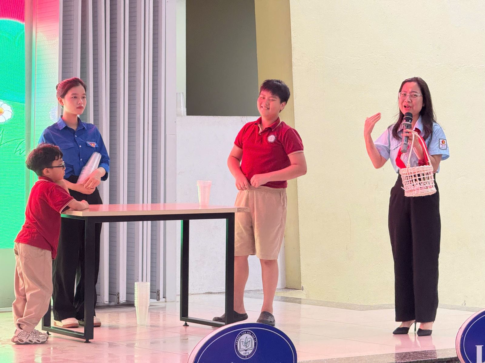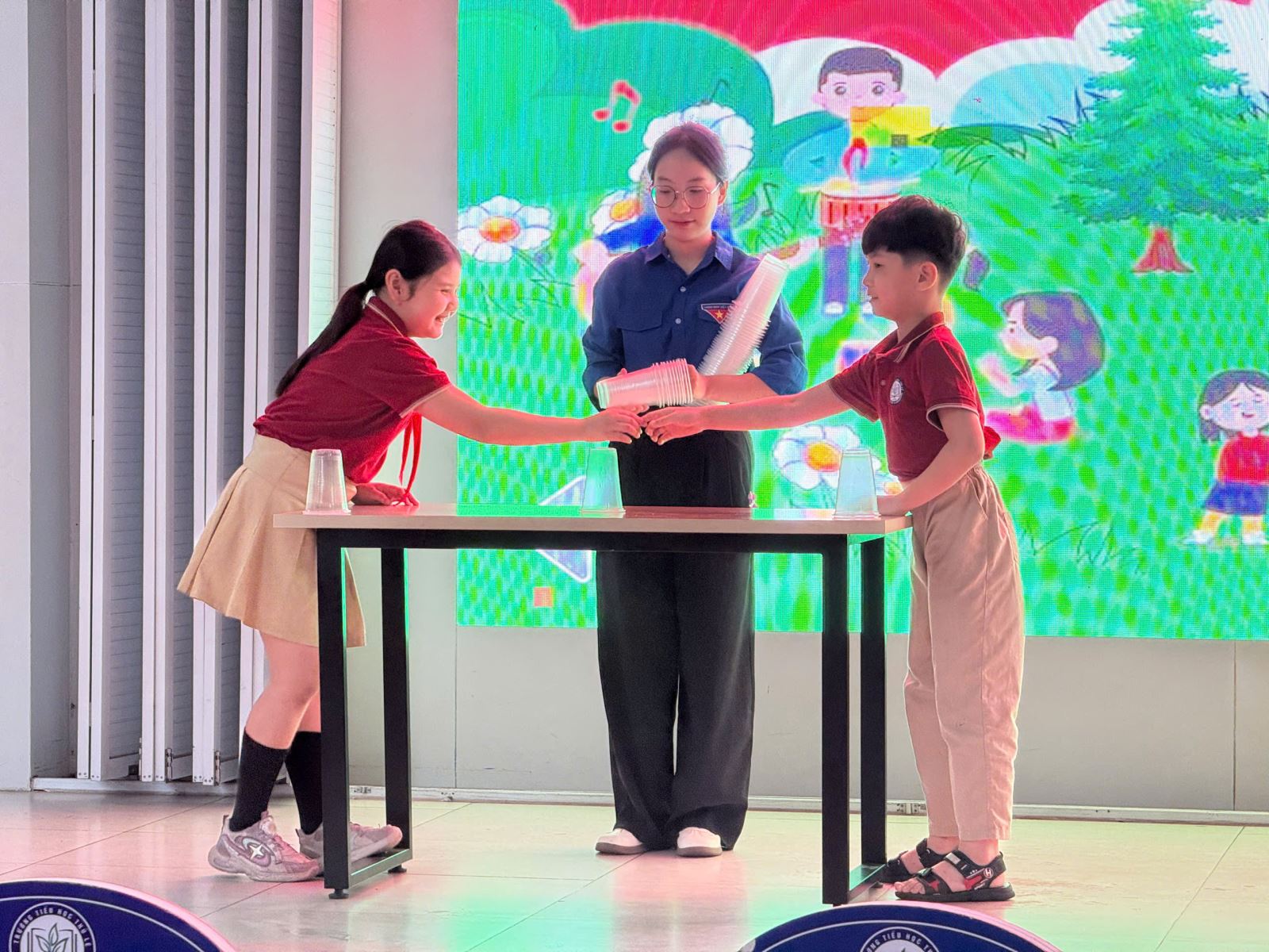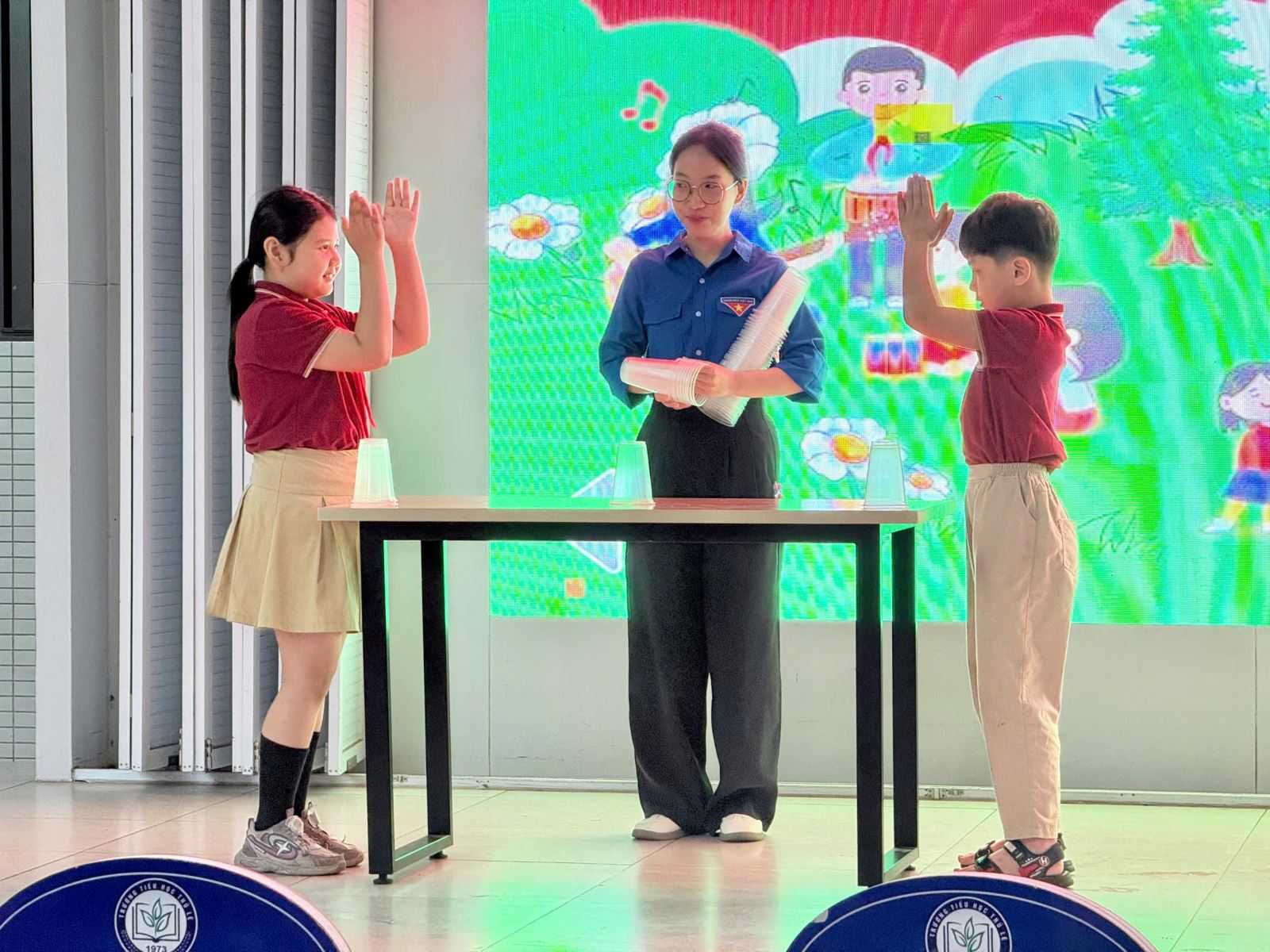 Tiếp nối chương trình là phần hoạt náo vui nhộn, tràn đầy năng lượng, thu hút sự tham gia hào hứng của các em học sinh. Bên cạnh đó là chuỗi các trò chơi vận động hấp dẫn, bổ ích, phù hợp với lứa tuổi tiểu học. Các em học sinh được tham gia nhiều hoạt độngtrò chơi tập thể như “Tháp tình bạn”, “Ai nhanh hơn?”…, thử thách nhanh – khéo – khỏe, qua đó rèn luyện thể chất, phát huy tinh thần đồng đội và kỹ năng phối hợp. Tiếng cười, niềm vui lan tỏa khắp sân trường, tạo nên một ngày hội thực sự ý nghĩa.