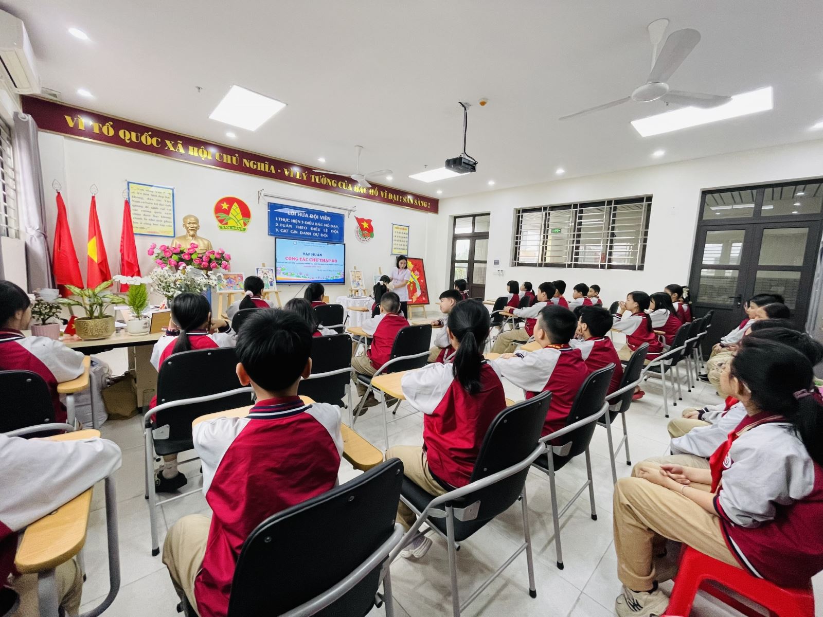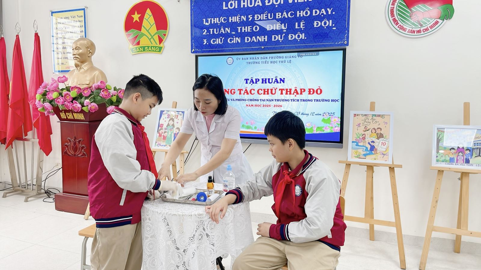 Liên đội phối hợp với nhân viên y tế tổ chức tập huấn cho đội xung kích Chữ thập đỏ của các lớp cách sơ cấp cứu một số tai nạn thương tích thường gặp trong trường học trước khi tuyên truyền cho học sinh toàn trường.
