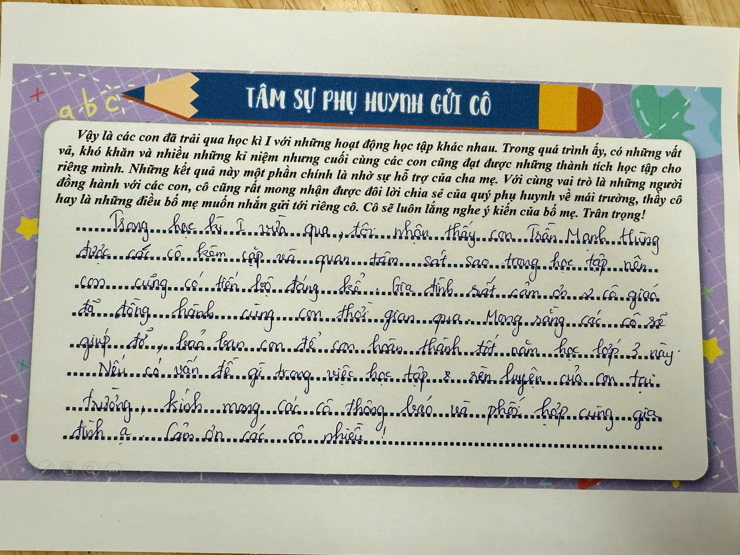 Thông qua buổi họp phụ huynh cuối học kì I, mối quan hệ phối hợp giữa gia đình và nhà trường tiếp tục được củng cố, tạo nền tảng vững chắc để học sinh lớp 3 tự tin bước vào học kì II với nhiều nỗ lực và tiến bộ hơn.
