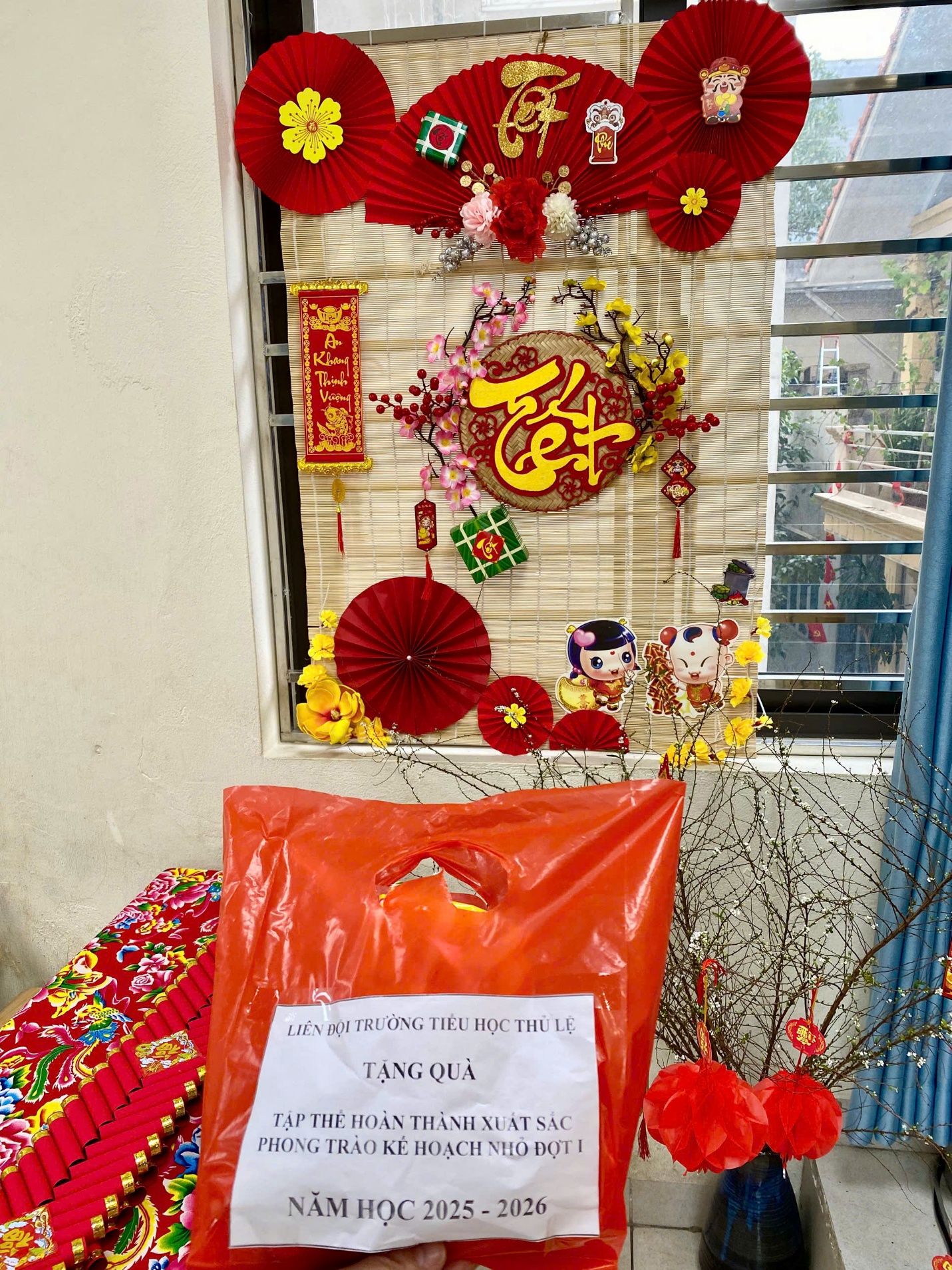 Vừa bước vào lớp, các con đã tròn mắt ngạc nhiên vì góc trang trí Tết bỗng trở nên rực rỡ, ấm áp hơn hẳn. Hóa ra, từ chiều thứ Sáu (sau giờ tan học), các bác trong Ban phụ huynh lớp đã âm thầm dành thời gian, công sức để hoàn thiện từng chi tiết: phông nền, quạt giấy, hoa đào/hoa mai, dây treo, tiểu cảnh…