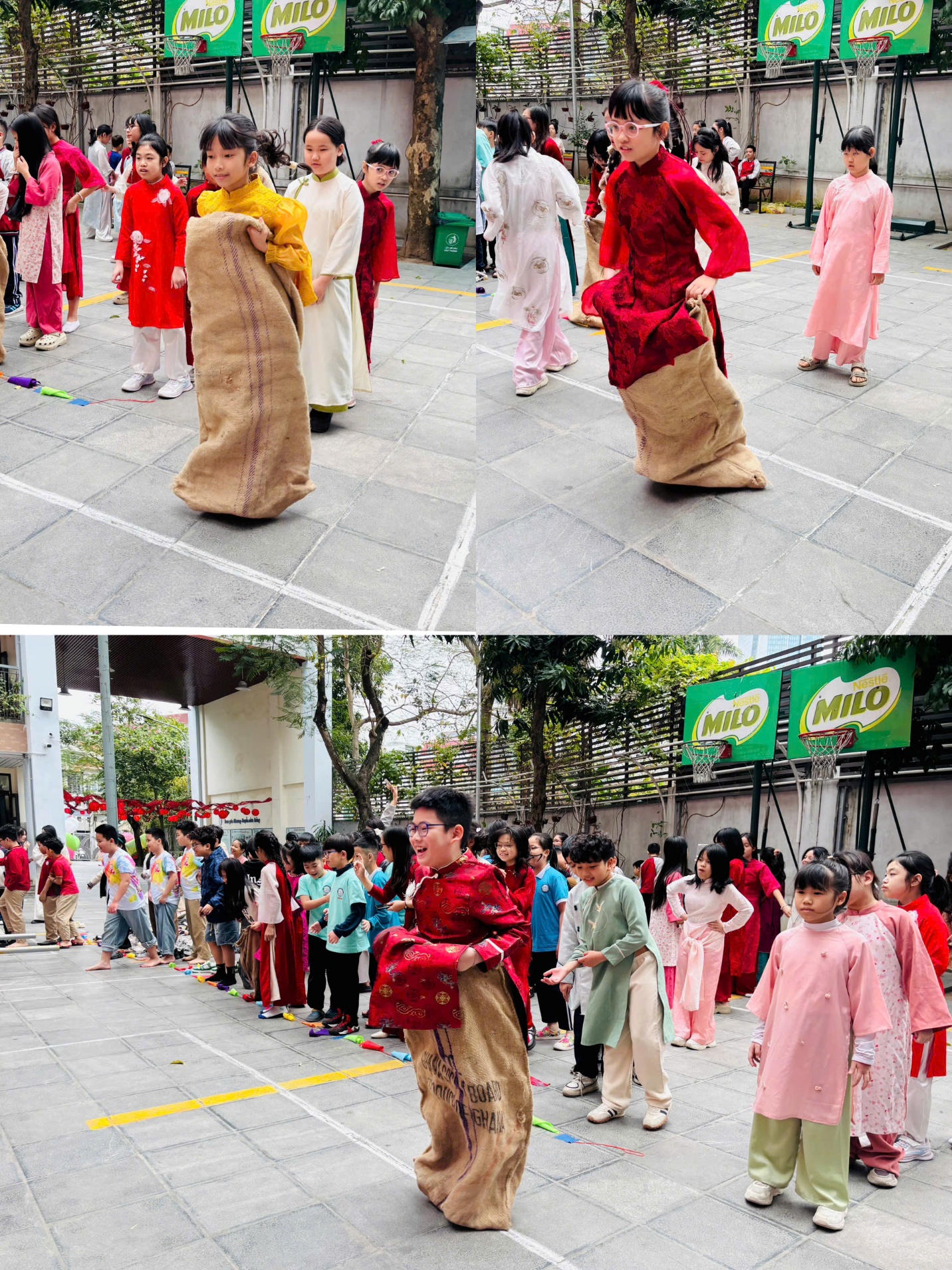Nhảy bao bố là phần thi khiến cả lớp hào hứng nhất. Những bước nhảy bật lên liên tục, có lúc loạng choạng rồi lại bật cười. Tiếng hò reo cổ vũ vang dội khắp sân trường. Các con không chỉ thi đua để về đích nhanh mà còn học cách phối hợp, động viên và chờ đợi nhau.