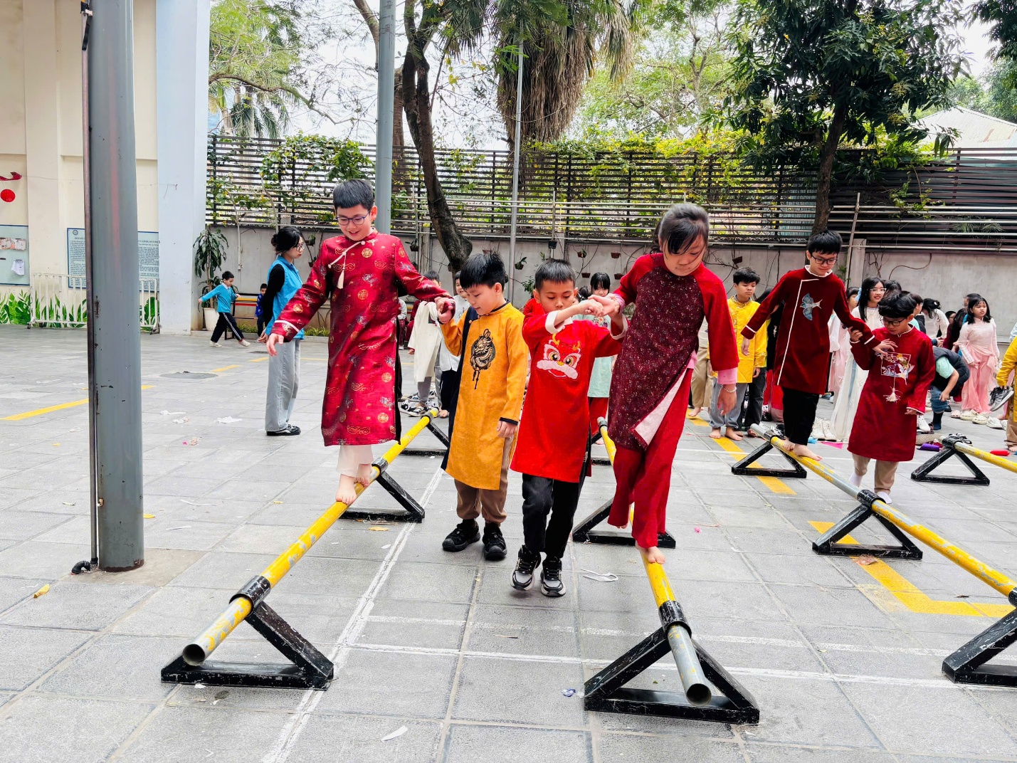 Đến với đi cầu khỉ thăng bằng, nhiều bạn ban đầu còn hơi hồi hộp. Thế nhưng, nhờ lời hướng dẫn của thầy cô và sự cổ vũ từ phía dưới, từng bạn một đã mạnh dạn bước đi. Có bạn đi chậm rãi, có bạn tự tin sải bước, nhưng tất cả đều cố gắng hoàn thành phần chơi an toàn. Sau mỗi lượt, cả lớp lại vỗ tay thật to – không chỉ cho người thắng mà cho cả sự nỗ lực của từng thành viên.
