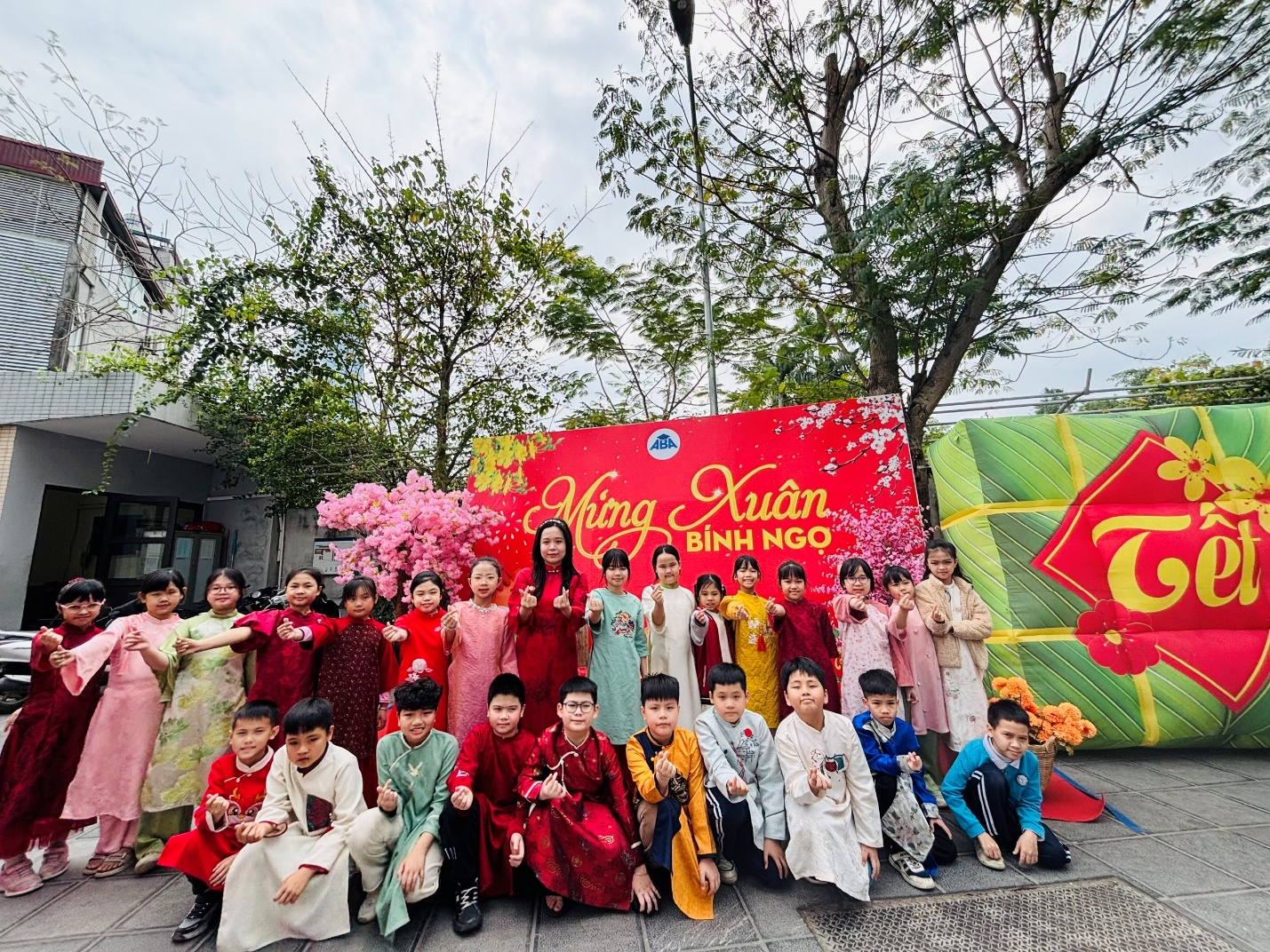 Ngay từ đầu giờ, lớp 4C đã có mặt đông đủ, đúng giờ. Bạn nào cũng gọn gàng trong tà áo dài hoặc trang phục truyền thống nhiều màu sắc. Cả lớp cùng nhau chụp ảnh trước phông nền lễ hội, lưu lại những khoảnh khắc đáng nhớ. Những nụ cười tươi rói, những ánh mắt háo hức khiến bức ảnh nào cũng tràn đầy sức sống. Nhìn các con ríu rít gọi nhau, chỉnh lại khăn áo cho bạn, ai cũng cảm nhận rõ tinh thần “mỗi ngày đến trường là một ngày vui”.
