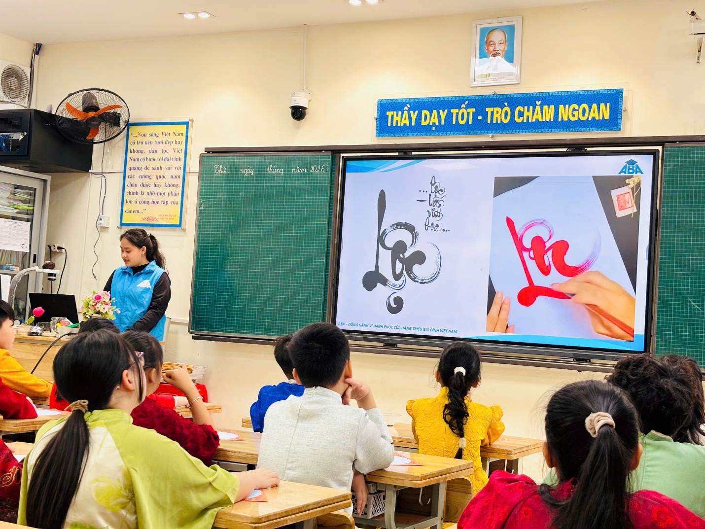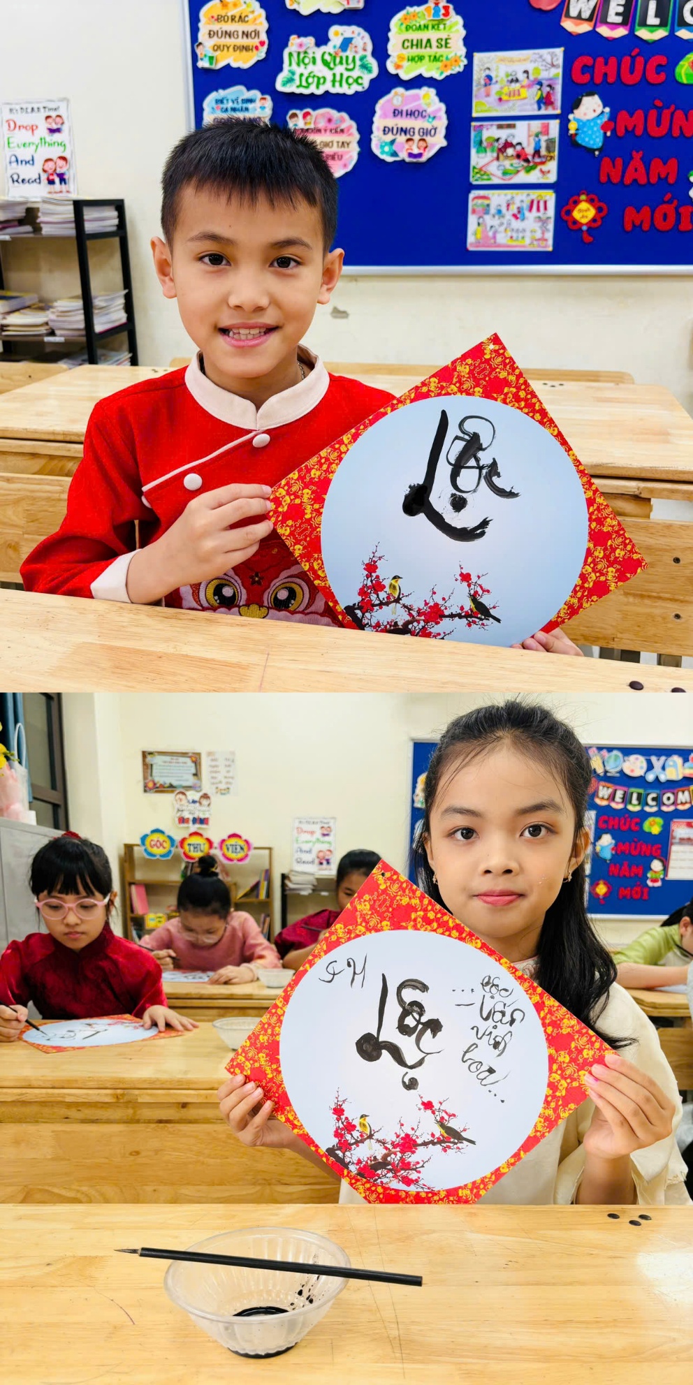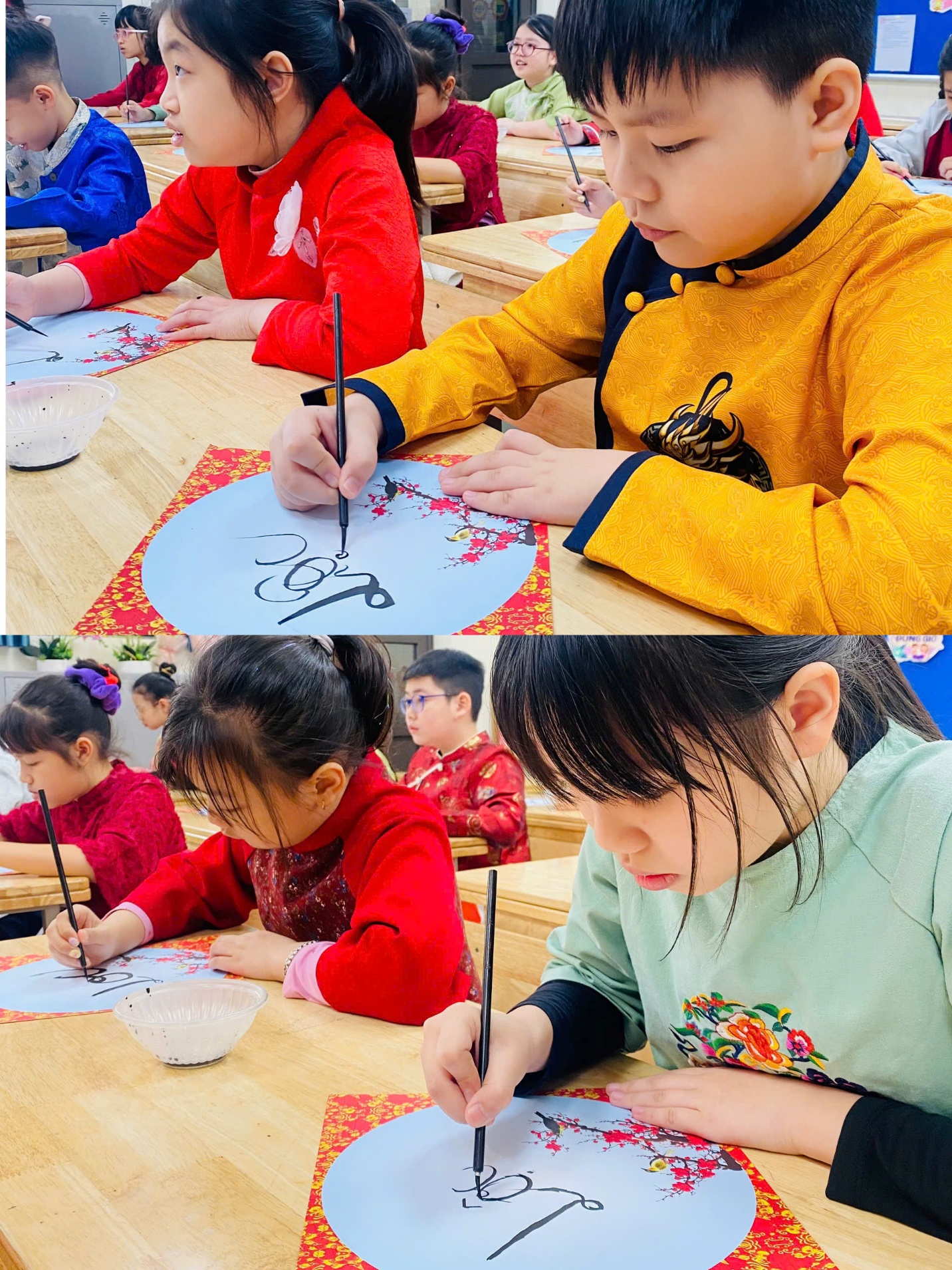 Sau phần khai mạc và văn nghệ chào mừng, các con trở về lớp để tìm hiểu và thực hành viết thư pháp. Đây là hoạt động nhẹ nhàng nhưng rất ý nghĩa. Các bạn được nghe giới thiệu về nét đẹp của chữ Việt ngày xuân, rồi tự tay viết những chữ mang ý nghĩa tốt lành như “Lộc”, “Bình an”, “Phúc”. Có bạn còn cẩn thận trang trí thêm cho tờ giấy của mình. Mỗi tấm chữ nhỏ xinh là một lời chúc đầu năm, là cách các con gìn giữ truyền thống theo cách rất hồn nhiên và gần gũi.