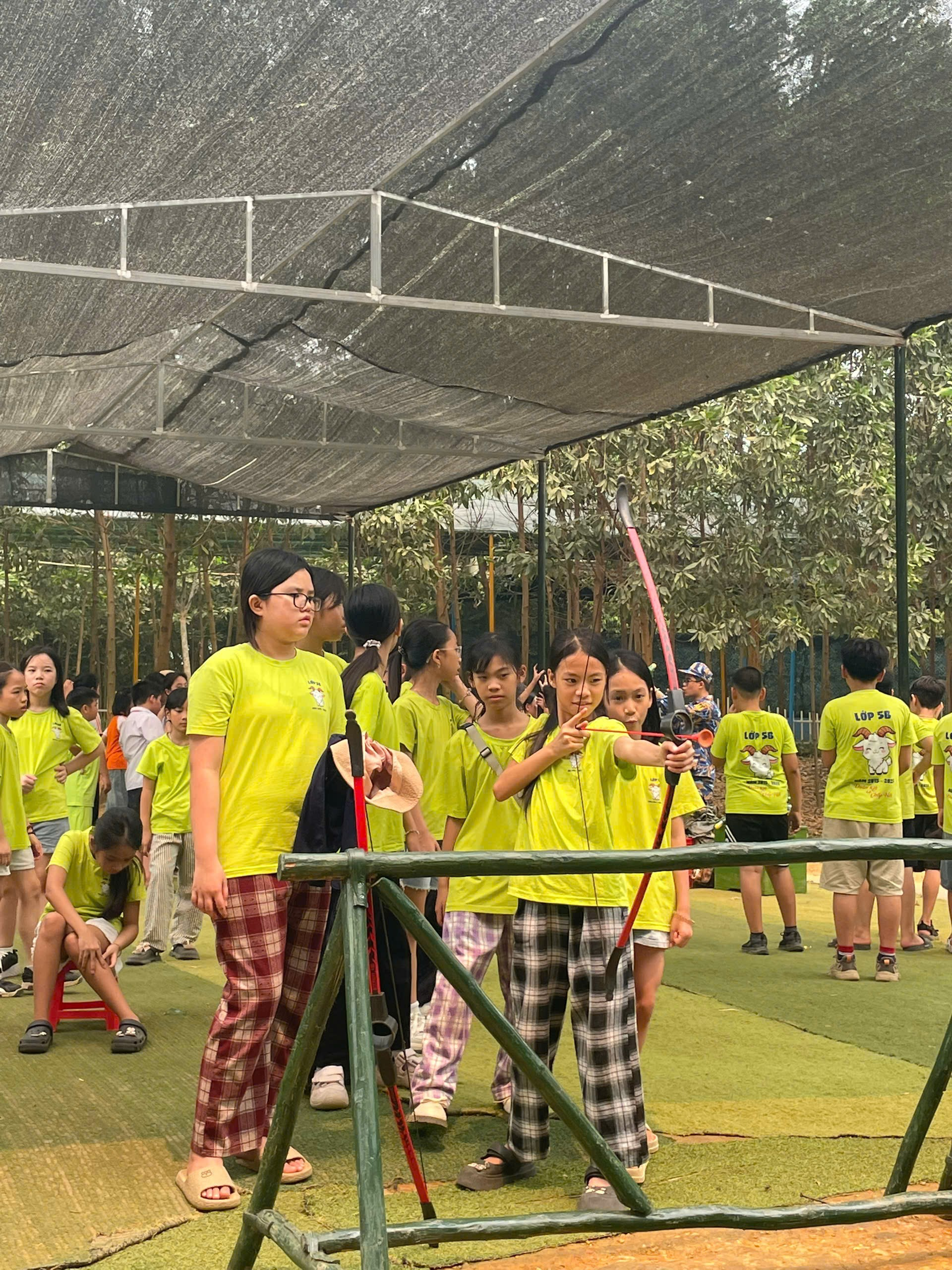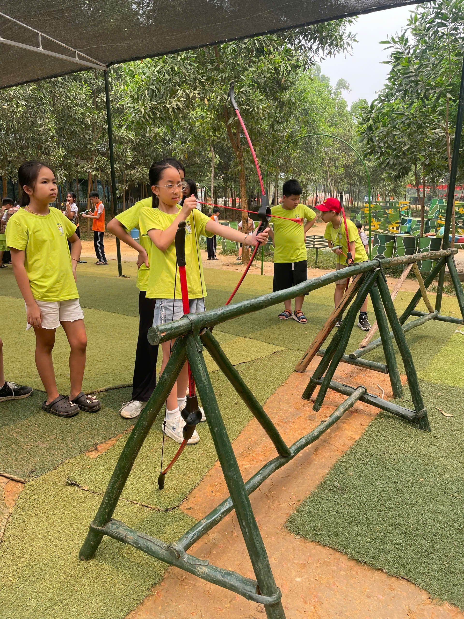 Tại đây, các em được các chú bộ đội đón tiếp nhiệt tình và hướng dẫn tham gia nhiều hoạt động thú vị. Mở đầu là hoạt động bắn cung – nơi các em được học cách sử dụng cung tên, rèn luyện sự tập trung và khéo léo. Nhiều học sinh đã tự tin hoàn thành thử thách và nhận được sự cổ vũ sôi nổi từ bạn bè.