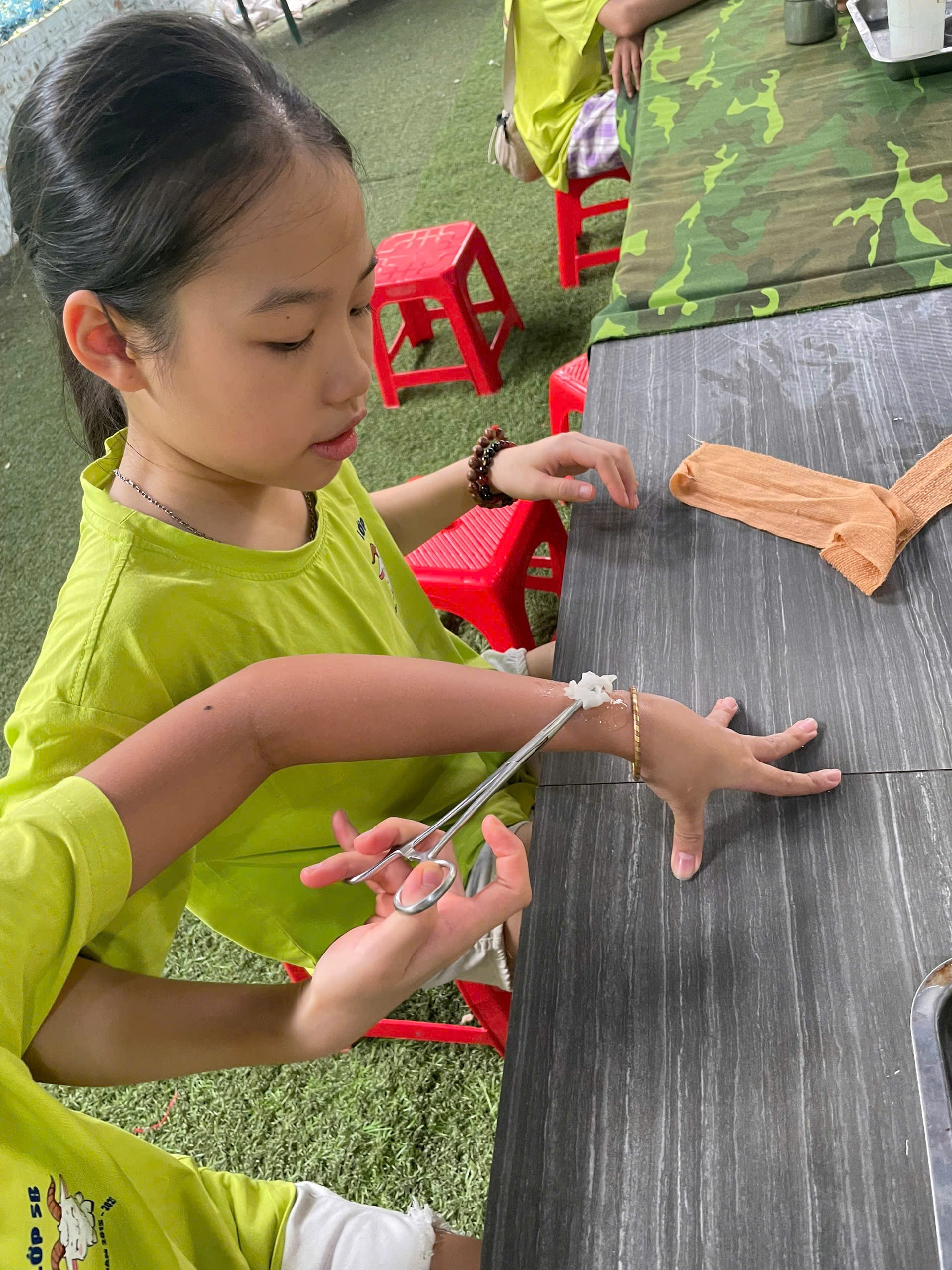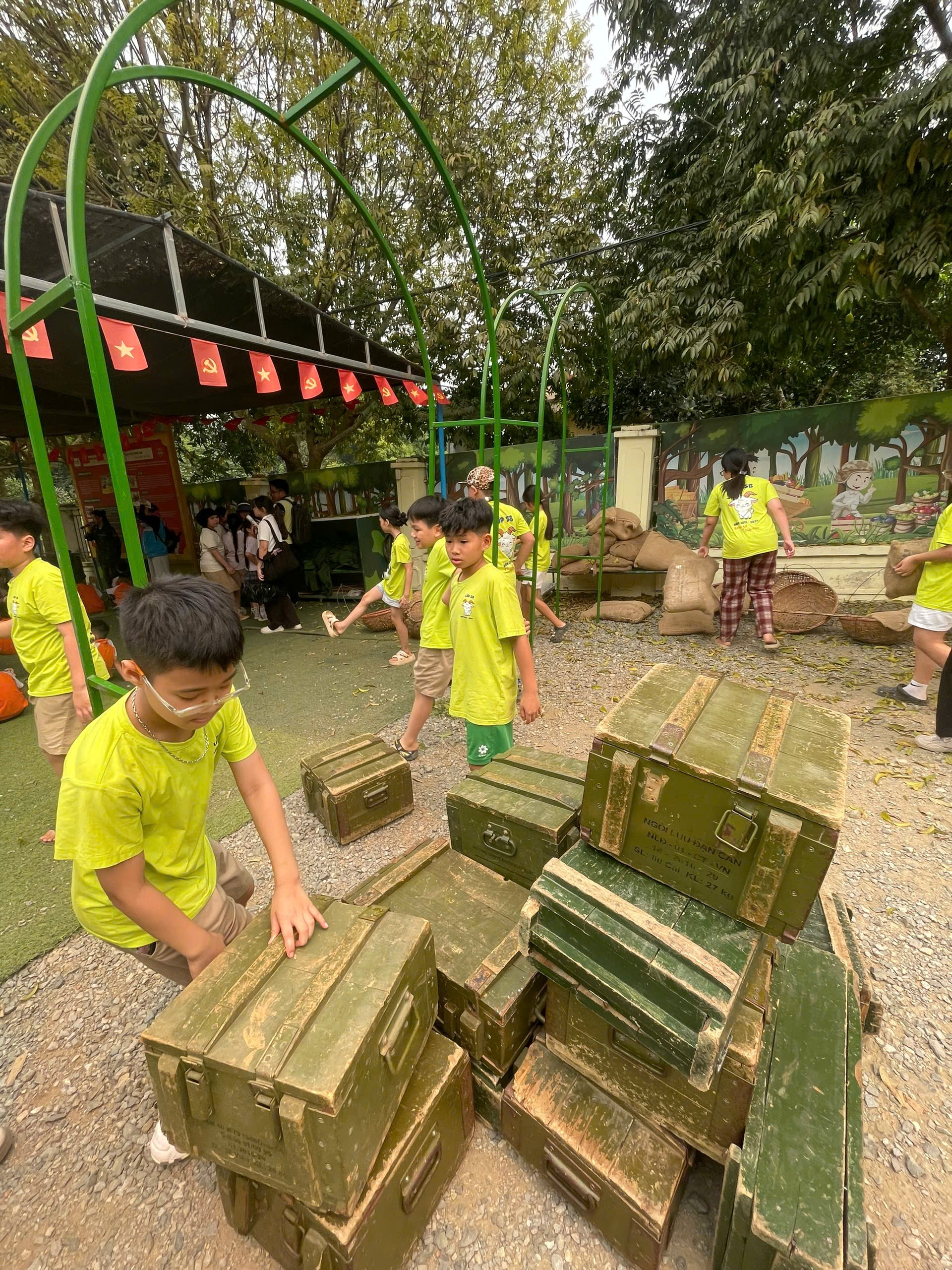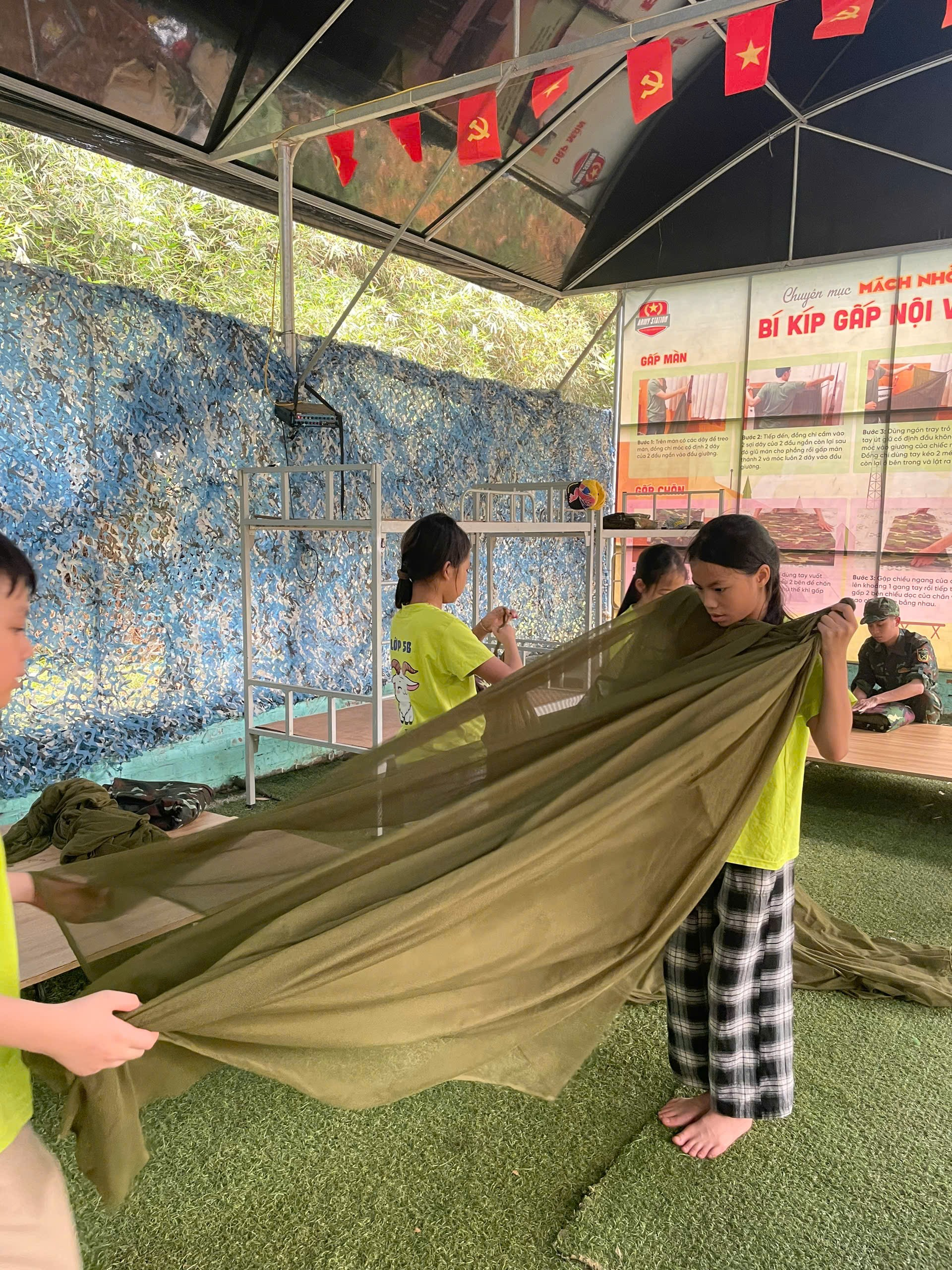 Tiếp đó, các em được hóa thân thành lực lượng giao liên, thanh niên xung phong, tìm hiểu về mô hình “Quân y cục”, “Quân nhu cục”, cùng tân binh thực hành Gấp chăn nội vụ. Qua những câu chuyện thực tế, học sinh hiểu hơn về sự vất vả, kiên cường và tinh thần trách nhiệm của những người lính.