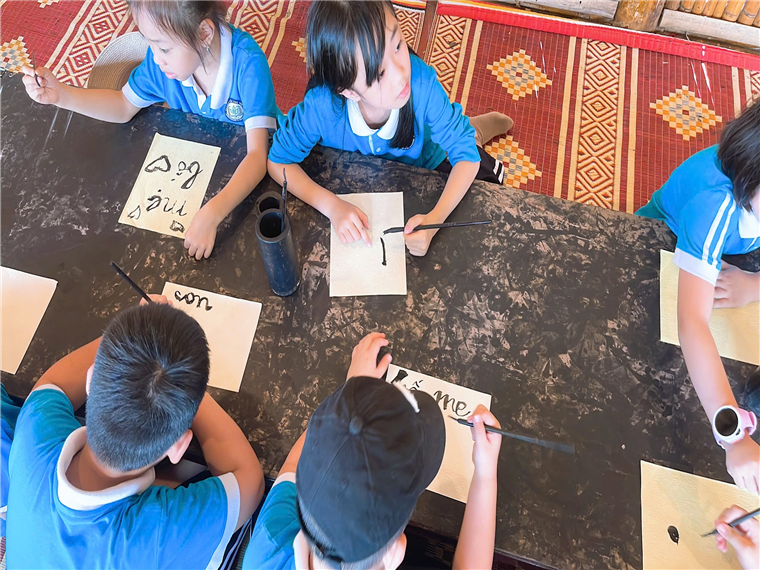 Khu du lịch sinh thái "Thu Thuỷ Ecolodge", nằm tại vùng quê yên bình của Từ Sơn, Bắc Ninh. Với không gian rộng với nhiều cây xanh và hệ thống nhà ở được thiết kế hài hòa với thiên nhiên. Ngay khi đặt chân đến Thu Thủy Ecolodge, các con học sinh đã được dẫn dắt vào một hành trình ngược dòng lịch sử, bắt đầu với việc tham quan khu vực Thiên Đô Chiếu. Tại đây, các em đã được nghe giới thiệu về Chiếu Dời Đô của vua Lý Công Uẩn và tham gia viết thư pháp, tạo ra những tác phẩm chữ viết đẹp mắt để làm kỷ niệm. Đây không chỉ là hoạt động học hỏi về lịch sử mà còn là cách để các em kết nối với giá trị văn hóa truyền thống.