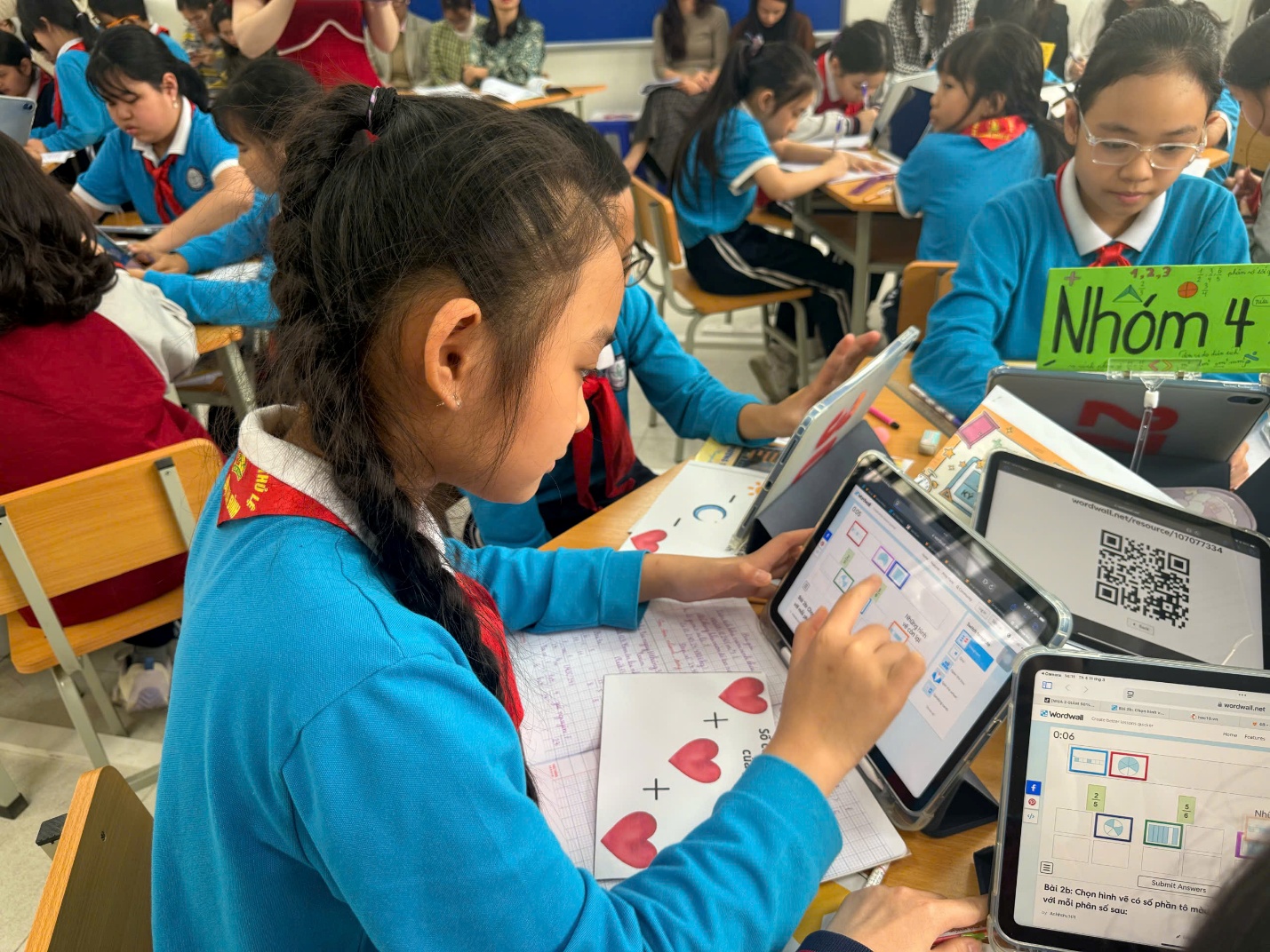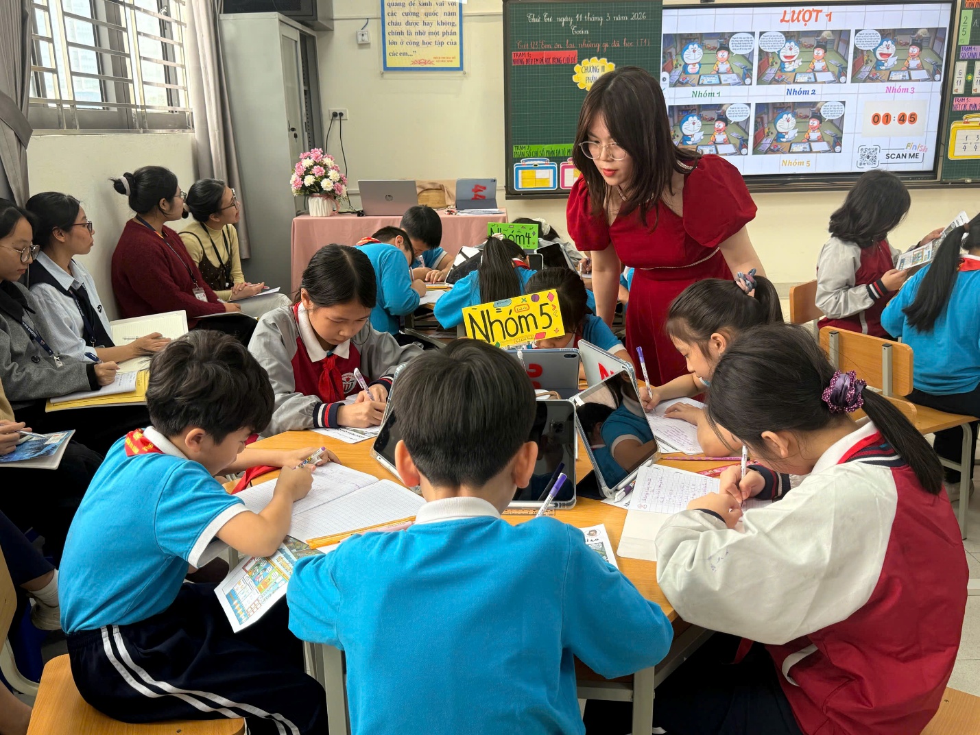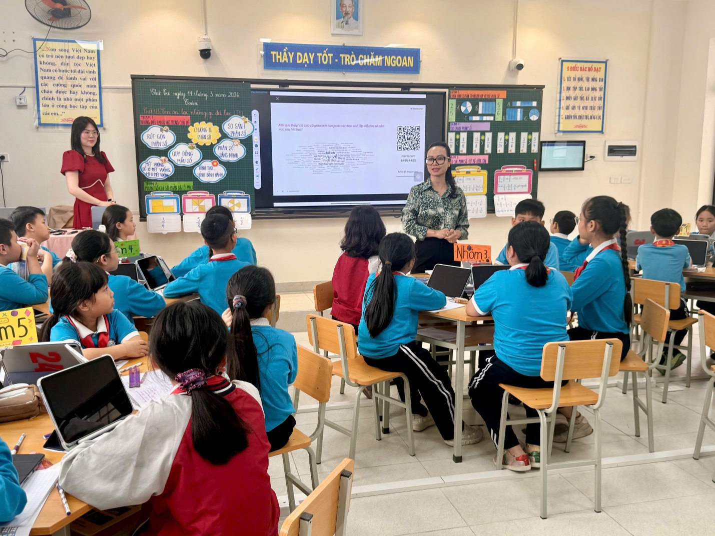 Điểm nổi bật của tiết dạy là việc ứng dụng iPad và các công cụ số một cách phù hợp, hiệu quả. Học sinh được quét mã QR, thực hiện nhiệm vụ học tập, tham gia trò chơi, ghi nhận kết quả và tương tác trực tiếp với sản phẩm học tập của nhóm. Việc đưa thiết bị công nghệ vào lớp học không chỉ làm tăng sức hấp dẫn của tiết học mà còn góp phần hình thành cho học sinh năng lực sử dụng công nghệ trong học tập một cách tích cực, an toàn và chủ động.