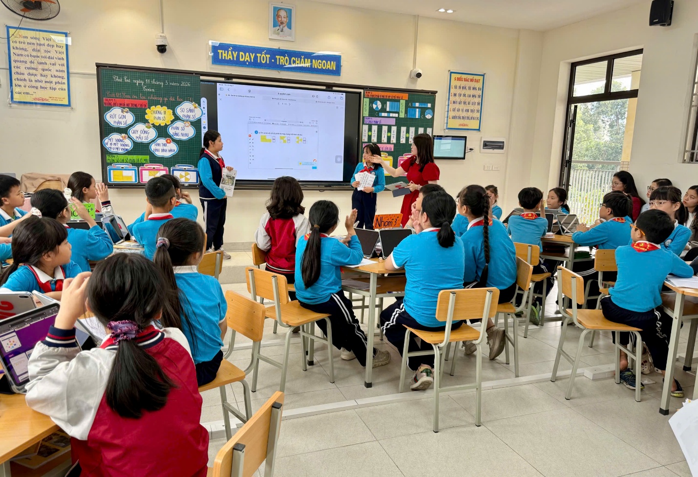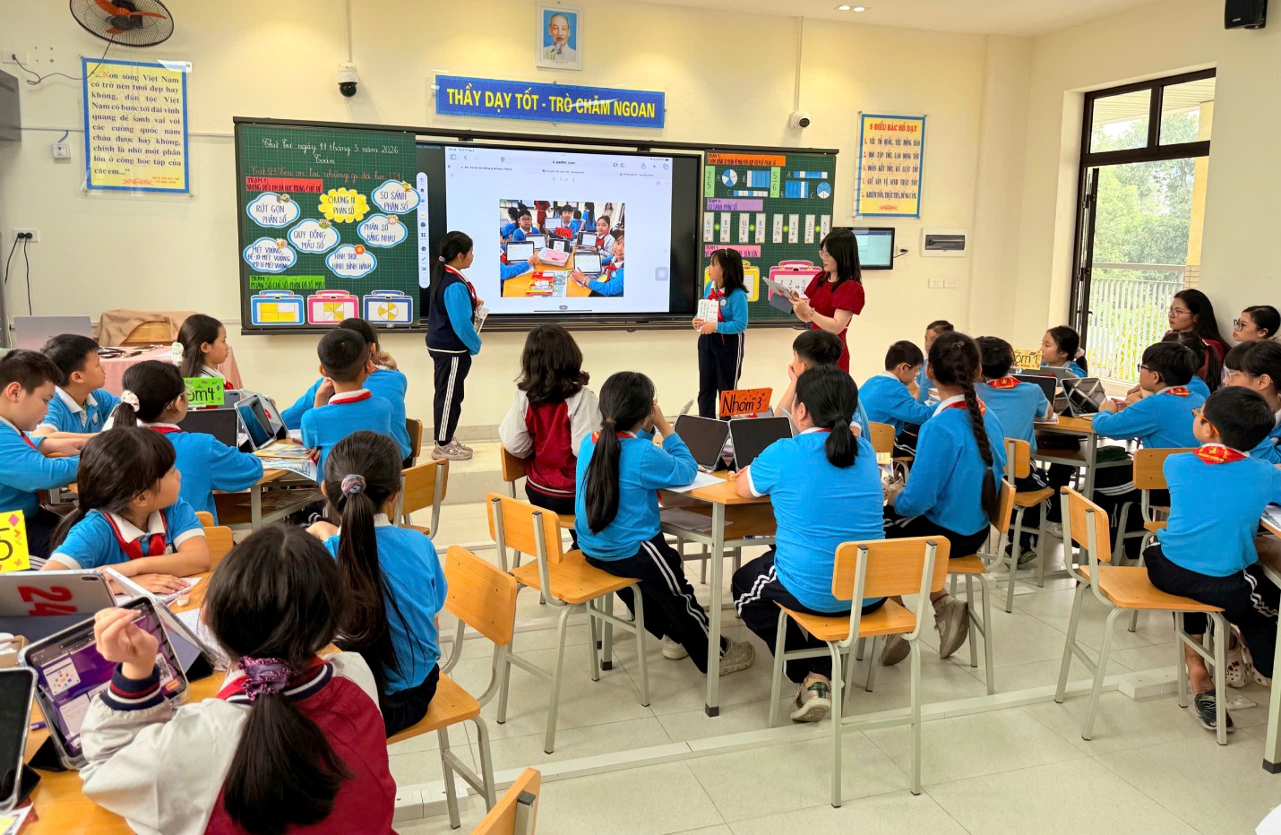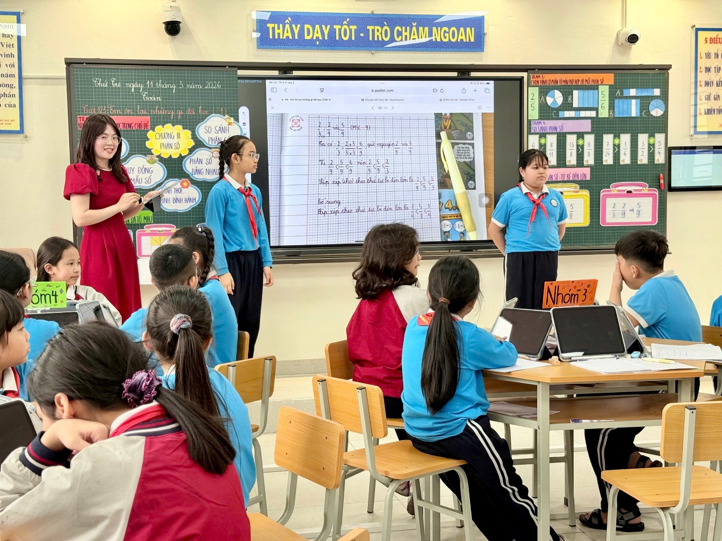 Điểm nổi bật của tiết dạy là việc ứng dụng iPad và các công cụ số một cách phù hợp, hiệu quả. Học sinh được quét mã QR, thực hiện nhiệm vụ học tập, tham gia trò chơi, ghi nhận kết quả và tương tác trực tiếp với sản phẩm học tập của nhóm. Việc đưa thiết bị công nghệ vào lớp học không chỉ làm tăng sức hấp dẫn của tiết học mà còn góp phần hình thành cho học sinh năng lực sử dụng công nghệ trong học tập một cách tích cực, an toàn và chủ động.
