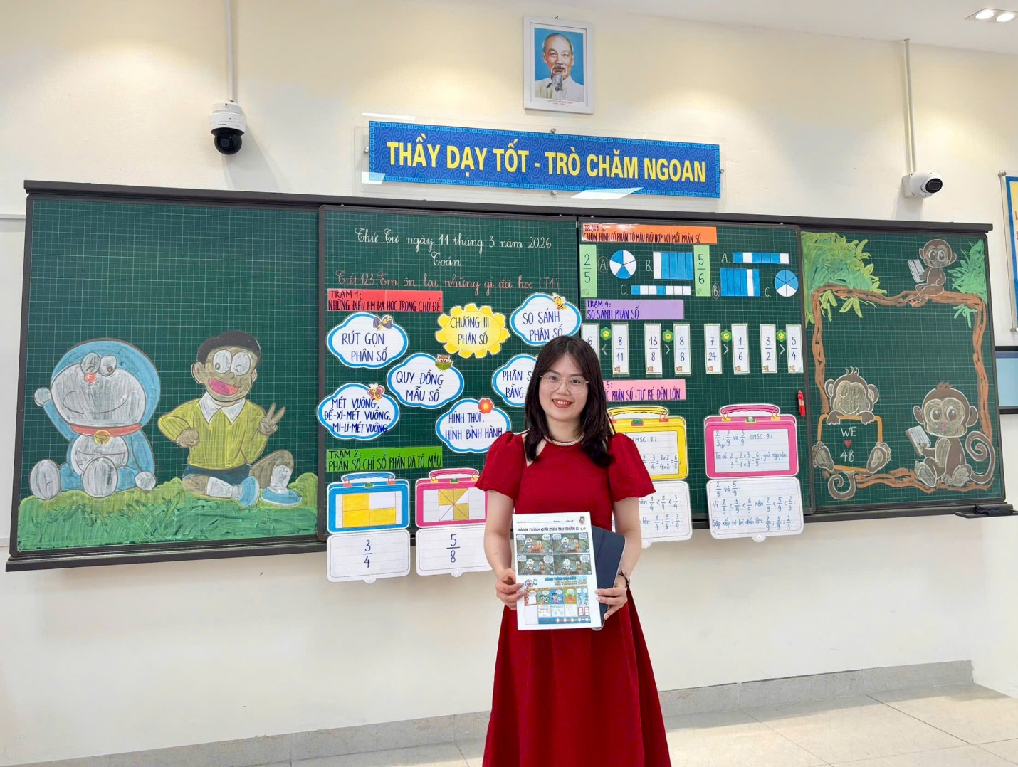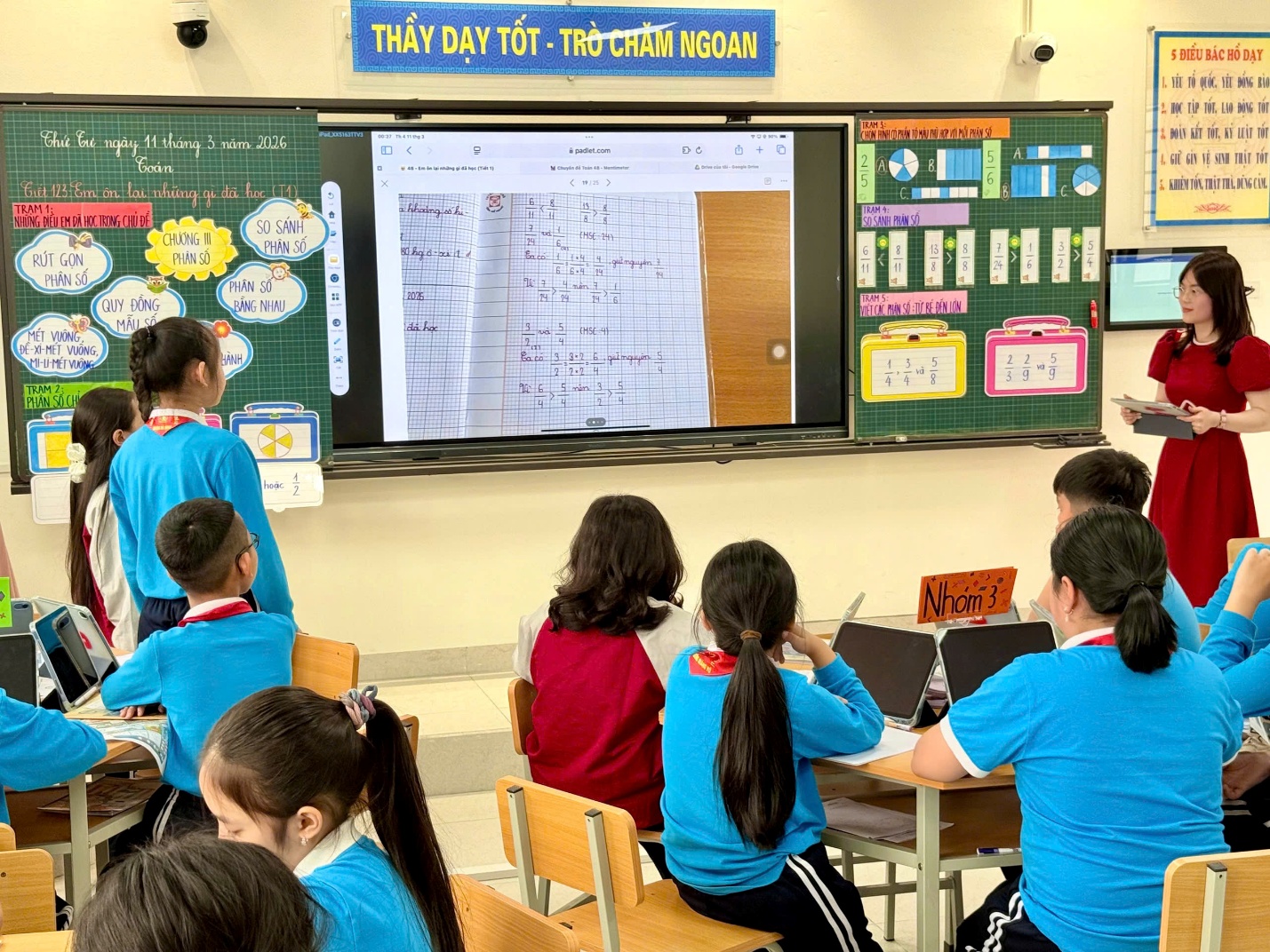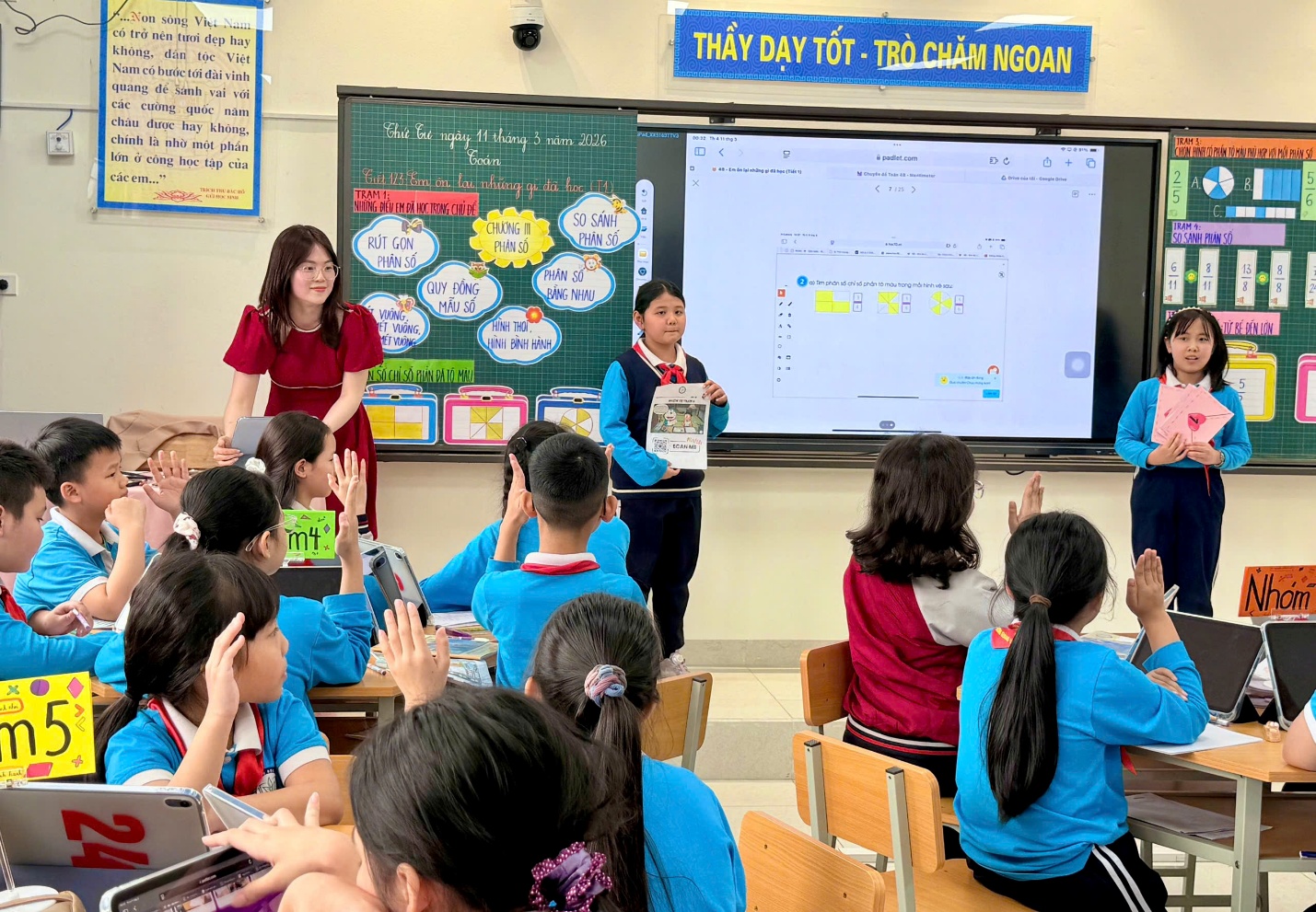 Với hình thức tổ chức theo trạm, học sinh được hoạt động liên tục qua nhiều nhiệm vụ khác nhau như nhận biết phân số, lựa chọn hình phù hợp, so sánh và sắp xếp phân số. Mỗi em đều được tham gia, được trao đổi, được chia sẻ và thể hiện vai trò của mình trong nhóm. Không khí lớp học diễn ra sôi nổi, hào hứng; học sinh tích cực hợp tác, mạnh dạn trình bày, tự tin nêu ý kiến và hoàn thành nhiệm vụ học tập bằng tinh thần chủ động, say mê.