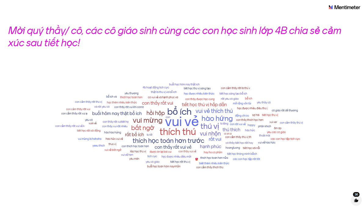 Khép lại tiết học, học sinh tiếp tục được chia sẻ cảm xúc qua mã QR trên Mentimeter. Hoạt động cuối giờ không chỉ giúp giáo viên nắm bắt được mức độ hứng thú của học sinh mà còn để lại dư âm đẹp về một tiết học Toán đầy niềm vui, sáng tạo và hiệu quả.