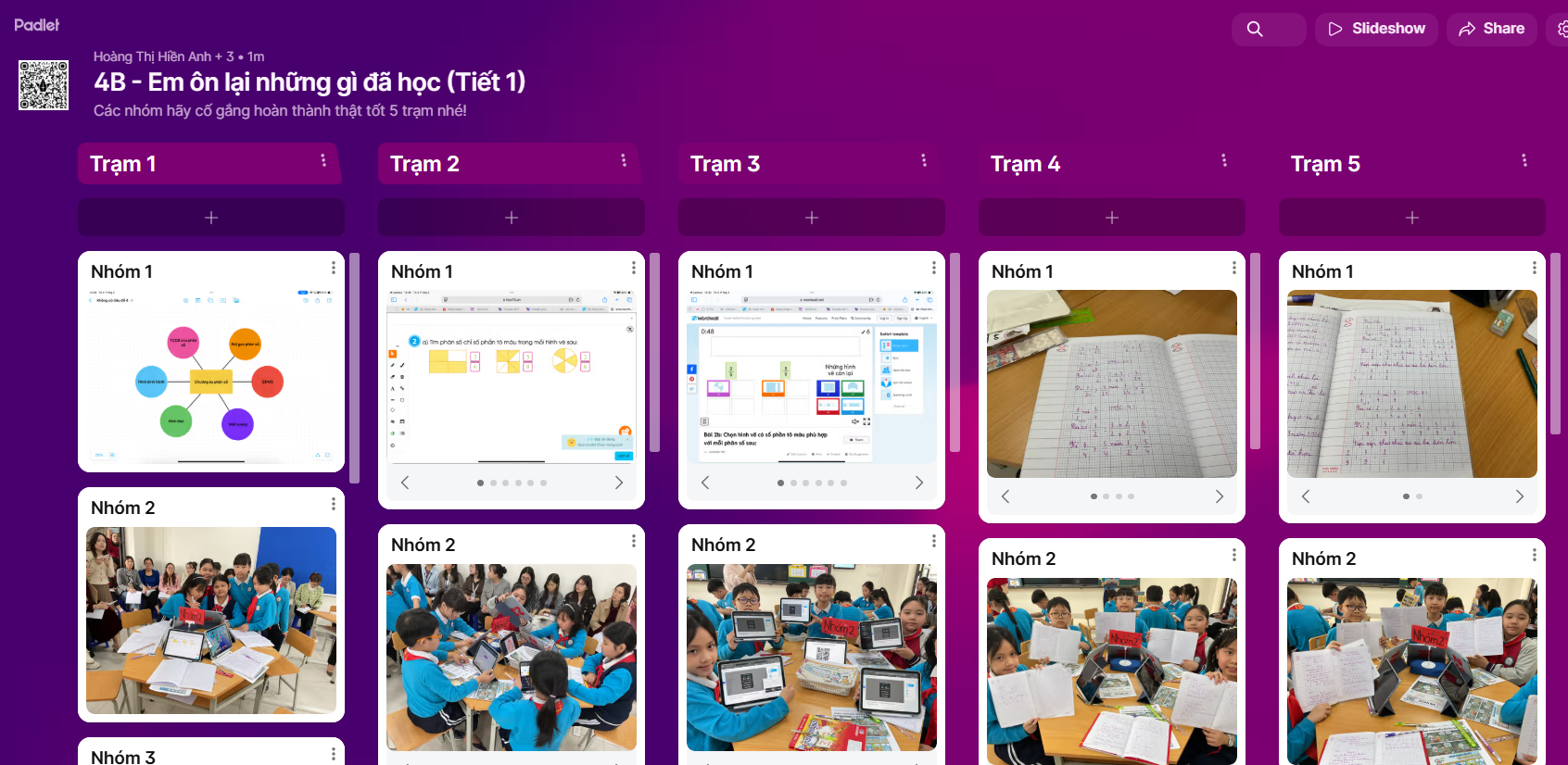 Kết quả bài làm theo 5 trạm học sinh 5 nhóm tải lên Padlet lớp