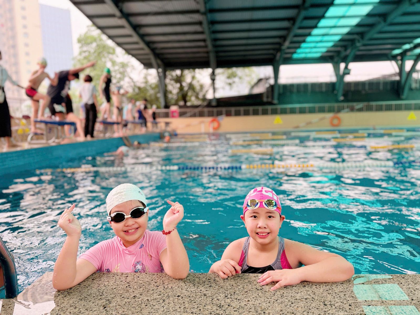 Cô giáo Nguyễn Hương Giang - Giáo viên Thể dục cùng đội tuyển Bơi lội tham gia thi đấu.