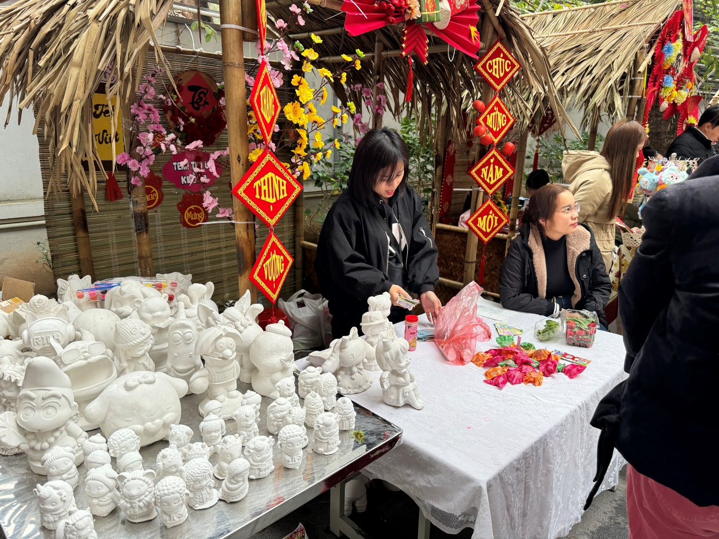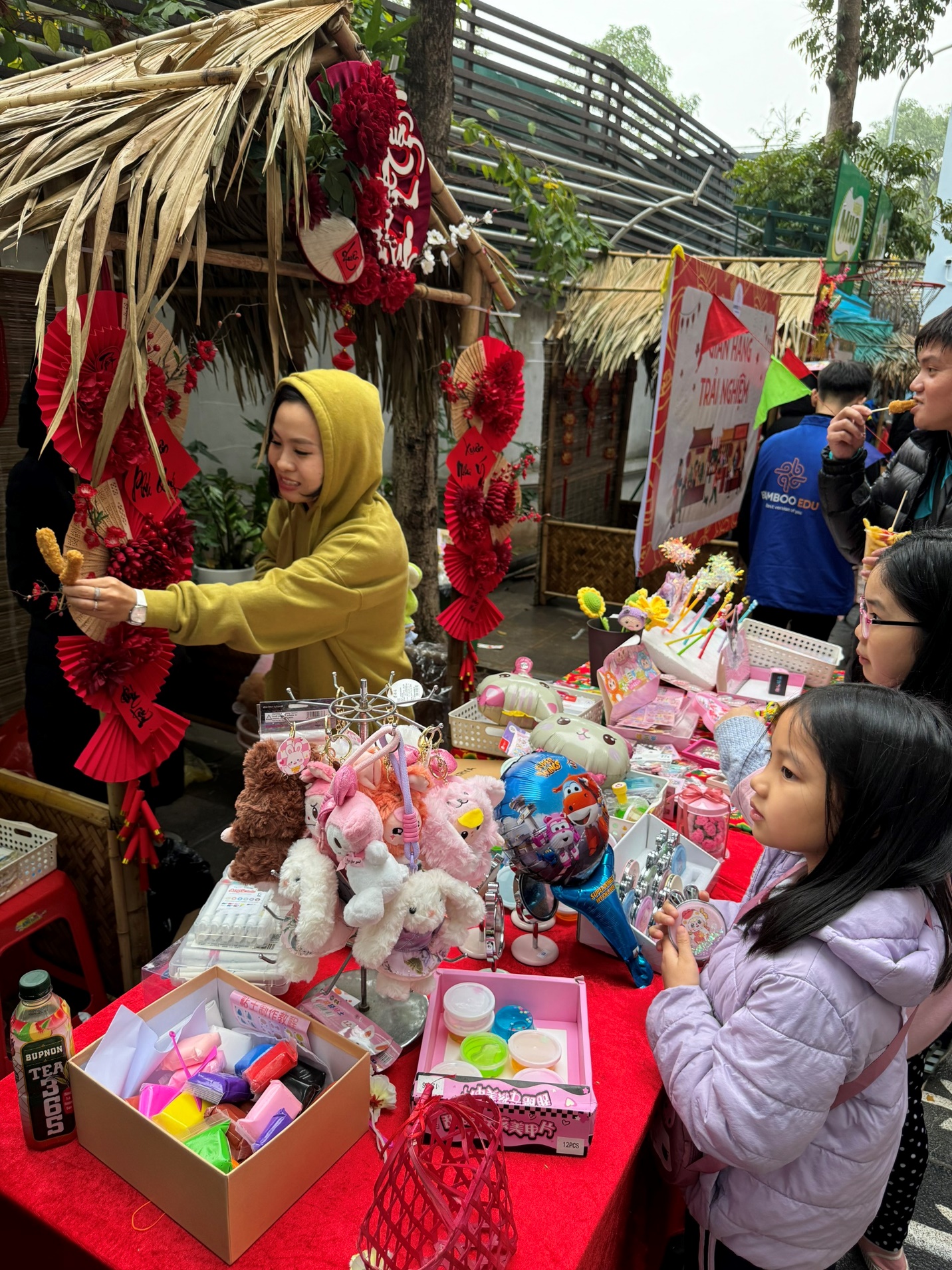 Cả sân trường ngập tràn trong sắc xuân với những gian hàng rực rỡ màu sắc. Các bạn nhỏ không giấu được niềm vui khi được hòa mình vào không khí ấm áp của phiên chợ Tết với các tiểu cảnh, gian hàng trang trí theo phong cách cổ truyền, được cảm nhận hương vị ngày Xuân, được tự tay mua sắm mặt hàng yêu thích.