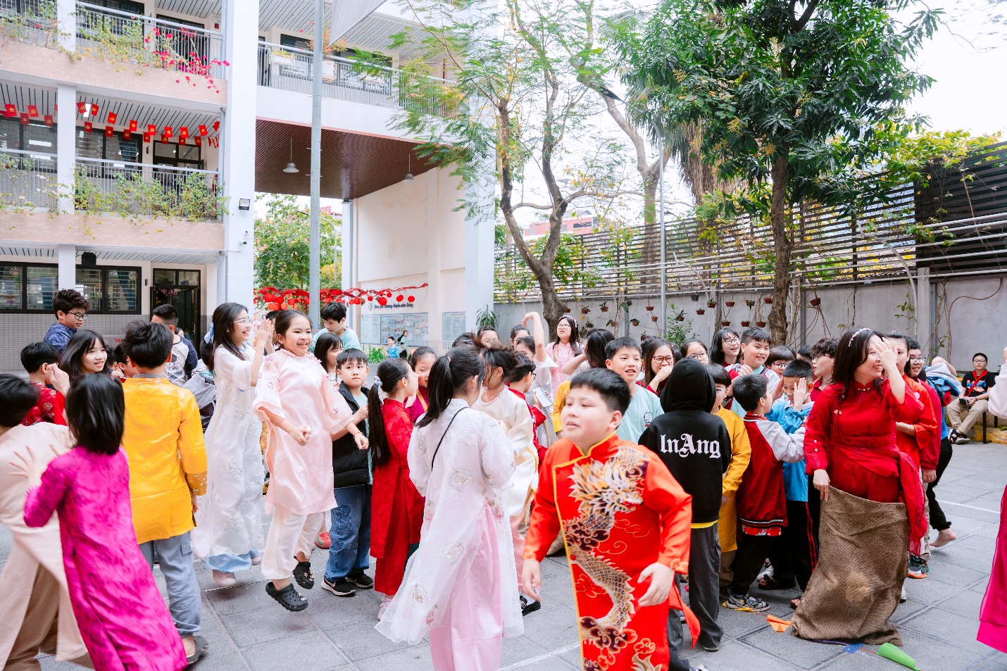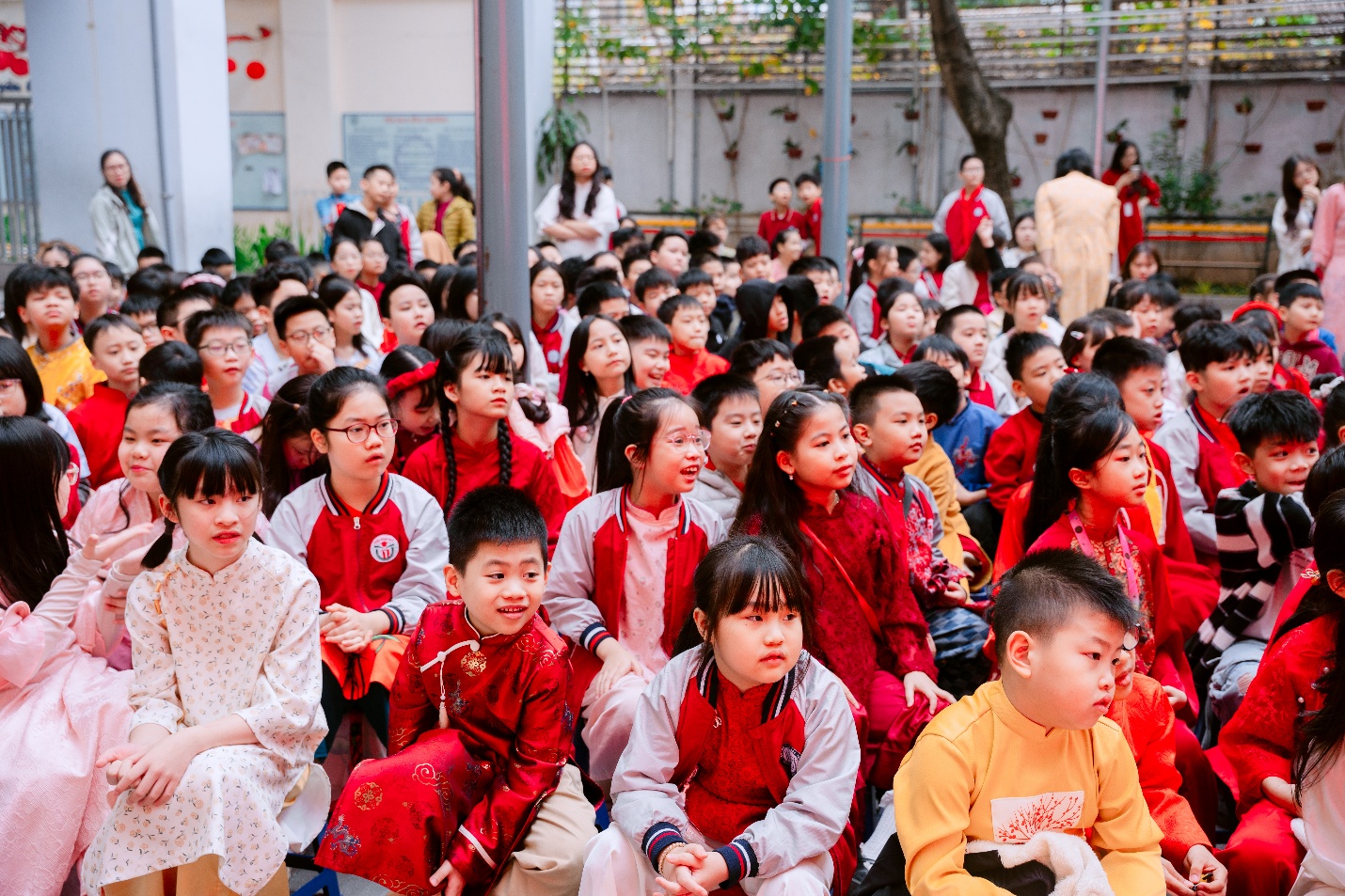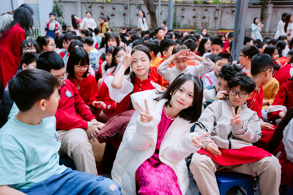 Mở đầu chương trình là những tiết mục văn nghệ đặc sắc. Tiếng nhạc xuân rộn ràng vang lên, những điệu múa uyển chuyển cùng lời ca trong trẻo đã làm không khí sân trường trở nên náo nhiệt và ấm áp hơn bao giờ hết. Các bạn học sinh lớp 5B chăm chú theo dõi, vỗ tay cổ vũ không ngớt, tạo nên một bầu không khí thật sôi động.