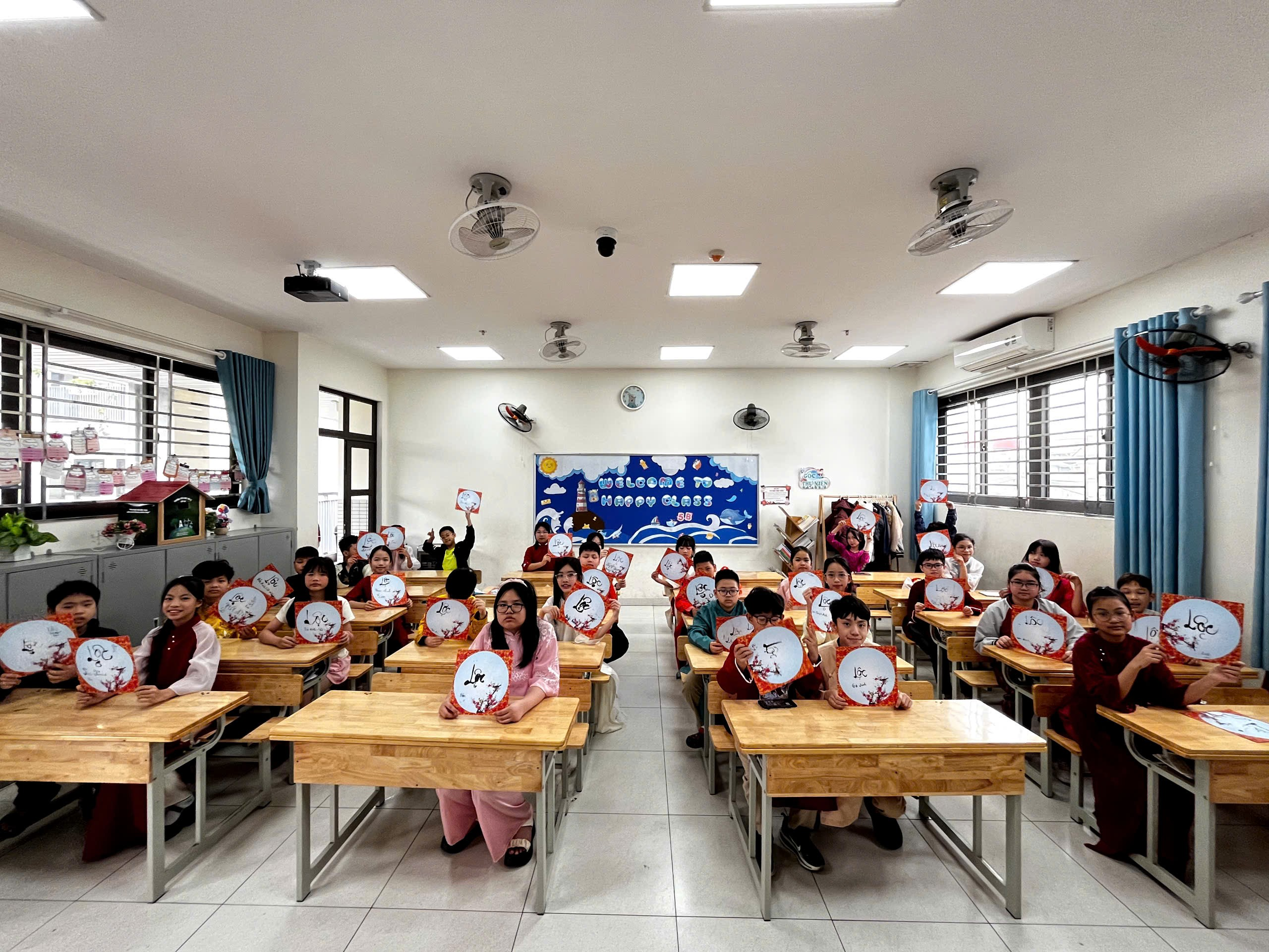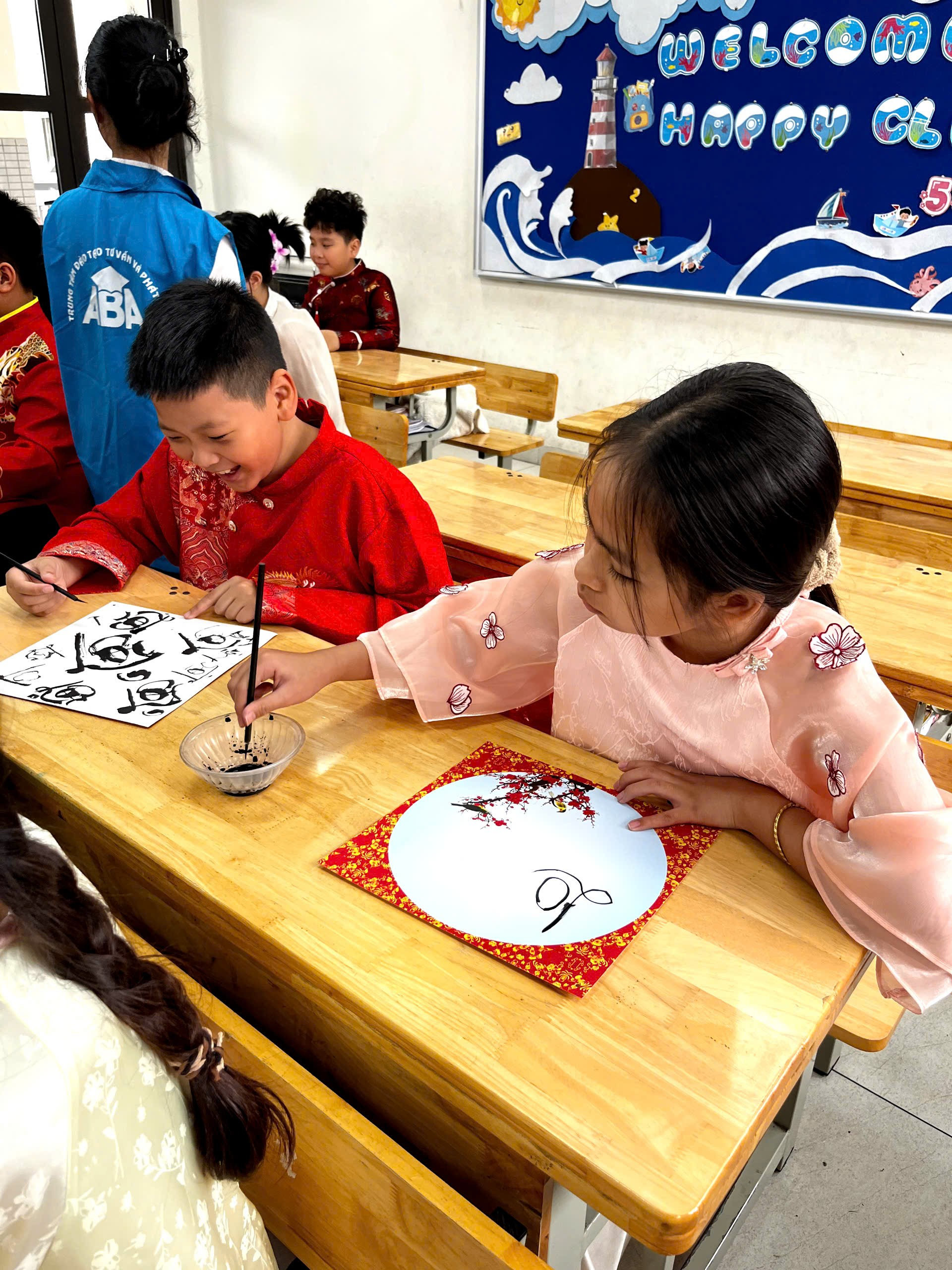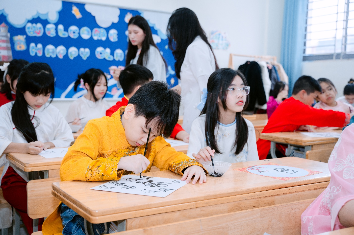 Ngay sau đó, các em trở về lớp để tham gia hoạt động viết chữ pháp đầu xuân. Từng nét bút mềm mại, cẩn thận hiện lên trên trang giấy trắng như gửi gắm những lời chúc tốt đẹp cho một năm mới bình an và may mắn. Không gian lớp học lúc này trở nên thật yên tĩnh, các bạn ai cũng chăm chú, nâng niu từng nét chữ như đang lưu giữ một nét đẹp truyền thống của ngày Tết.