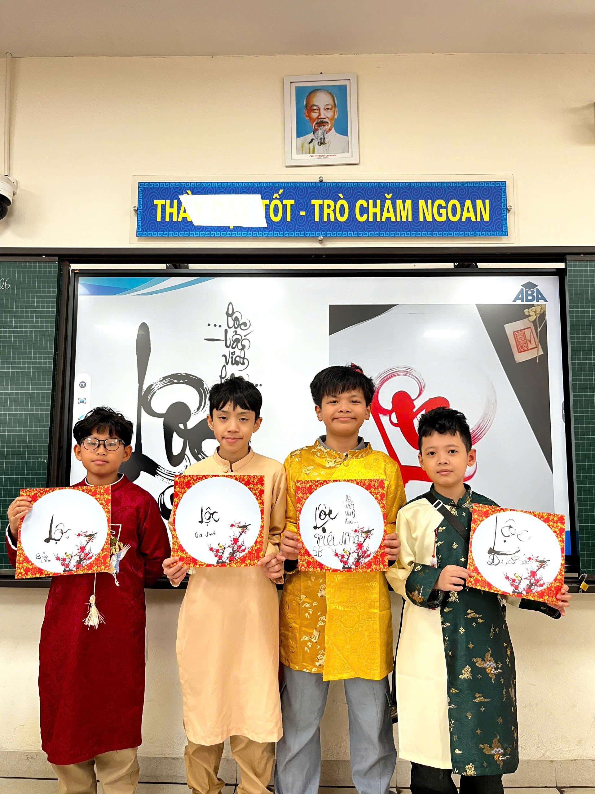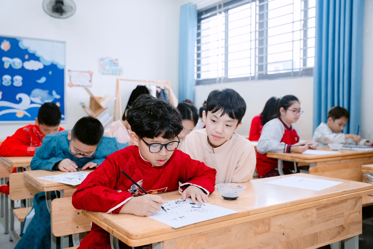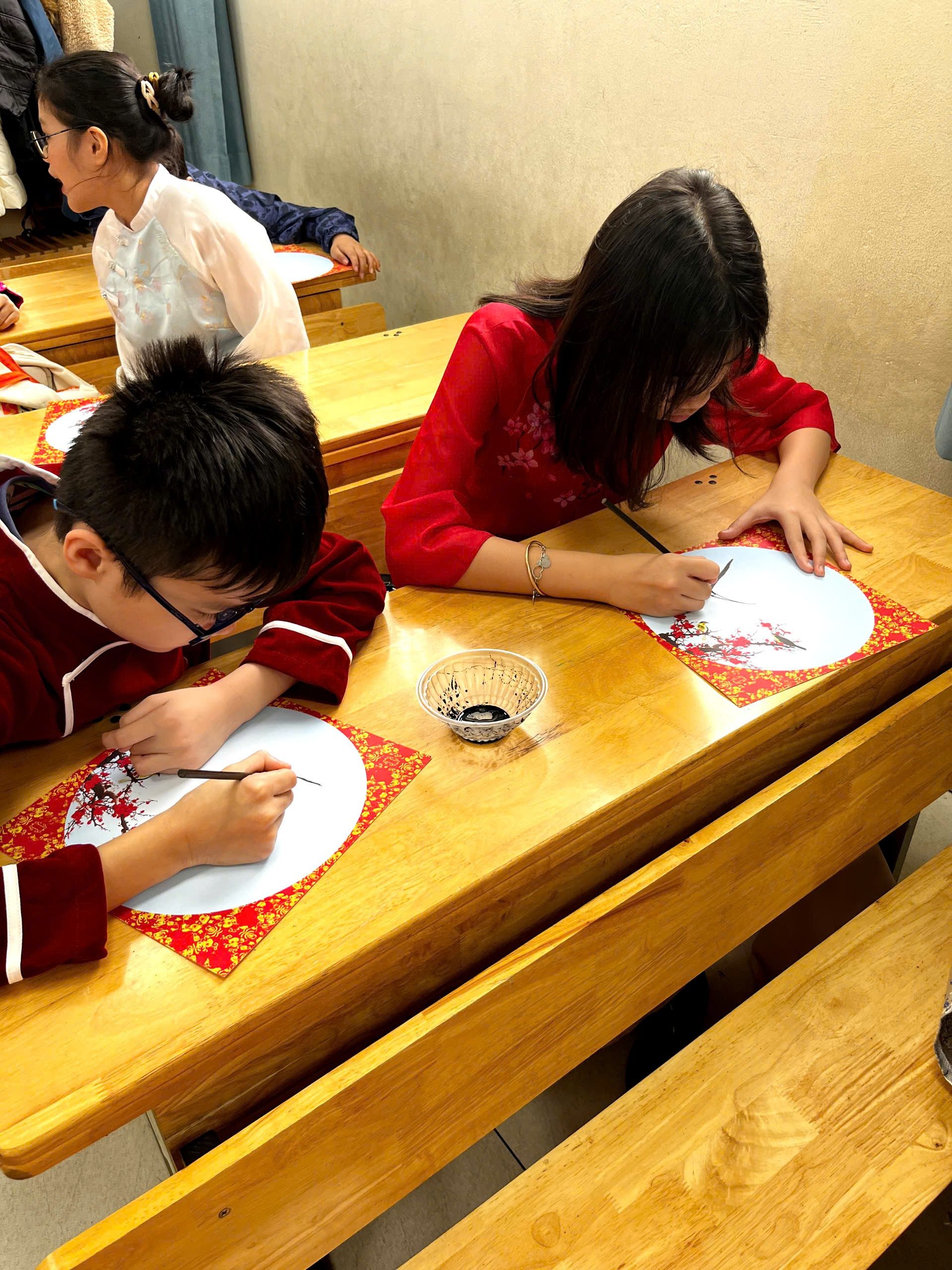 Ngay sau đó, các em trở về lớp để tham gia hoạt động viết chữ pháp đầu xuân. Từng nét bút mềm mại, cẩn thận hiện lên trên trang giấy trắng như gửi gắm những lời chúc tốt đẹp cho một năm mới bình an và may mắn. Không gian lớp học lúc này trở nên thật yên tĩnh, các bạn ai cũng chăm chú, nâng niu từng nét chữ như đang lưu giữ một nét đẹp truyền thống của ngày Tết.