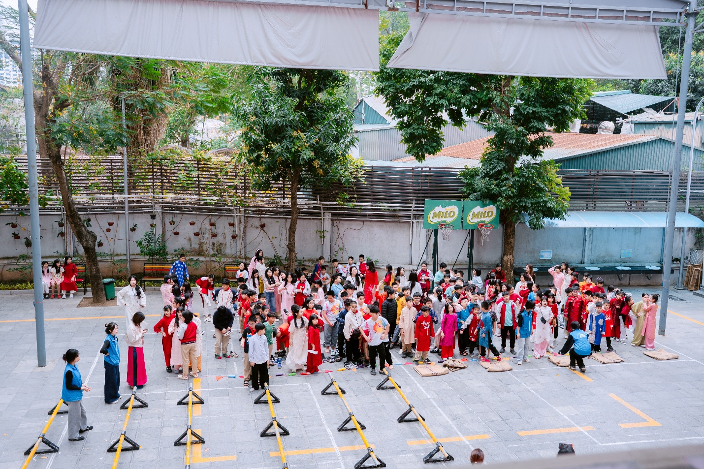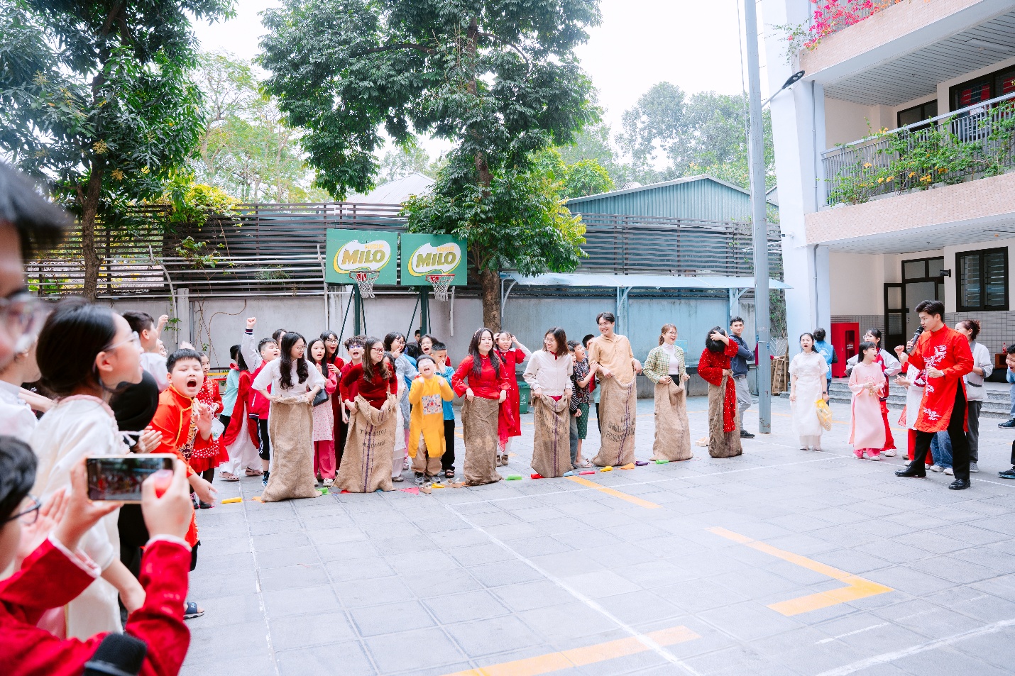 Rời khỏi lớp học, các em nhanh chóng hòa mình vào không khí náo nhiệt tại sân trường với những trò chơi vận động đầy tiếng cười như nhảy bao bố và đi cầu khỉ. Tiếng hò reo cổ vũ vang lên khắp nơi khi các đội thi hết mình. Có bạn nhảy thật nhanh về đích, có bạn loạng choạng nhưng vẫn cố gắng giữ thăng bằng trên cầu khỉ, tất cả tạo nên những khoảnh khắc vừa hồi hộp vừa vui nhộn.