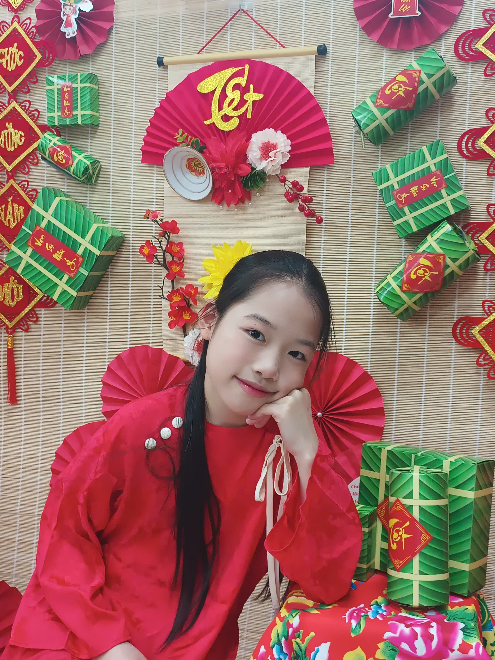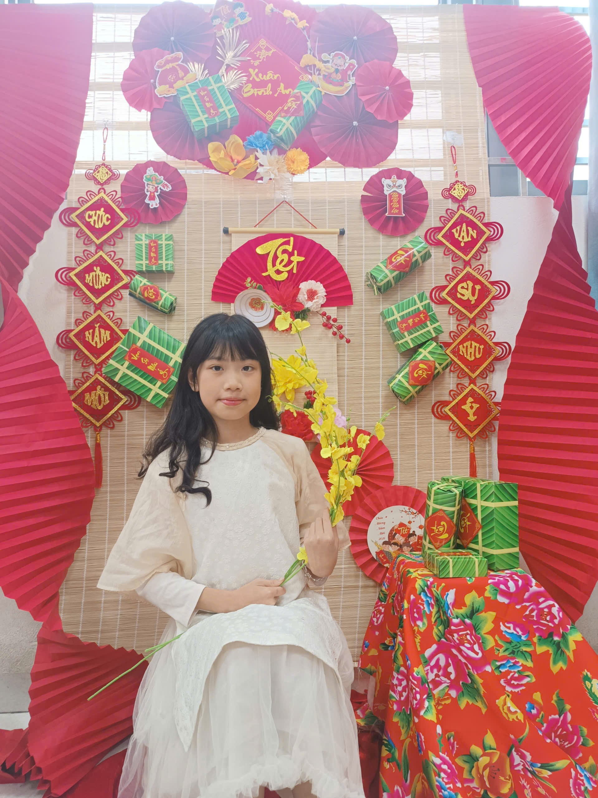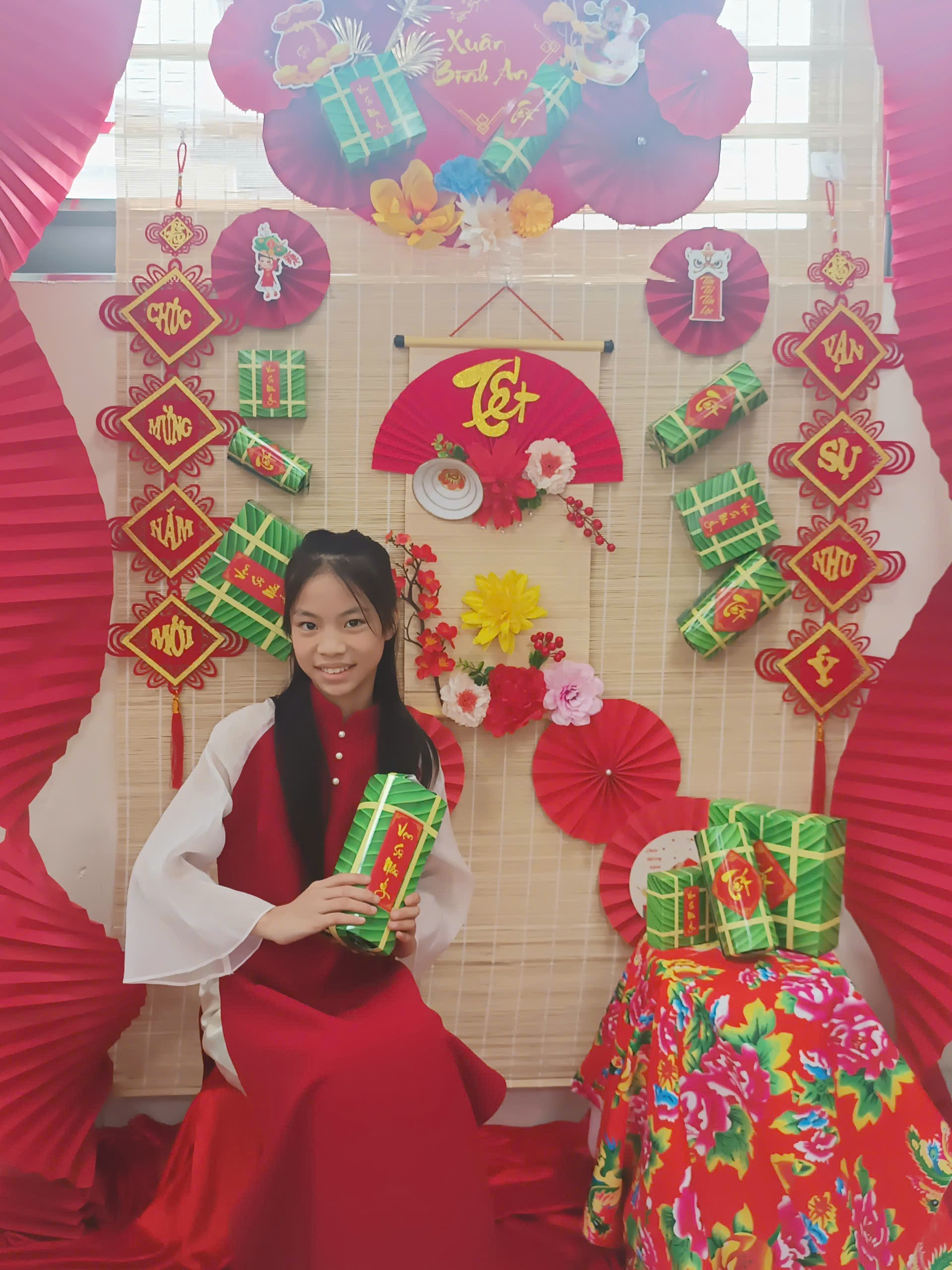 Trong không khí rộn ràng của Tết Bính Ngọ 2026, lớp học 5B như khoác lên mình chiếc áo mới rực rỡ sắc xuân. Không gian được trang trí nổi bật với gam màu đỏ, vàng đặc trưng của ngày Tết; những chiếc quạt giấy xinh xắn, cành hoa tươi thắm, câu đối đỏ, bánh chưng xanh cùng nhiều sản phẩm do chính các em học sinh khéo léo thực hiện. Tất cả hòa quyện tạo nên một góc xuân ấm áp, sinh động, vừa là nơi trưng bày đầy tự hào, vừa là “background” chụp ảnh Tết thật ý nghĩa.
