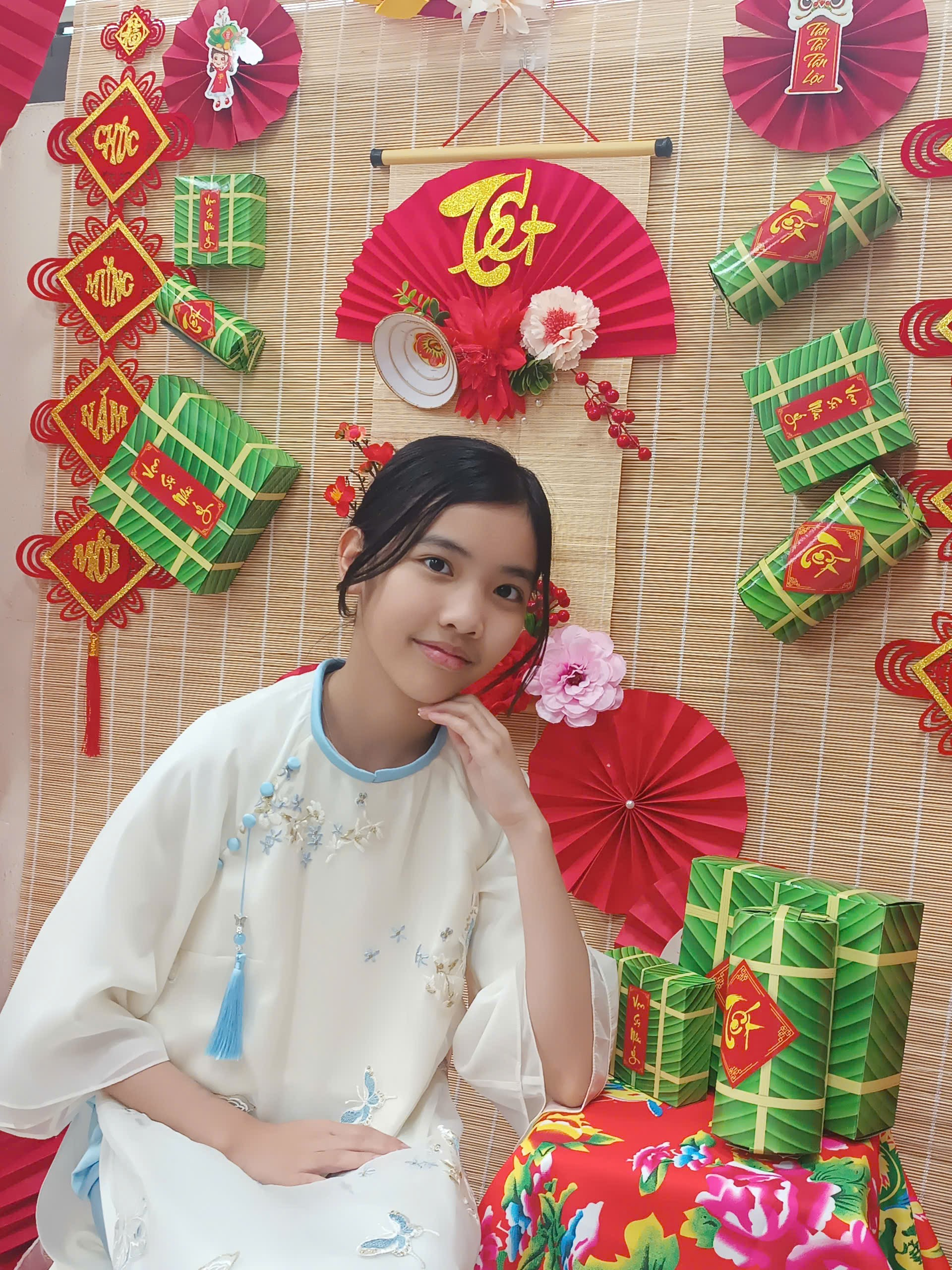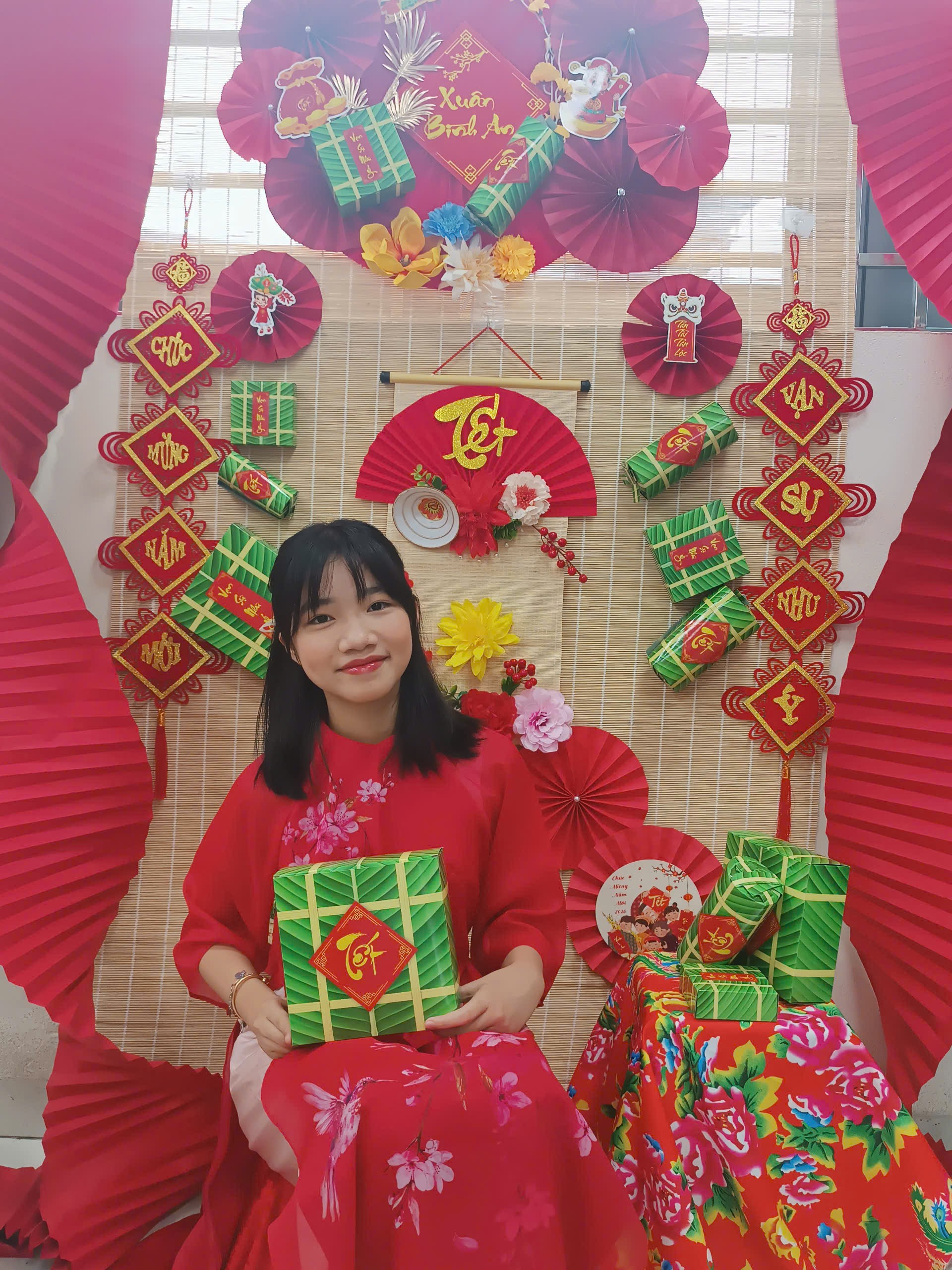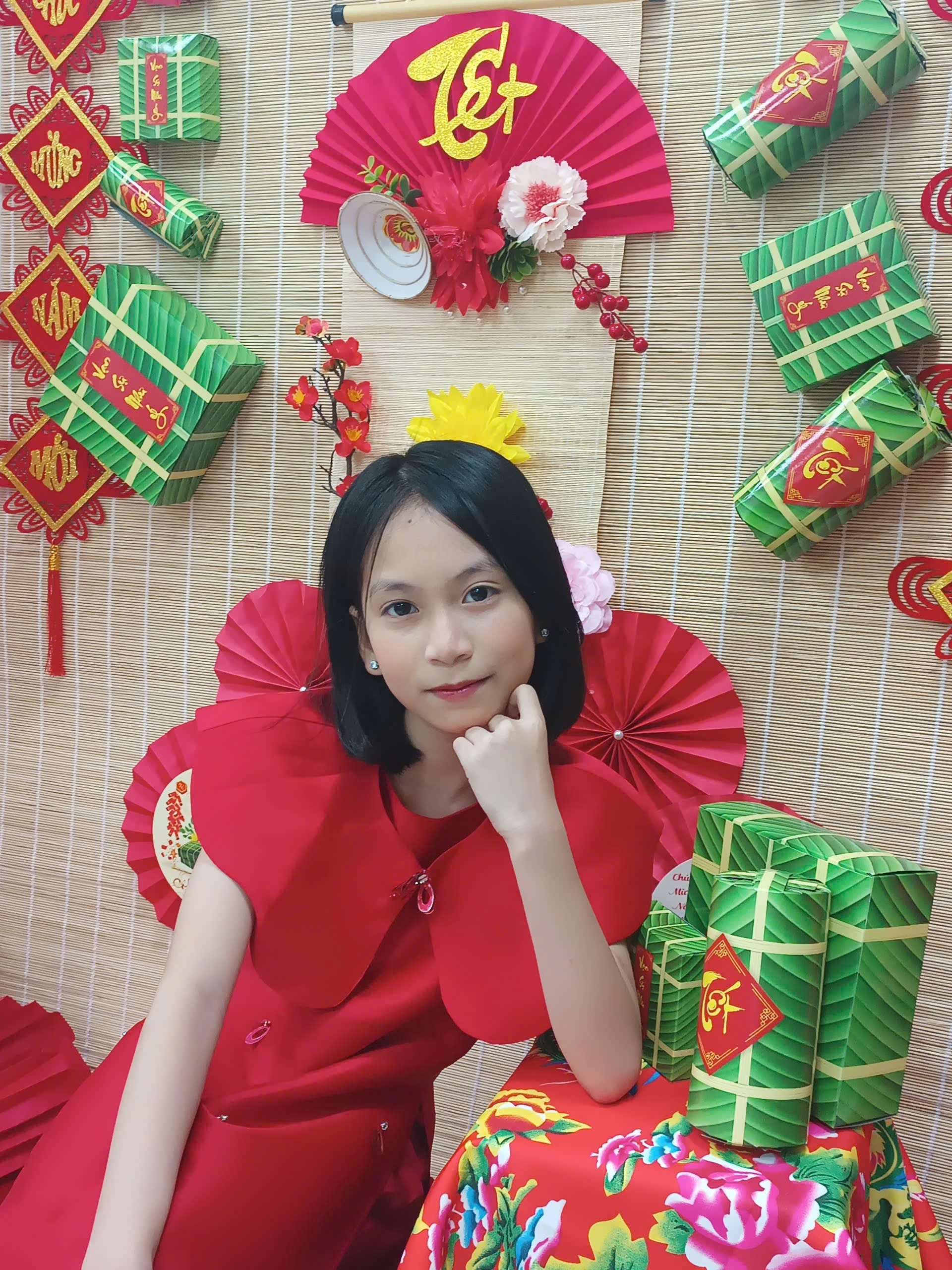 Trong không khí rộn ràng của Tết Bính Ngọ 2026, lớp học 5B như khoác lên mình chiếc áo mới rực rỡ sắc xuân. Không gian được trang trí nổi bật với gam màu đỏ, vàng đặc trưng của ngày Tết; những chiếc quạt giấy xinh xắn, cành hoa tươi thắm, câu đối đỏ, bánh chưng xanh cùng nhiều sản phẩm do chính các em học sinh khéo léo thực hiện. Tất cả hòa quyện tạo nên một góc xuân ấm áp, sinh động, vừa là nơi trưng bày đầy tự hào, vừa là “background” chụp ảnh Tết thật ý nghĩa.