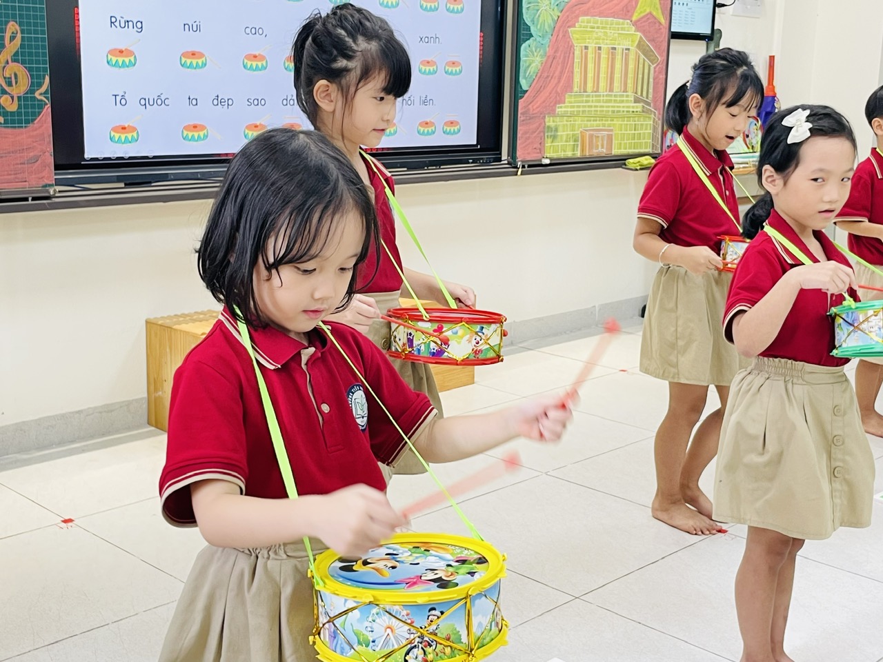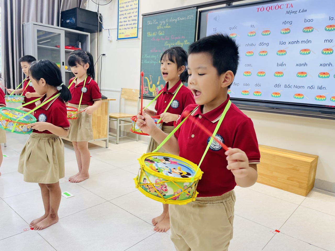 Đặc biệt, các em còn được làm quen với nhạc cụ Trống con – một hoạt động được các bạn nhỏ vô cùng thích thú và hào hứng tìm hiểu. Cô giáo đã hướng dẫn học sinh quan sát, tìm hiểu cấu tạo, cách sử dụng trống và thực hành gõ đệm theo bài hát. Âm thanh rộn ràng xen lẫn lời ca tươi vui đã mang lại một không khí lớp học đầy năng lượng, sáng tạo.
