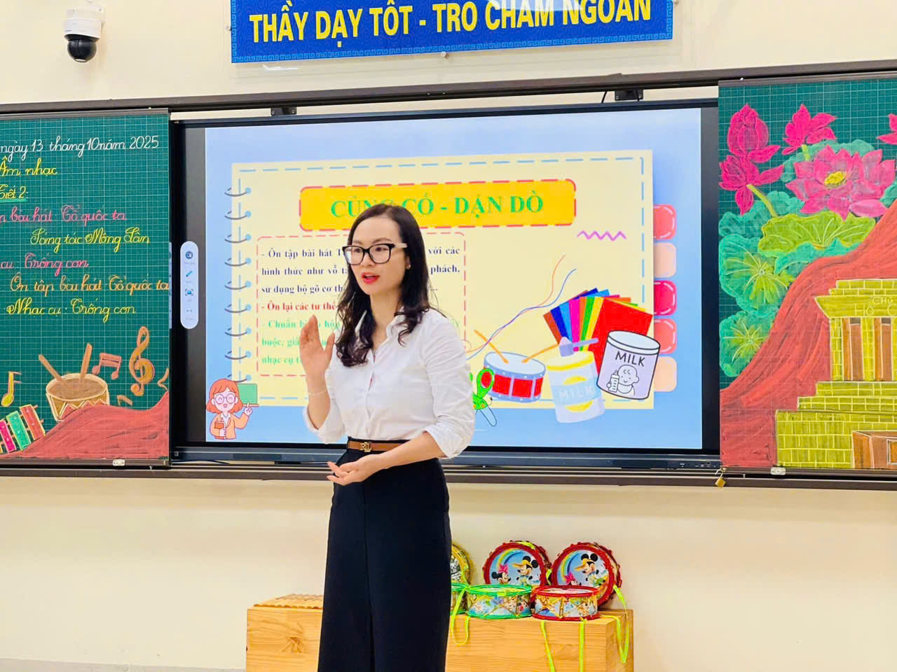 Thực hiện nhiệm vụ năm học 2025 – 2026, với mục đích nhằm nâng cao chất lượng dạy và học, ngày 13/10/2025, cô giáo Nguyễn Thị Dậu – giáo viên Âm nhạc đã tổ chức thành công tiết Chuyên đề môn Âm nhạc với bài học thuộc chủ đề 2, tiết 2: Ôn tập bài hát “Tổ quốc ta”; làm quen với nhạc cụ Trống con.