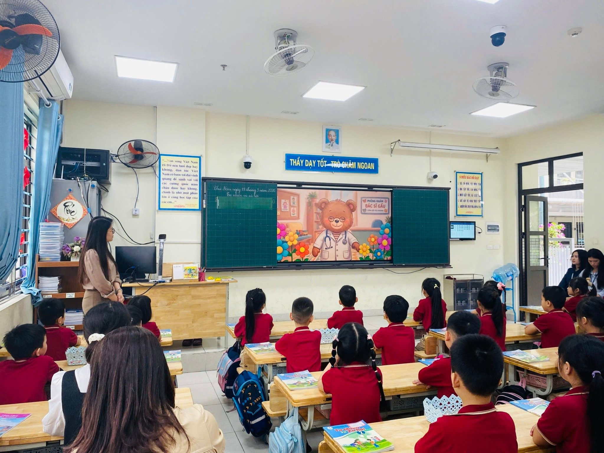 Điểm nhấn đặc biệt của tiết học là sự đồng hành của nhân vật “bác sĩ gấu” – người bạn dễ thương đã cùng các em hát, vận động và lan tỏa thông điệp bảo vệ sức khỏe một cách tự nhiên, vui nhộn. Những giai điệu rộn ràng cùng các động tác minh họa giúp không khí lớp học luôn tràn đầy năng lượng tích cực.