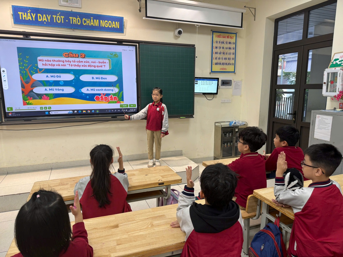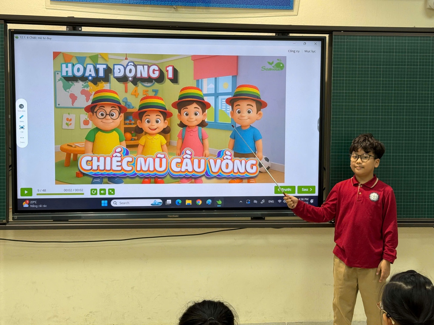 Những câu hỏi tương tác sôi nổi khiến lớp học trở thành một sân chơi trí tuệ đầy bất ngờ và tiếng cười. Đặc biệt, trò chơi “Nhìn hình đoán mũ” đã giúp các bạn thể hiện phản xạ nhanh, tư duy linh hoạt và tinh thần đoàn kết.