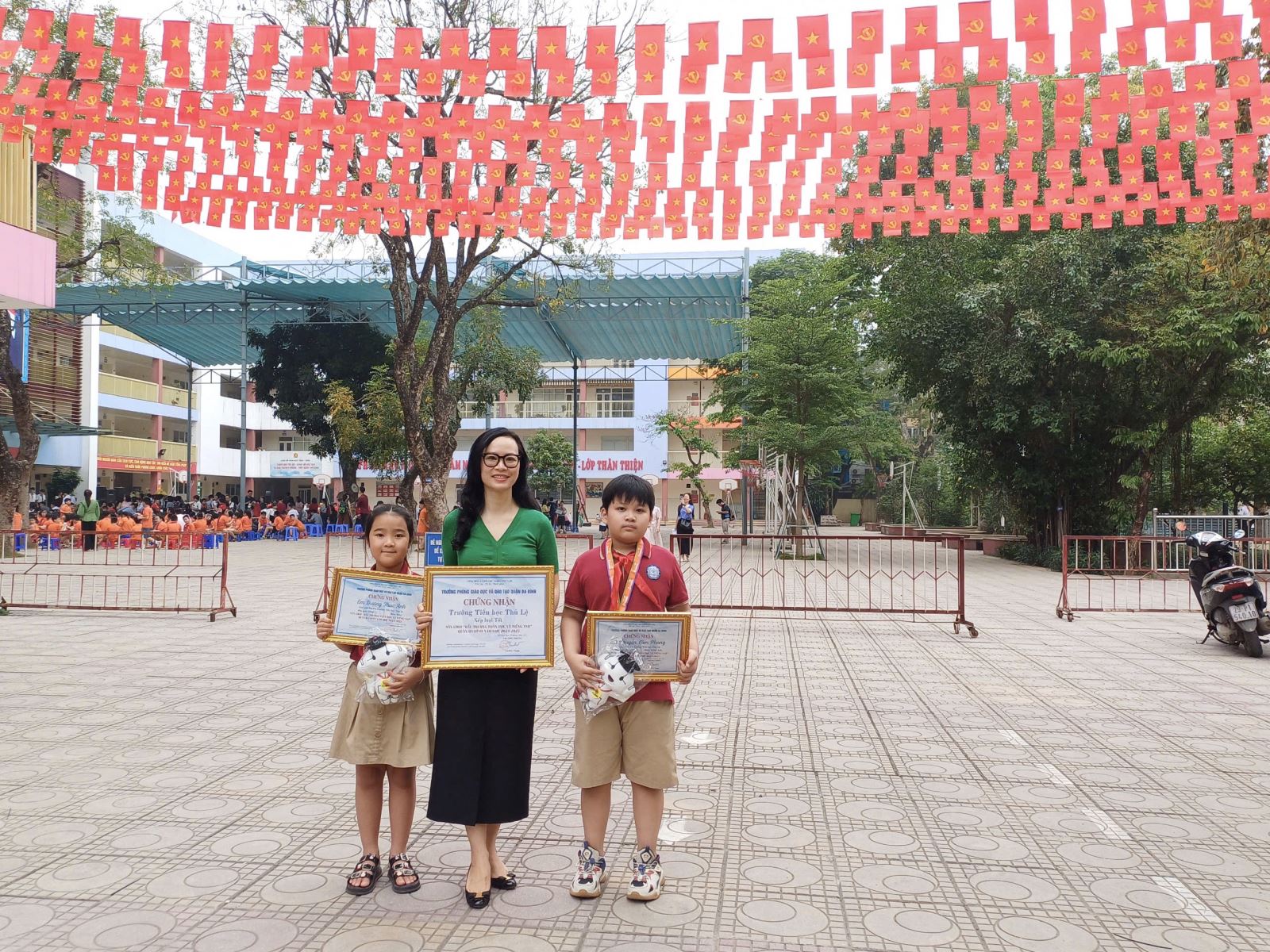 Cô giáo Nguyễn Ngọc Anh - Phó Bí thư Chi bộ, Phó Hiệu trưởng nhà trường cùng em Nguyễn Lâm Phong - Lớp 4D và em Dương Thục Anh - Lớp 3A tham dự lễ trao giải.