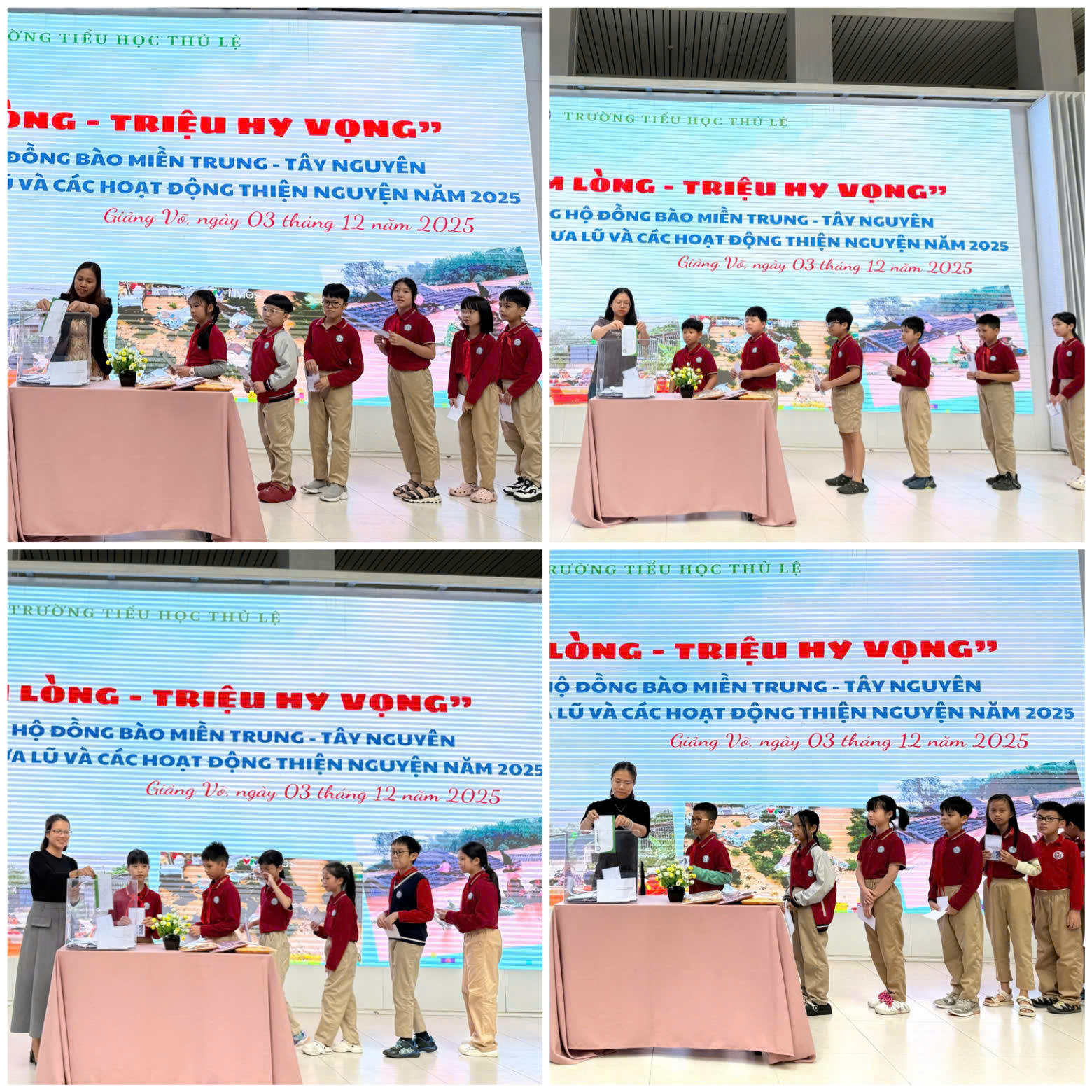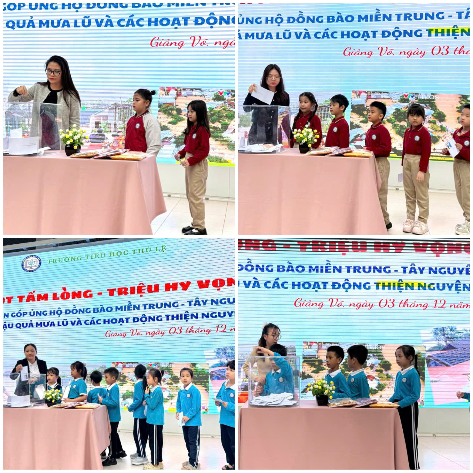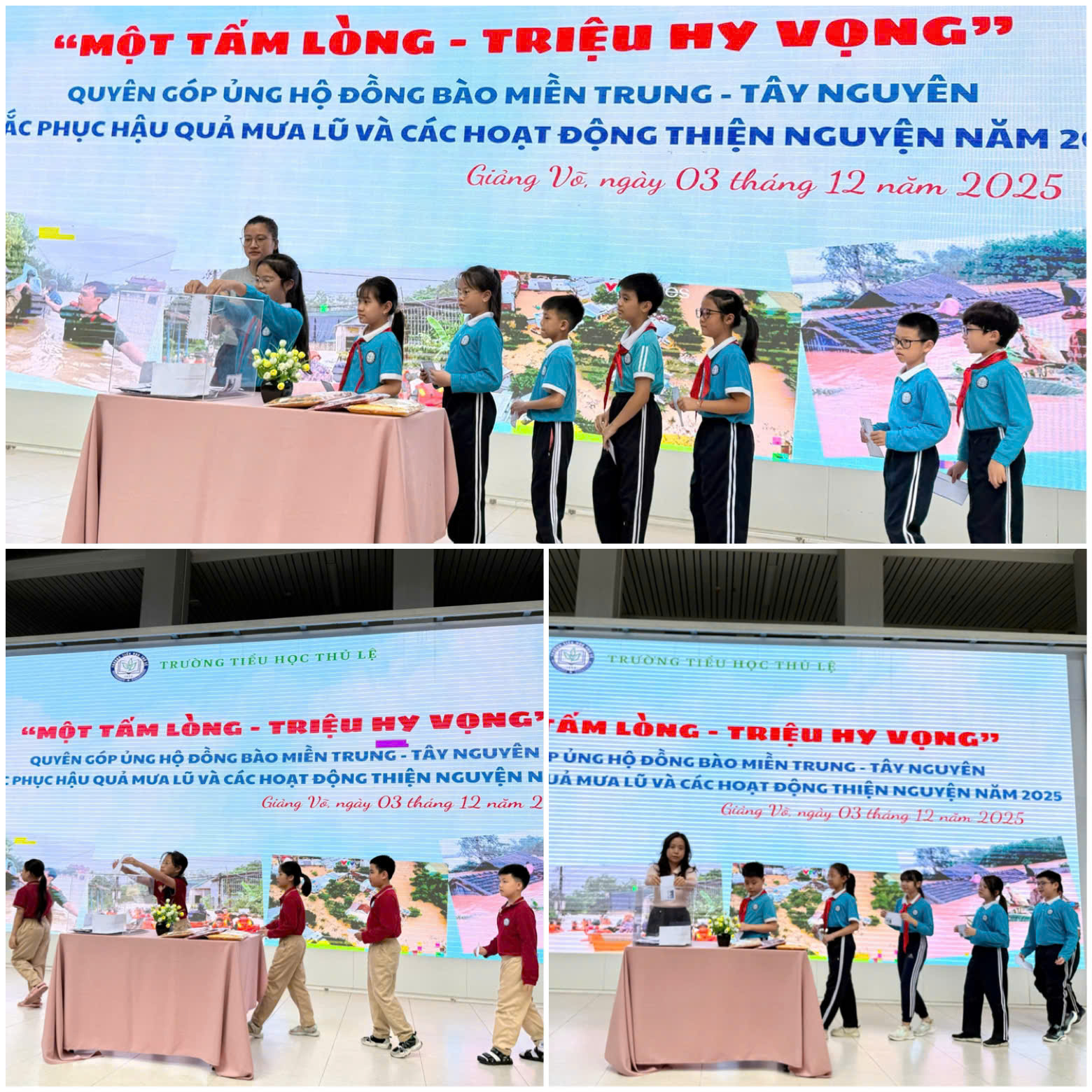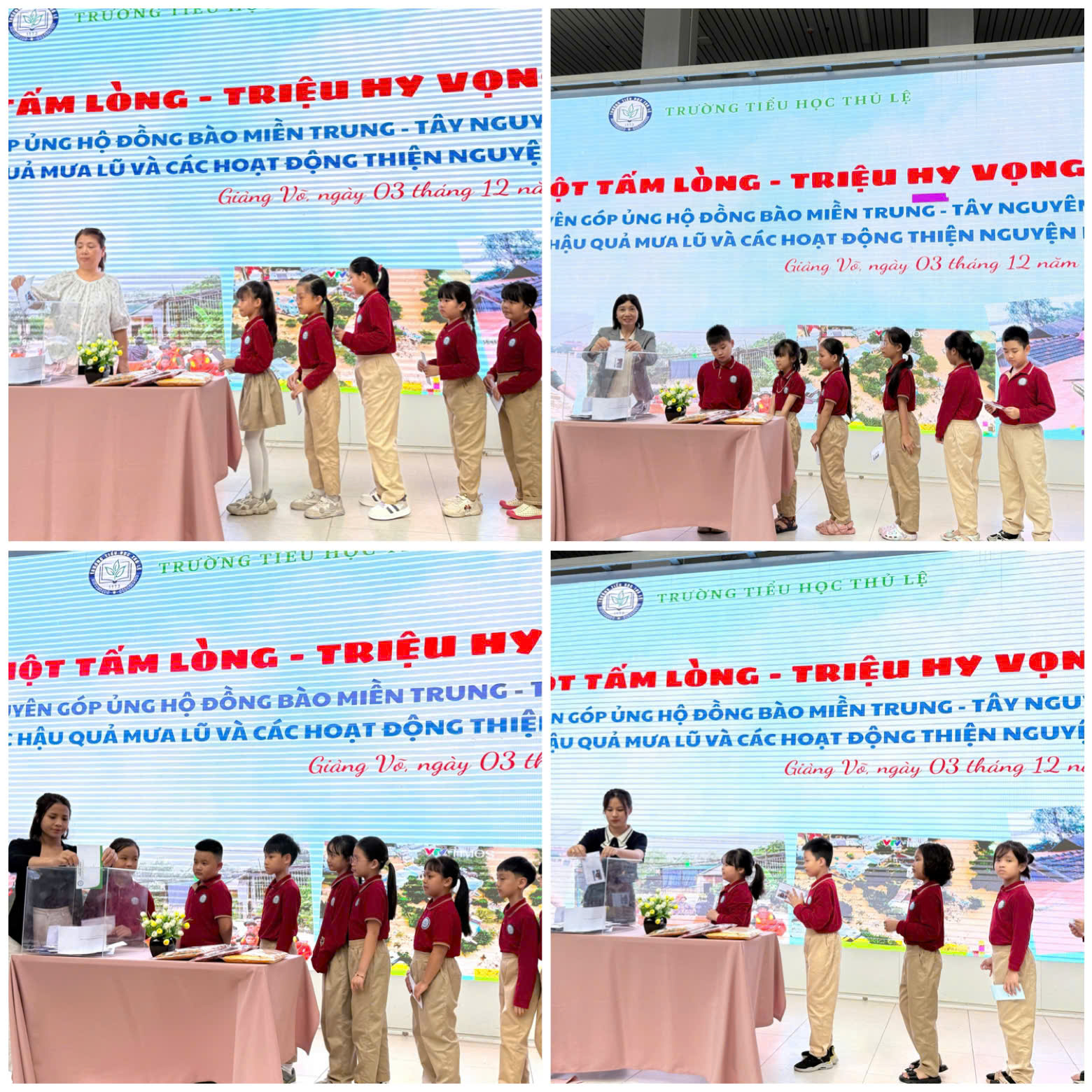 Tại sân trường, các lớp lần lượt tham gia ủng hộ trong không khí ấm áp và chân tình. Mỗi món quà, mỗi phong bì ủng hộ đều là sự sẻ chia, là tấm lòng yêu thương mà thầy cô, phụ huynh và các em học sinh muốn gửi đến bà con vùng lũ. Chương trình đã nhận được sự hưởng ứng tích cực từ tập thể cán bộ, giáo viên, nhân viên, phụ huynh và các em học sinh, thể hiện rõ tinh thần tương thân tương ái của trường Tiểu học Thủ Lệ.