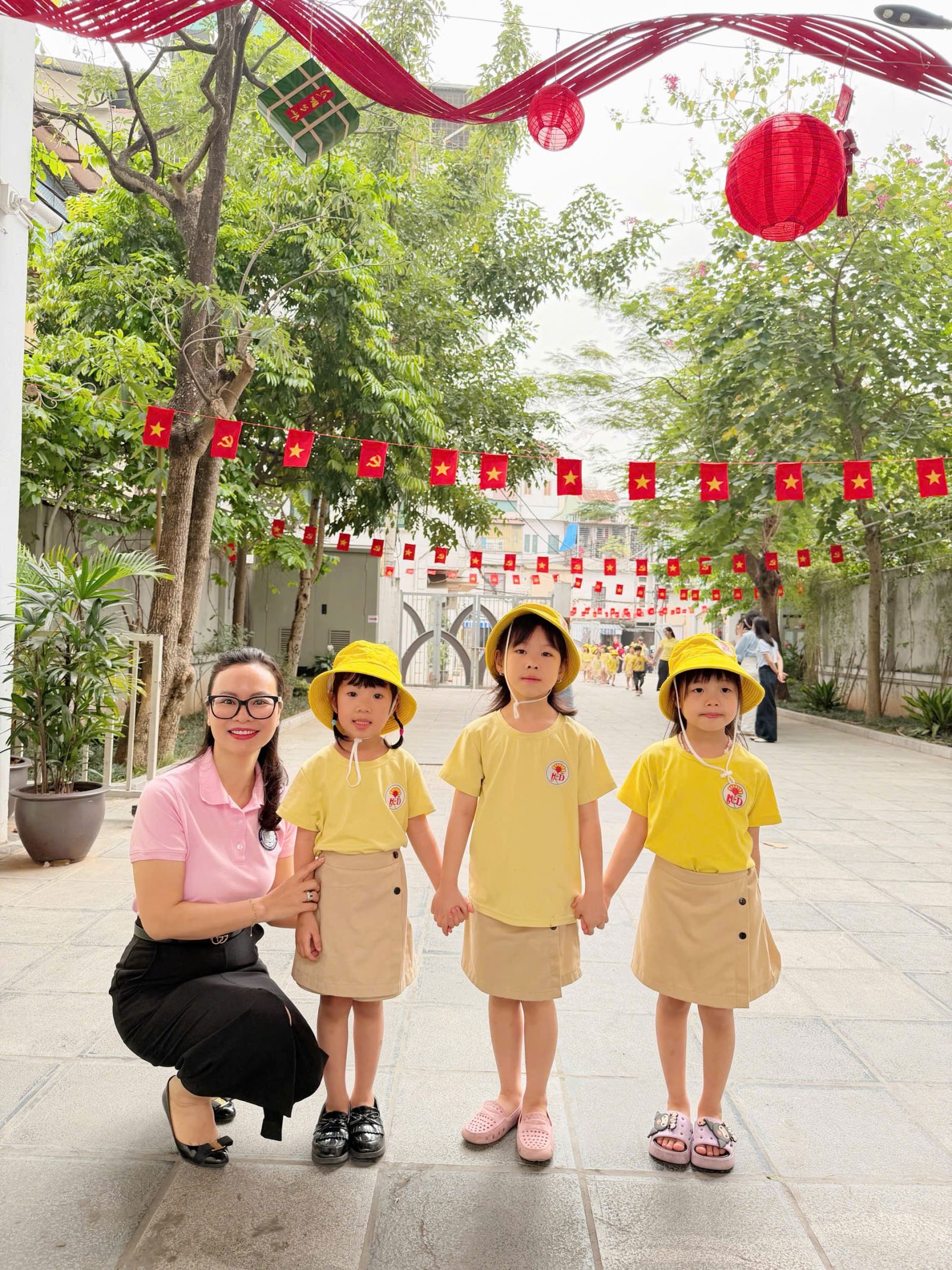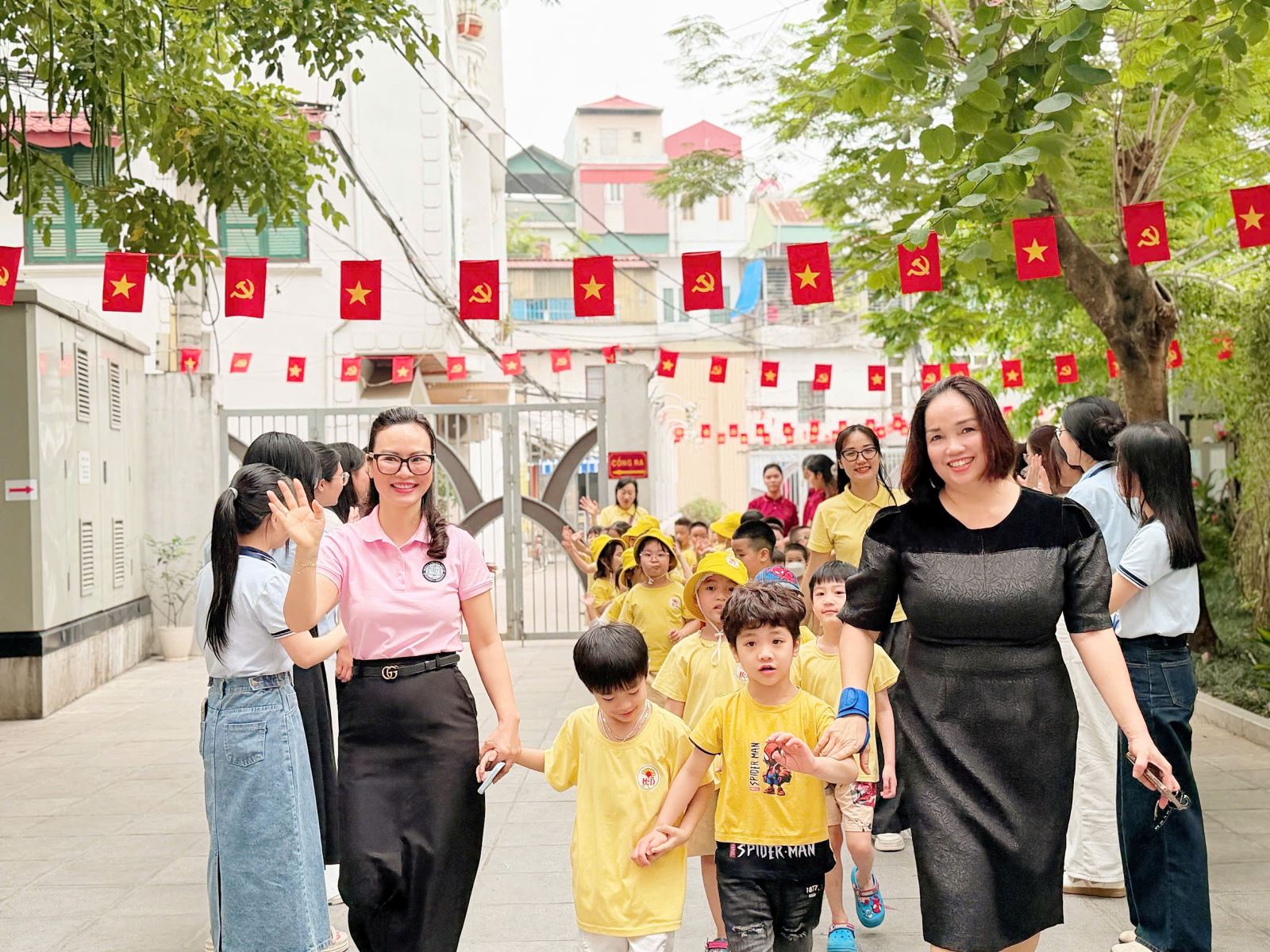 Cô giáo Nguyễn Ngọc Anh - Bí thư Chi bộ, Hiệu trưởng nhà trường cùng các cô giáo hân hoan đón chào các cô giáo và các bé trường mầm non Hoa Hướng Dương.