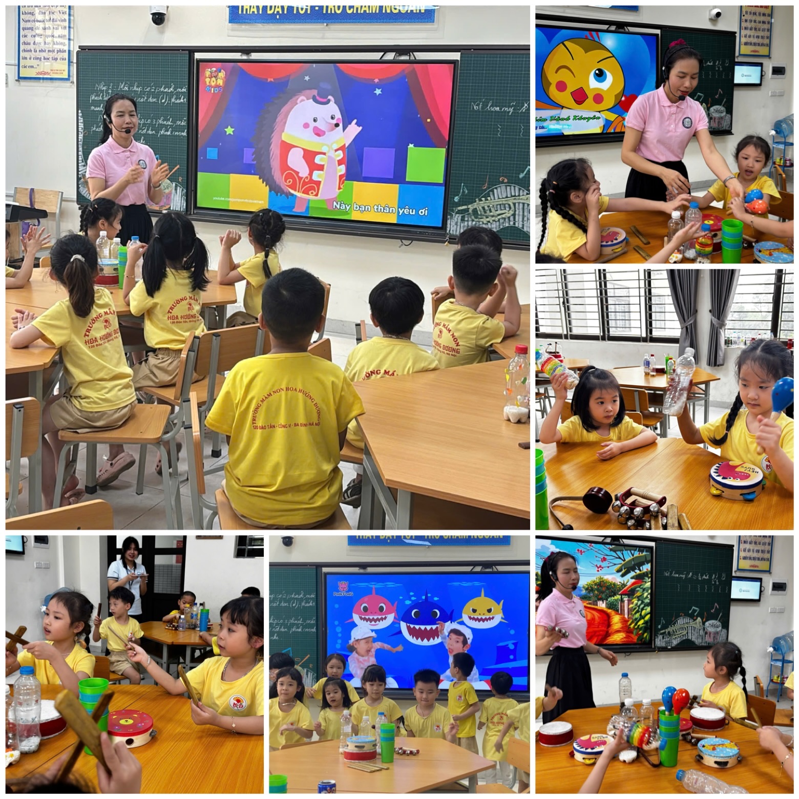 Tự tin thể hiện tài năng ca hát tại phòng Âm nhạc cùng các nhạc cụ bộ gõ.