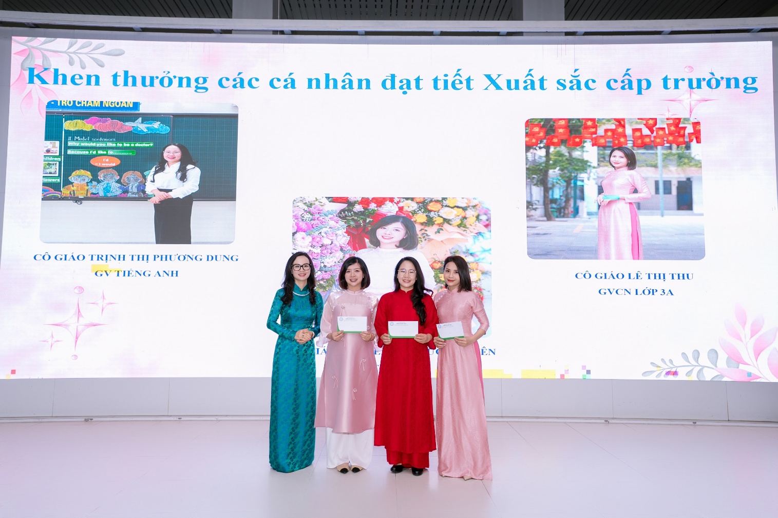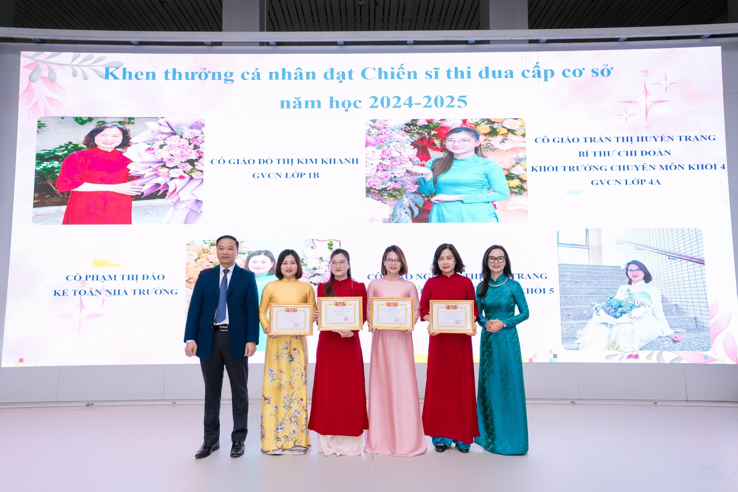 Tại buổi lễ, để ghi nhận những nỗ lực và những đóng góp xứng đáng của các tập thể, các cá nhân vào thành tích chung của nhà trường, ghi nhận những kết quả chất lượng dạy học và giáo dục của các thầy cô trong nhà trường, cô giáo Đoàn Hồng Vân – Trưởng ban đời sống, tổ trưởng chuyên môn khối 1 đã thay mặt Hội đồng thi đua khen thưởng công bố các Quyết định khen thưởng tập thể, cá nhân xuất sắc trong năm học.