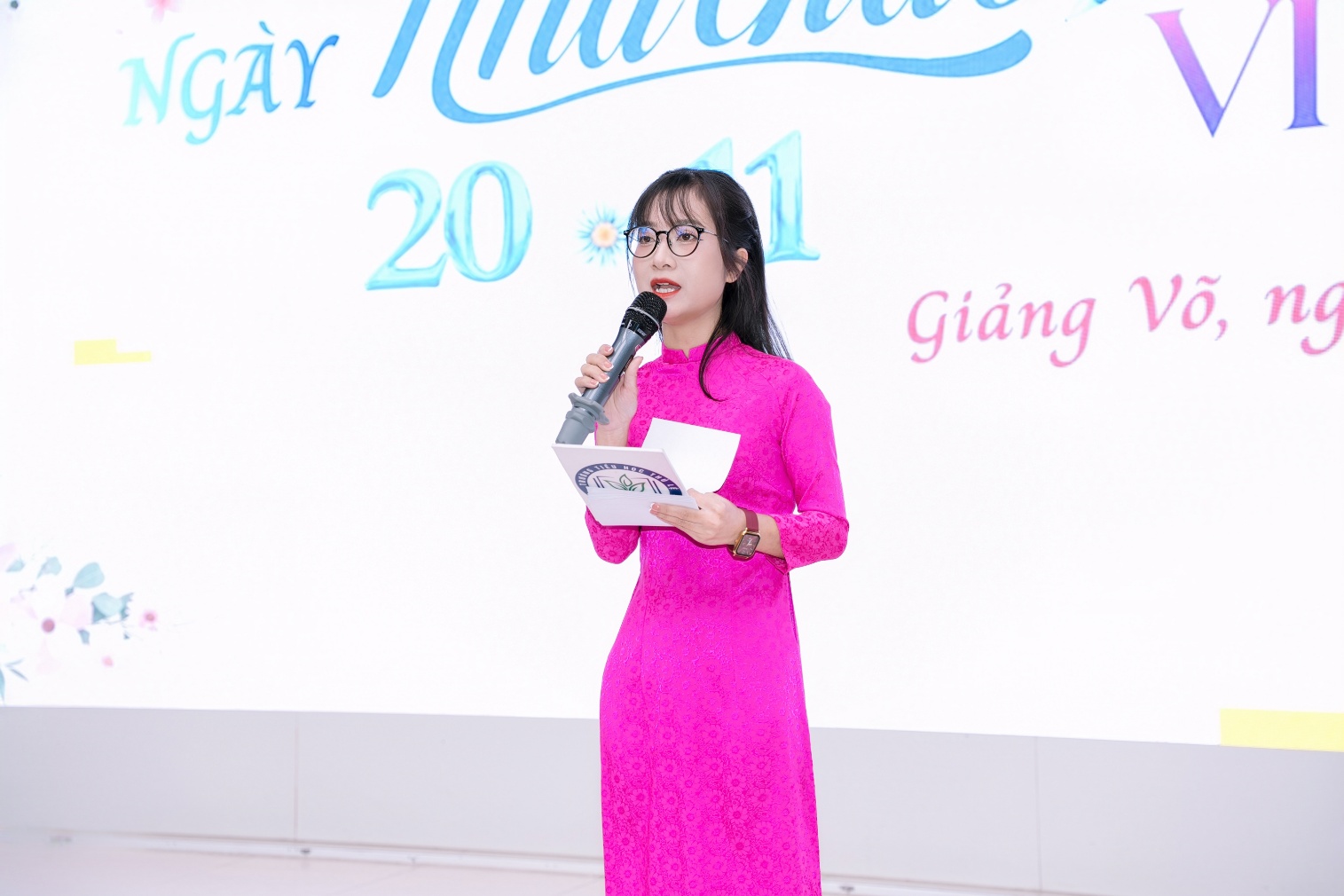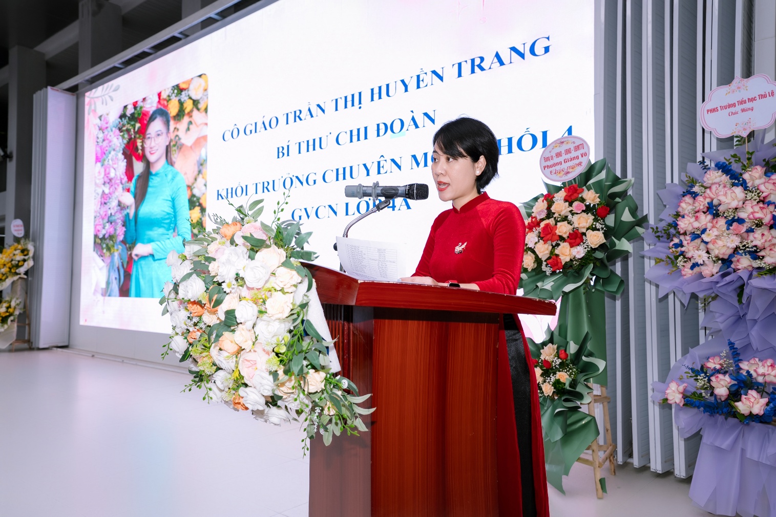 Tiếp theo chương trình Cô giáo Nguyễn Ngọc Anh - Phó Bí thư chi bộ - Phó hiệu trưởng nhà trường lên đọc diễn văn khai mạc lễ kỷ niệm ngày Nhà giáo Việt Nam 20/11.